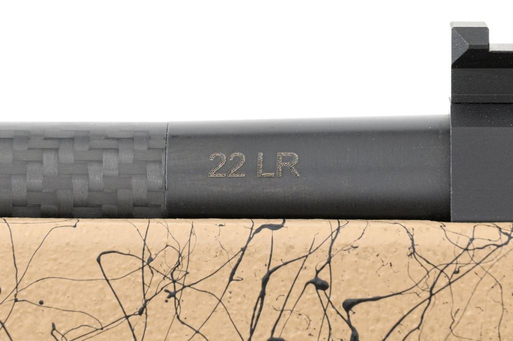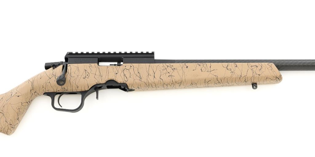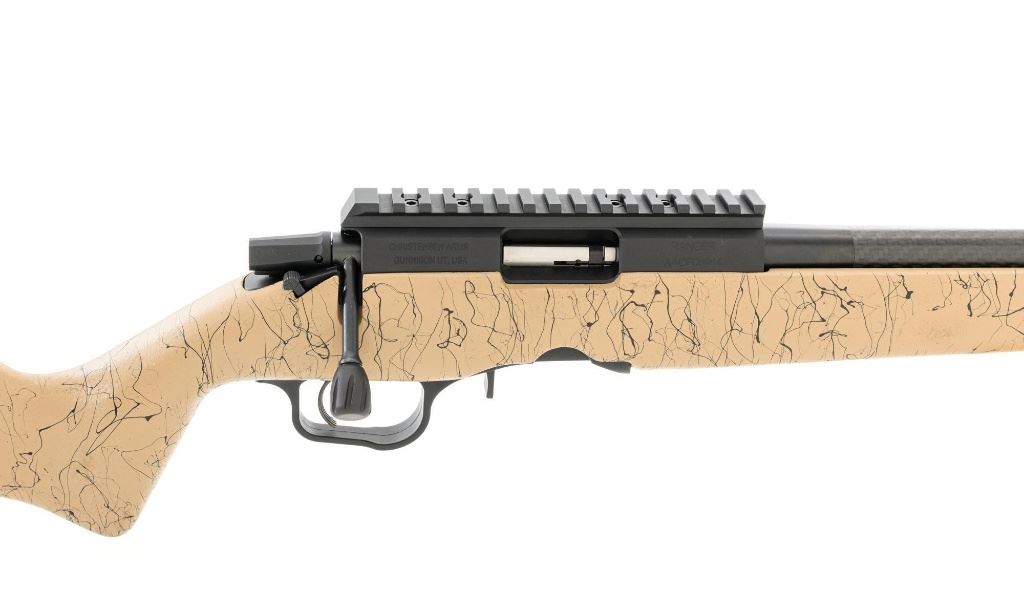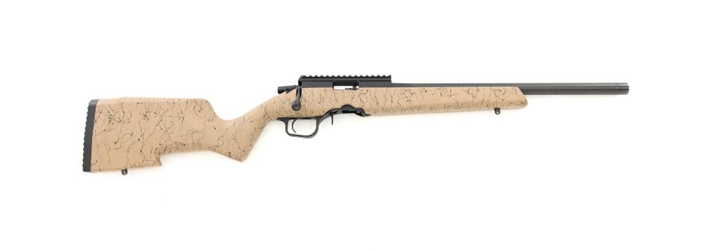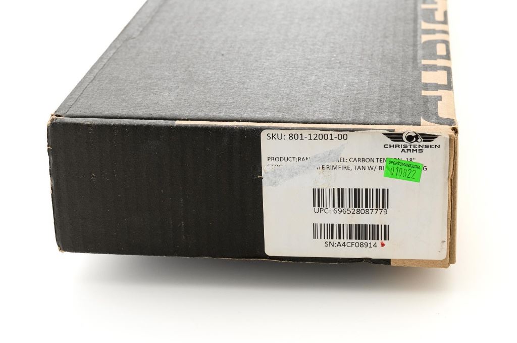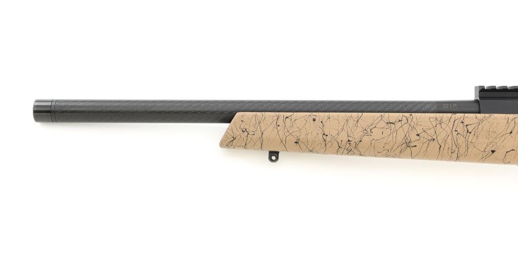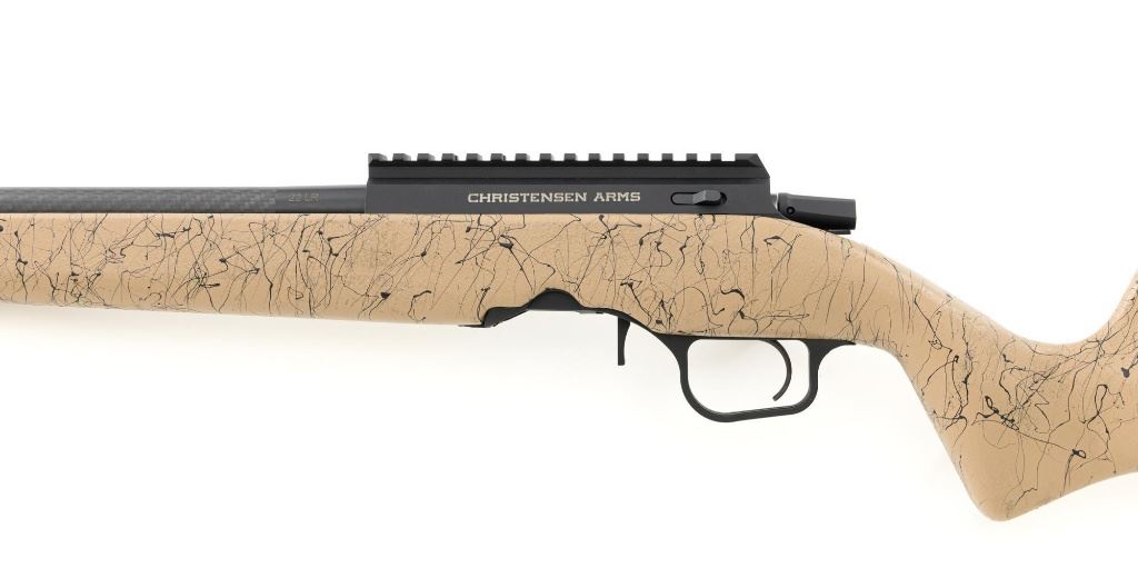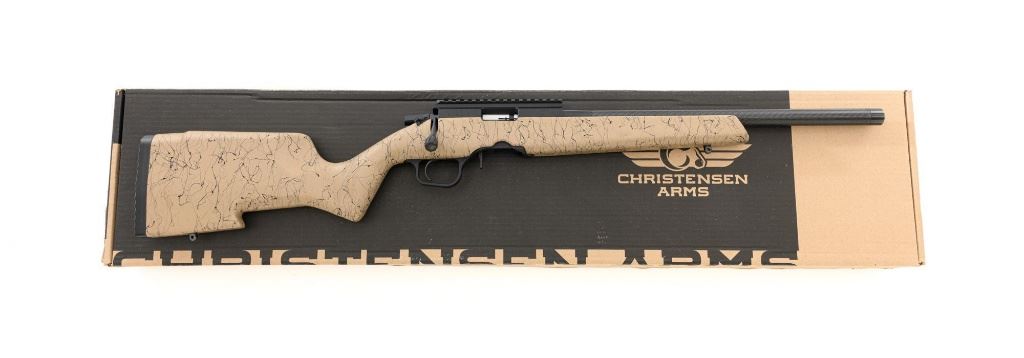 Christensen Arms Ranger Bolt Action Rifle, #A4CF08914, .22 LR cal., 18" carbon fiber barrel with threaded muzzle and cap, with black finish. Textured tan/black carbon fiber one-piece stock with sling swivel studs, palm swell and hook, ending with a ribbed black rubber recoil pad, providing a 14" LOP. Manufactured without sights, features a Picatinny rail, target bolt handle, hand lapped barrel with match chamber, aluminum receiver, and Trigger Tech Remington 700 trigger. Includes one Ruger detachable 10-round rotary magazine, factory cardboard box with matching end label, instruction manual, warranty card, and associated packaging materials. Rifle is as new in the factory box, showing little, if any use. Action is extremely smooth with a crisp trigger. Bore is mirror bright with excellent rifling. Est.: $800-$1,000. (Modern)