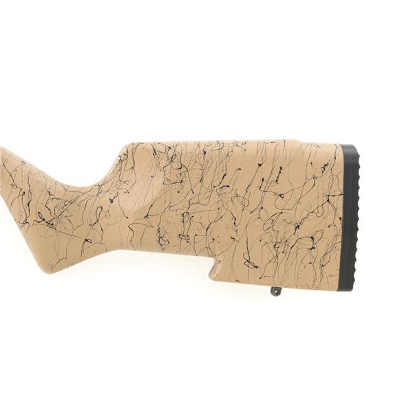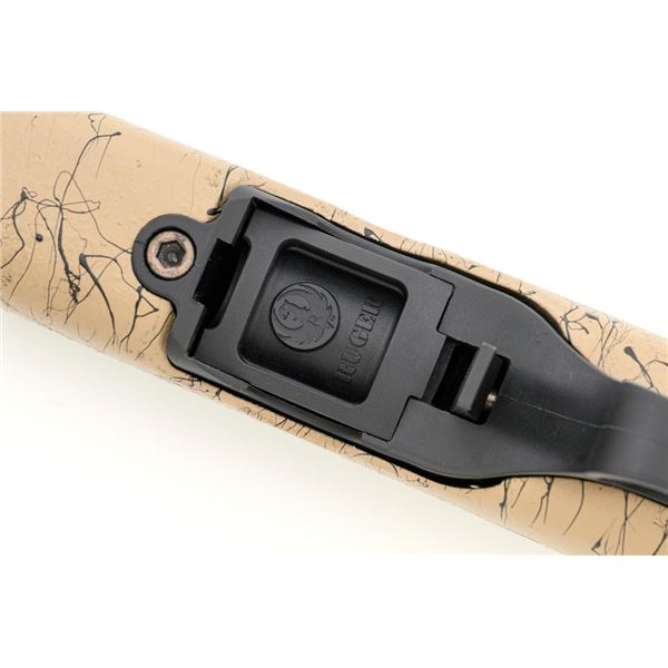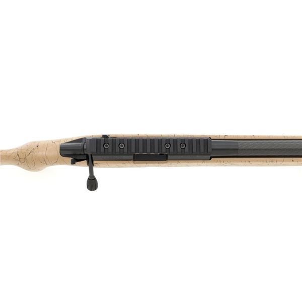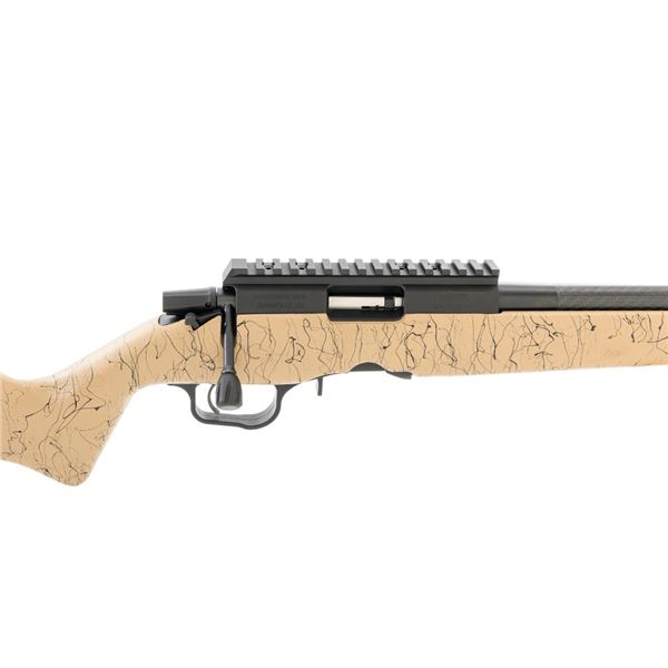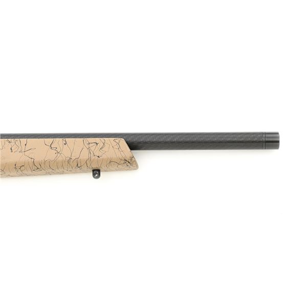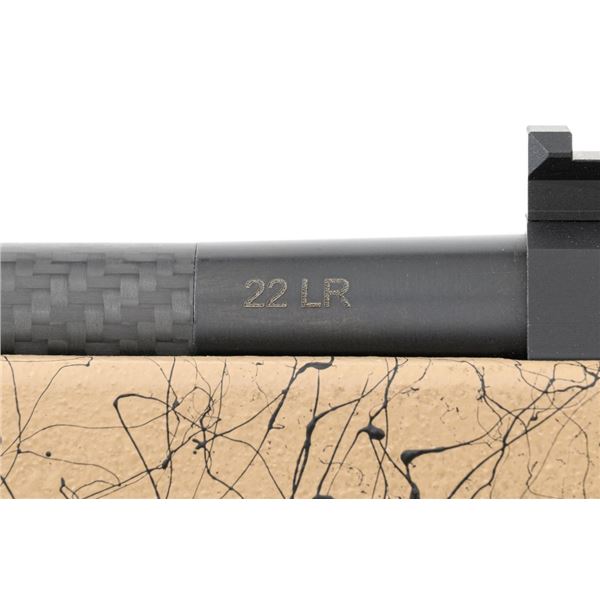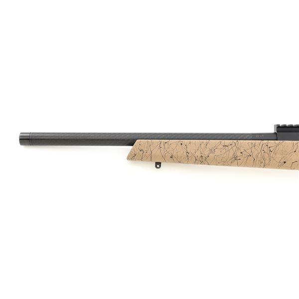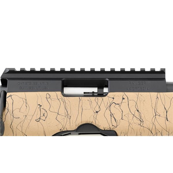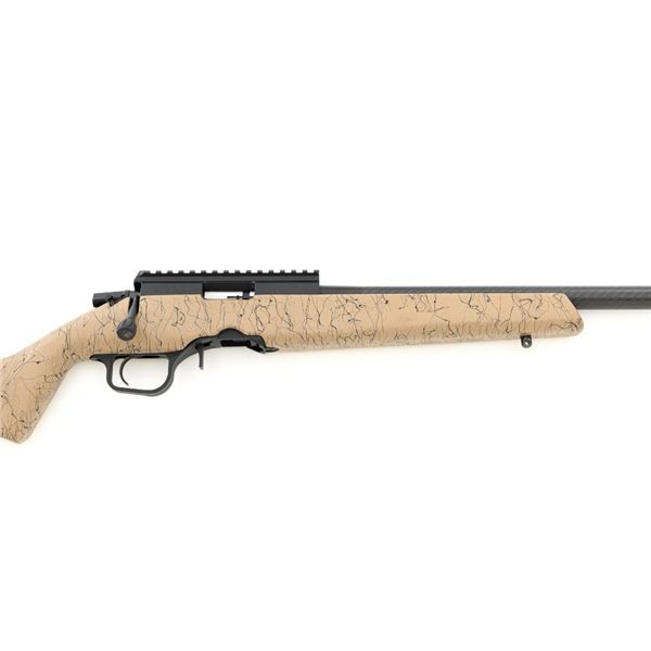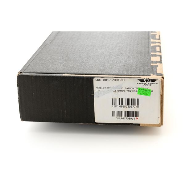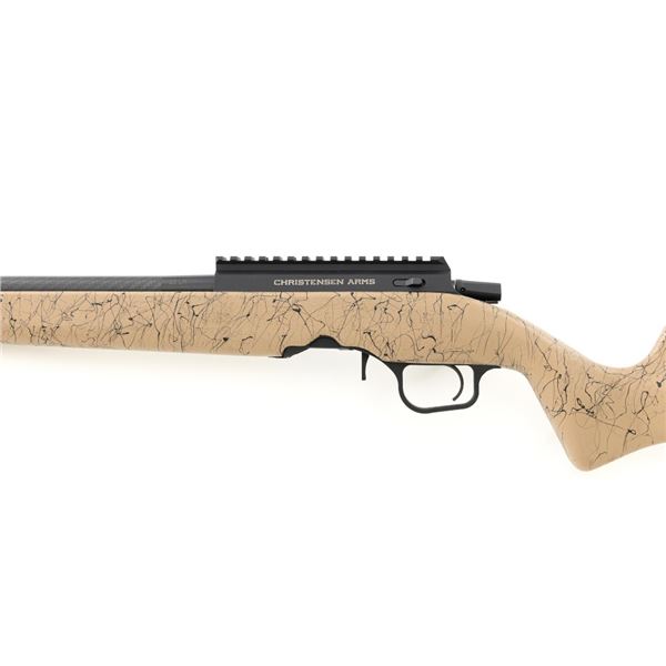 Christensen Arms Ranger Bolt Action Rifle, #A4CF08914, .22 LR cal., 18" carbon fiber barrel with threaded muzzle and cap, with black finish. Textured tan/black carbon fiber one-piece stock with sling swivel studs, palm swell and hook, ending with a ribbed black rubber recoil pad, providing a 14" LOP. Manufactured without sights, features a Picatinny rail, target bolt handle, hand lapped barrel with match chamber, aluminum receiver, and Trigger Tech Remington 700 trigger. Includes one Ruger detachable 10-round rotary magazine, factory cardboard box with matching end label, instruction manual, warranty card, and associated packaging materials. Rifle is as new in the factory box, showing little, if any use. Action is extremely smooth with a crisp trigger. Bore is mirror bright with excellent rifling. Est.: $800-$1,000. (Modern)
