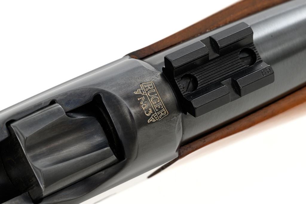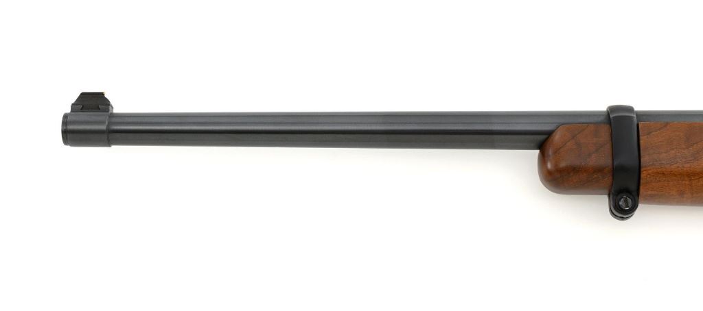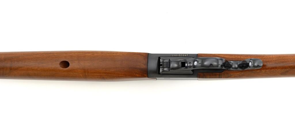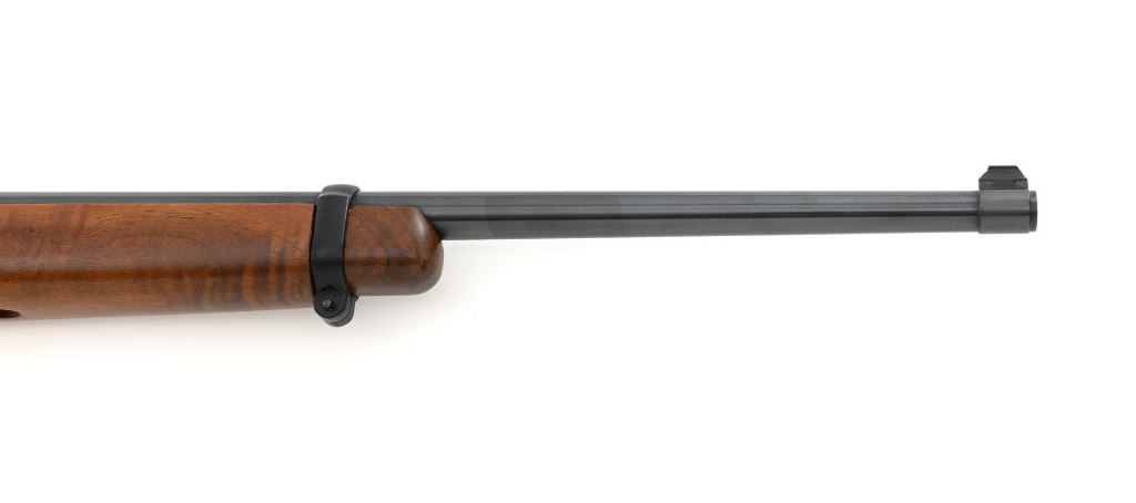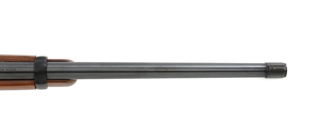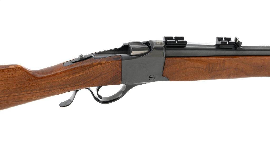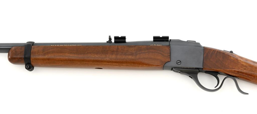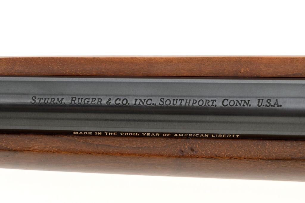 Ruger No.3 Single Shot Carbine, #130-55647, .45-70 cal., 22" barrel, with blue finish. Smooth walnut straight grip stock and forend with barrel band, ending with a smooth black plastic buttplate, providing a 13.5" LOP. Carbine also features a banded brass tipped blade front and standard notched folding rear sight, Weaver two-piece mounts added on the barrel ahead of the receiver, and tang safety. Factory markings are clear, with "MADE IN THE 200TH YEAR OF AMERICAN LIBERTY" on left side of the barrel. Mfgd 1976. Carbine is in excellent overall condition, retaining approx. 99%+ factory finish. Stock is in excellent overall condition, with scattered light indentations, and a slightly deeper ding on top of the comb. Action is crisp and locks up securely. Bore is mirror bright with excellent rifling. Est.: $700-$1,000. (Modern)