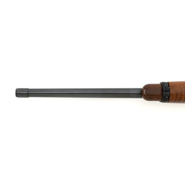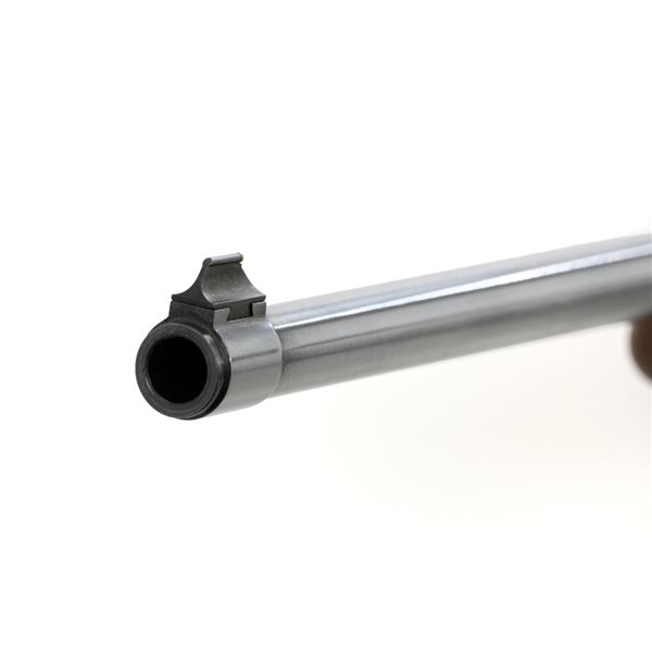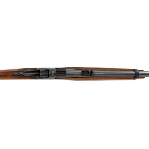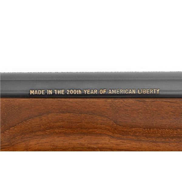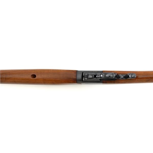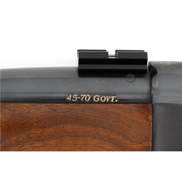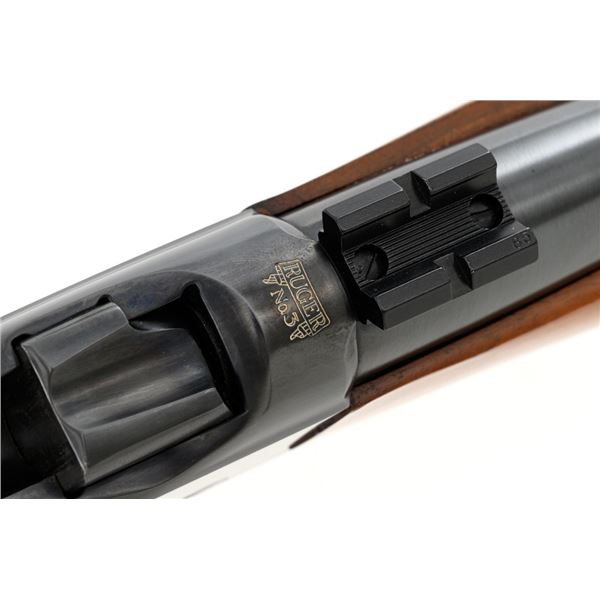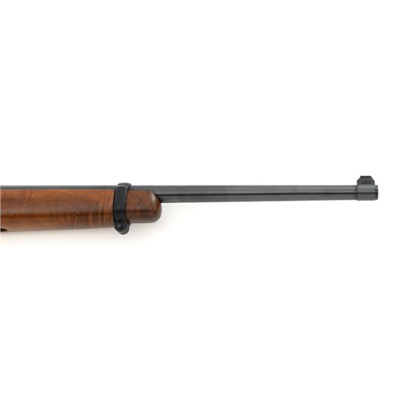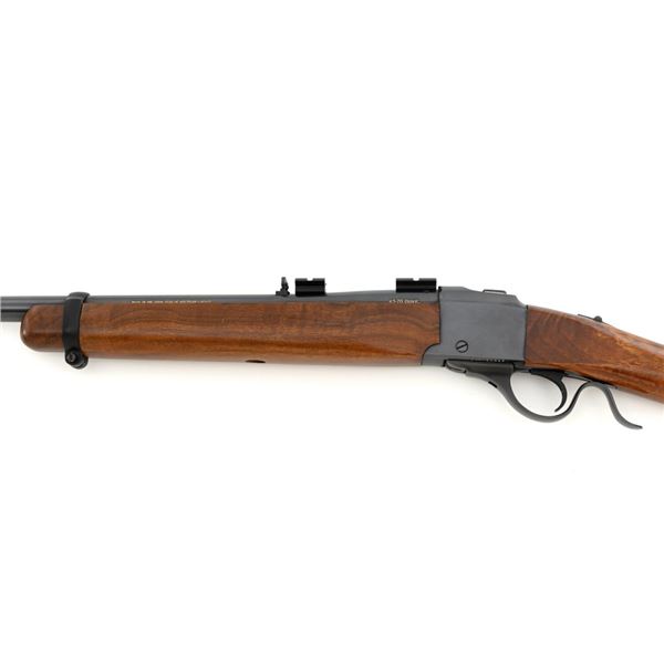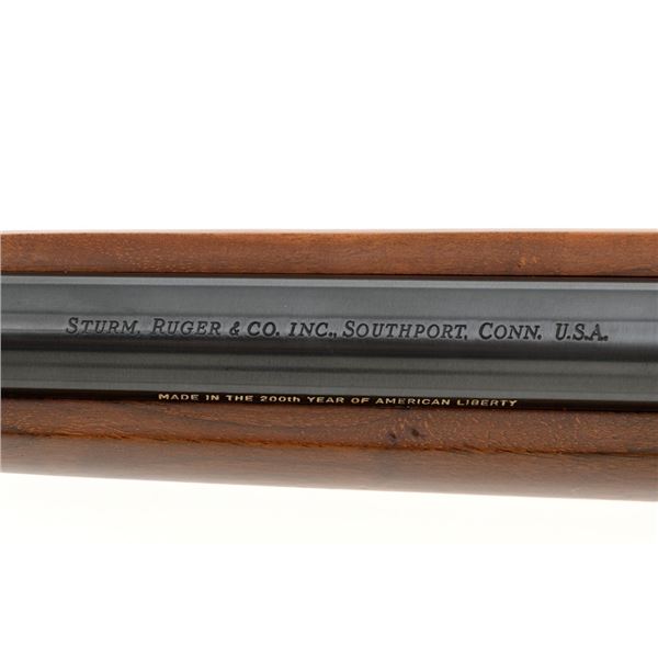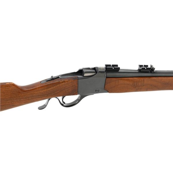 Ruger No.3 Single Shot Carbine, #130-55647, .45-70 cal., 22" barrel, with blue finish. Smooth walnut straight grip stock and forend with barrel band, ending with a smooth black plastic buttplate, providing a 13.5" LOP. Carbine also features a banded brass tipped blade front and standard notched folding rear sight, Weaver two-piece mounts added on the barrel ahead of the receiver, and tang safety. Factory markings are clear, with "MADE IN THE 200TH YEAR OF AMERICAN LIBERTY" on left side of the barrel. Mfgd 1976. Carbine is in excellent overall condition, retaining approx. 99%+ factory finish. Stock is in excellent overall condition, with scattered light indentations, and a slightly deeper ding on top of the comb. Action is crisp and locks up securely. Bore is mirror bright with excellent rifling. Est.: $700-$1,000. (Modern)
