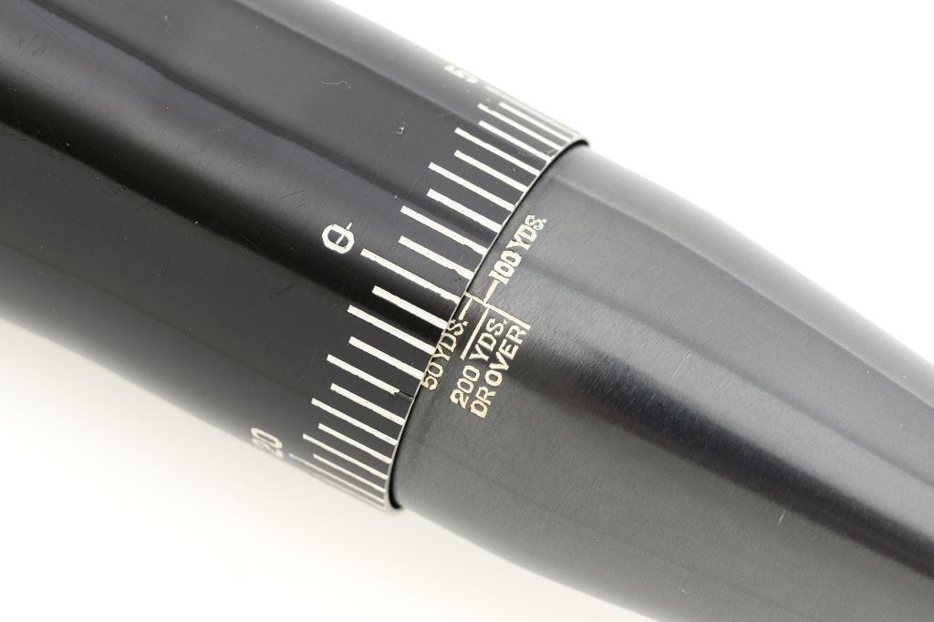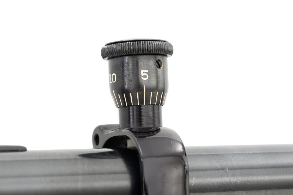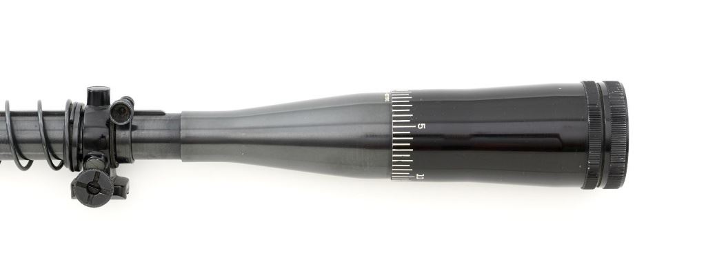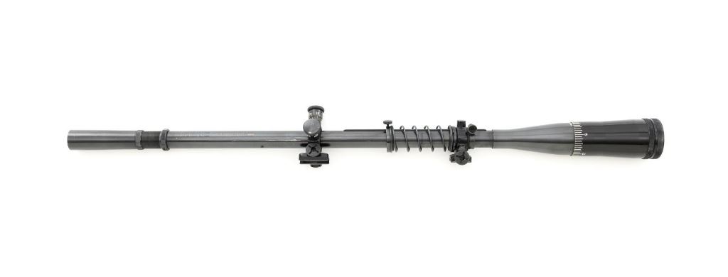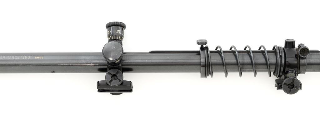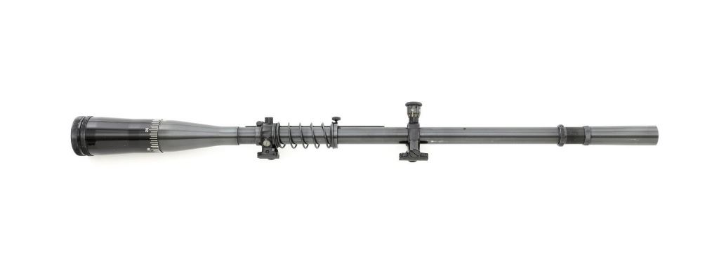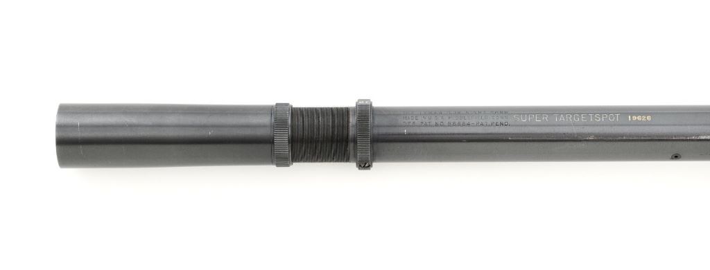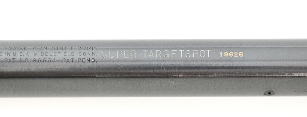 Lyman Gunsight Corp. Super 30x Targetspot Rifle Scope, #19626, 3/4" tube, blued finish, 24-3/4" length, 40mm objective with target dot reticle. Includes rear three-point mount with micrometer click adjustments, front mount and recoil spring. Scope is in near excellent condition showing only minor handling marks and scattered lights scratches. Optics are bright and clear, all adjustments turn freely. Factory lettering is sharp. Rear eye piece is missing. Est.: $700-$1,000.