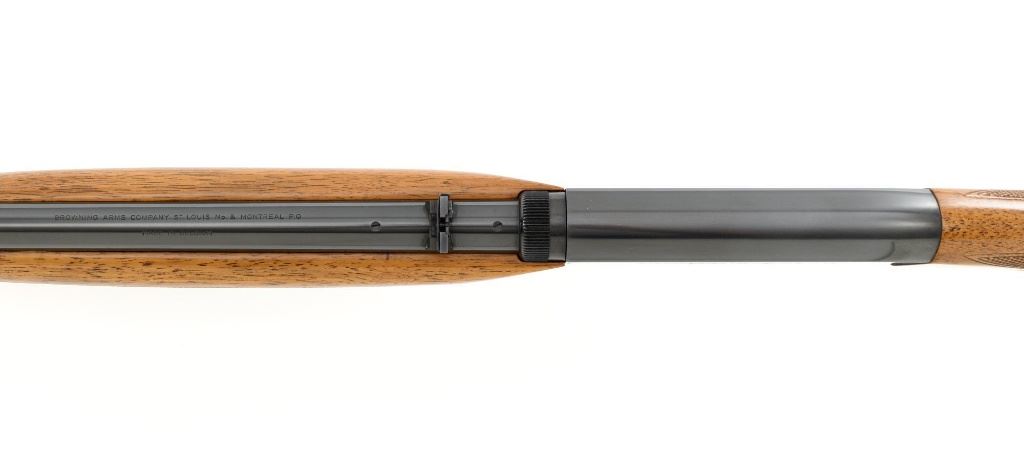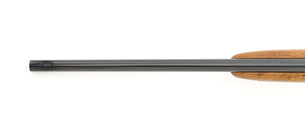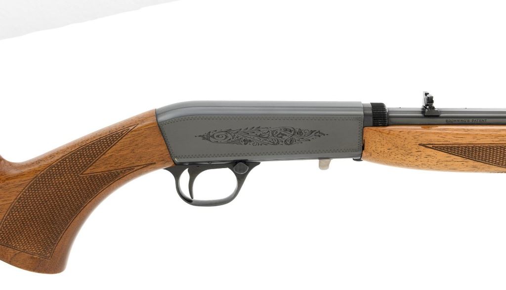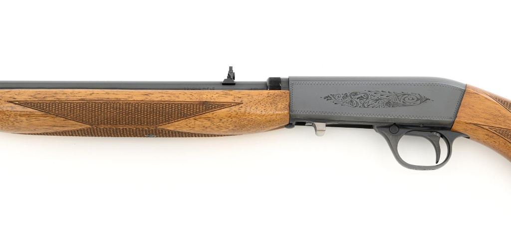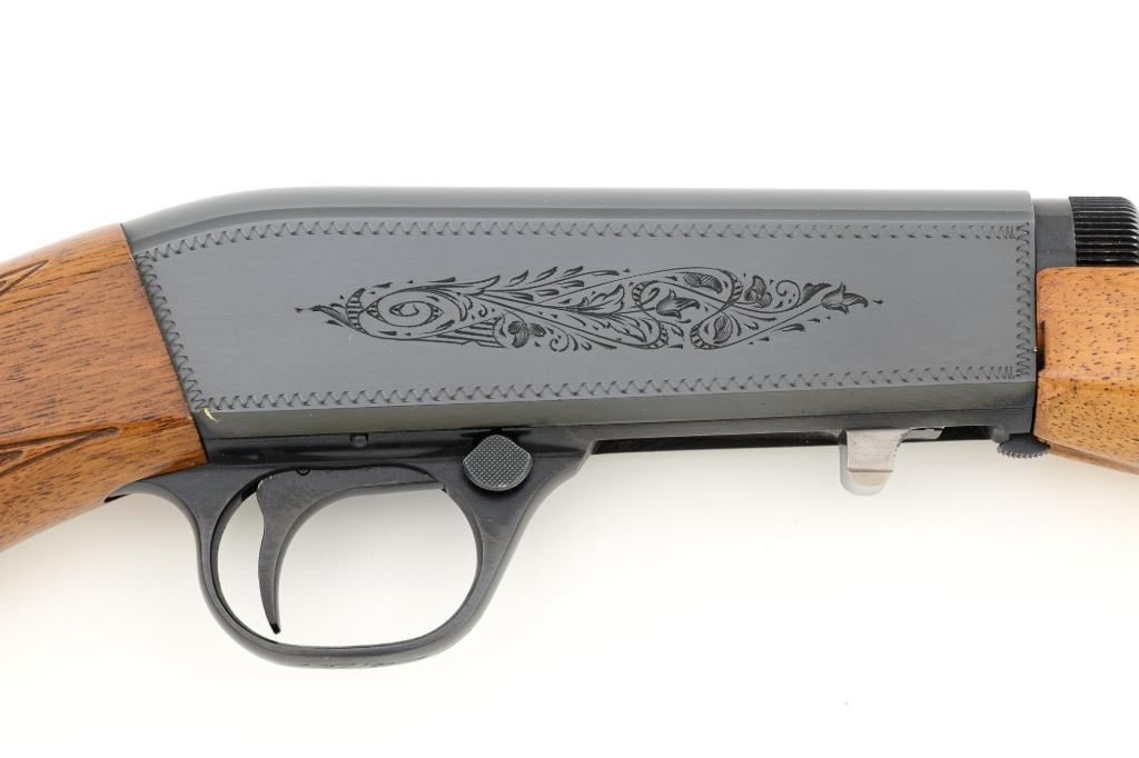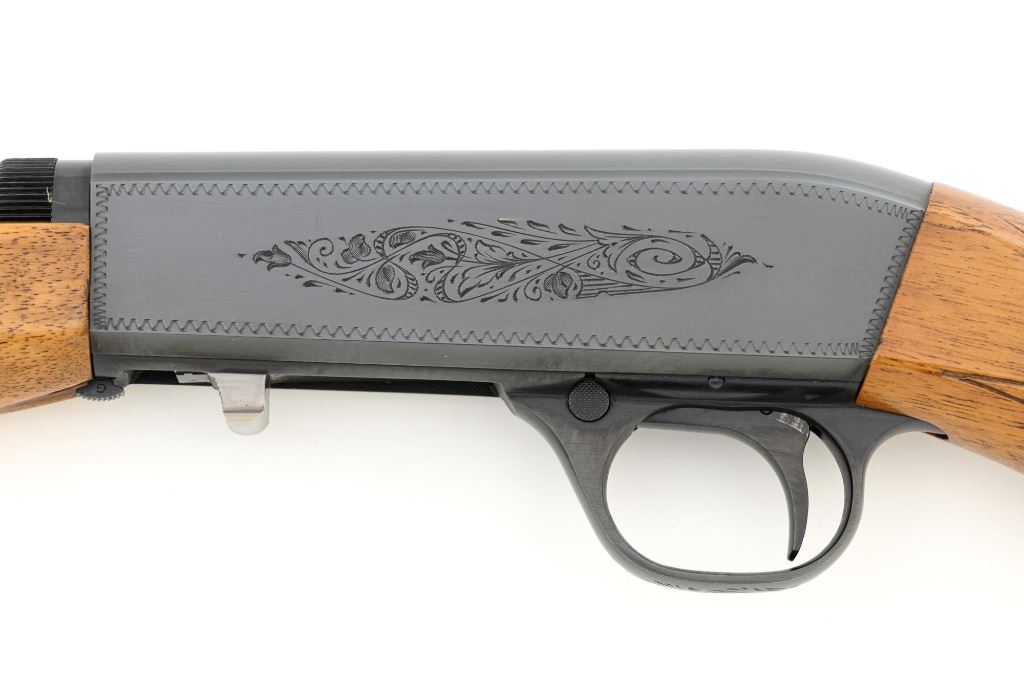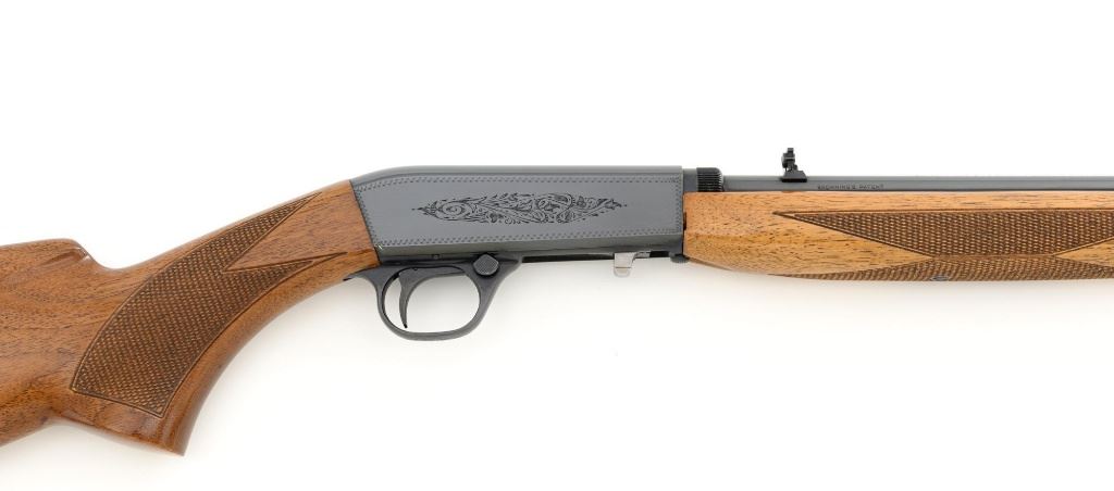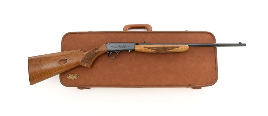 Belgian Browning SA-22 Grade I Semi-Automatic Rifle, #8T1406, .22 LR cal., 19" barrel, blue finish, checkered walnut pistol grip stock and forend, brass tipped blade front sight, and adjustable folding rear sight. Receiver with standard Grade I border and scroll engraving. Barrel is factory drilled and tapped near the rear sight. Factory markings are clear with Belgian proofs on the barrel and ejection port, marked "MADE IN BELGIUM" on the barrel. Mfgd 1968. Includes Browning Naugahyde luggage case with faux fur interior, original tag, and keys. Case is in fine condition with scuffs and light marks on the exterior and near excellent interior. Rifle is in excellent overall condition, retaining approx. 99% factory blue. Stock with a few minor storage marks and sharp checkering detail. Buttstock ends with a ribbed blue steel buttplate, providing a 14" LOP. Action operates smoothly. Bore is mirror bright with excellent rifling. Overall, shows little evidence of use. Est.: $800-$1,200. (C&R)