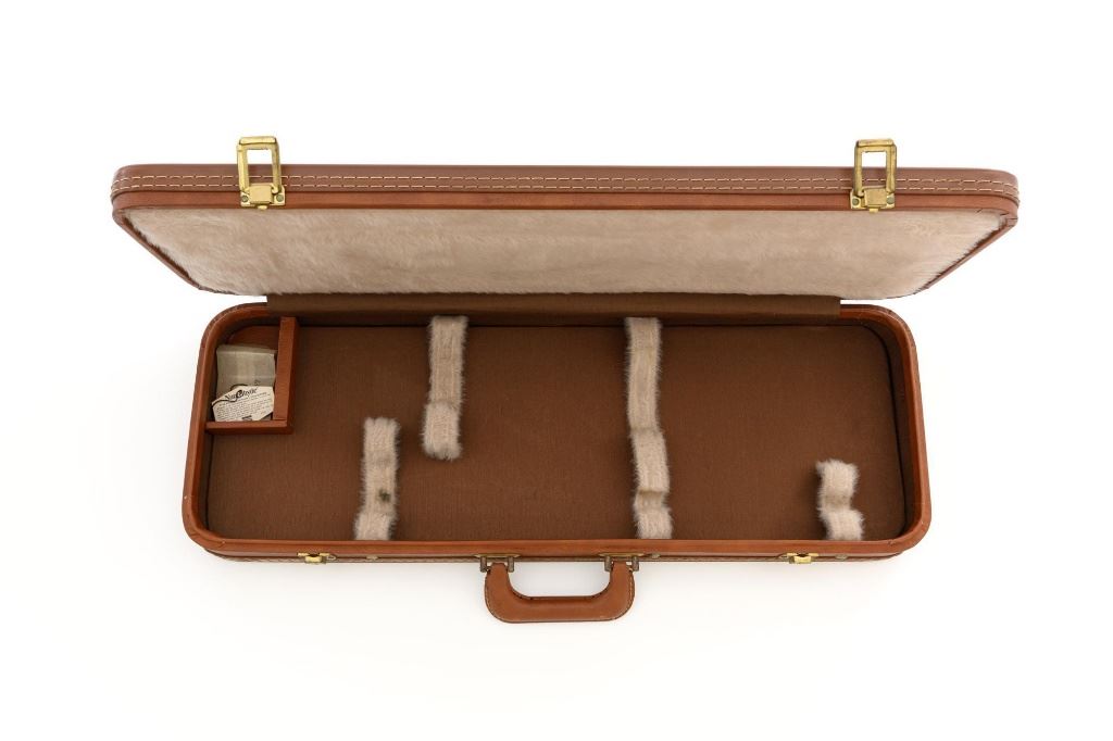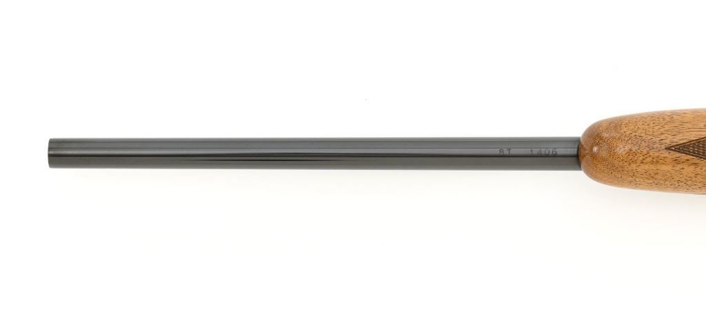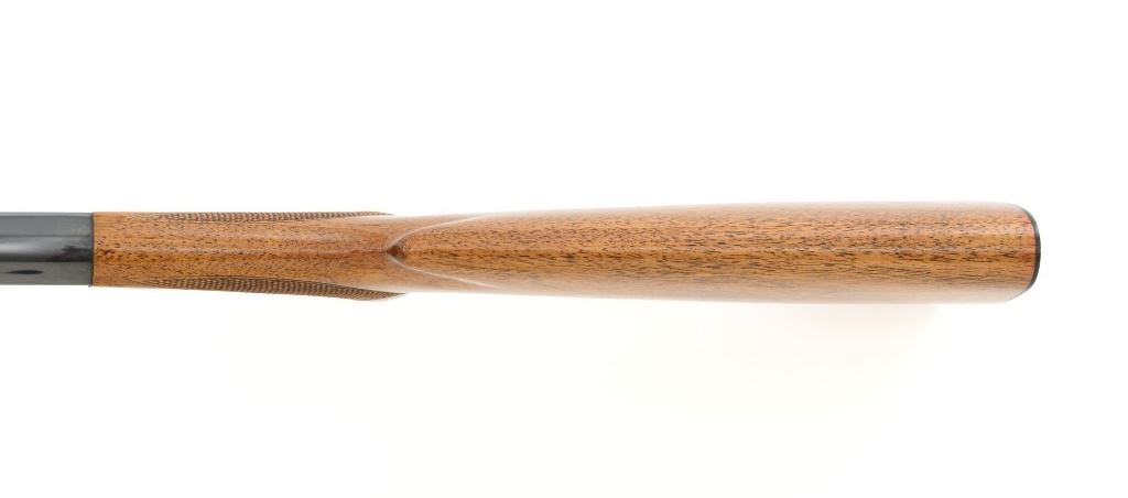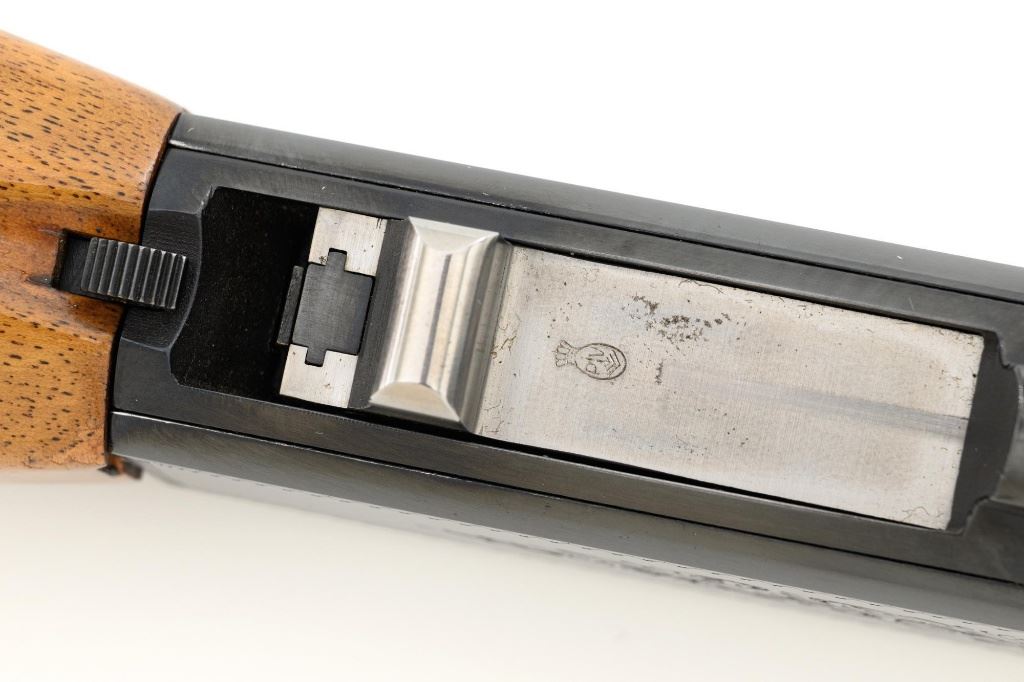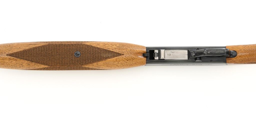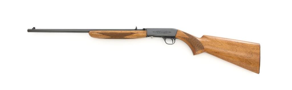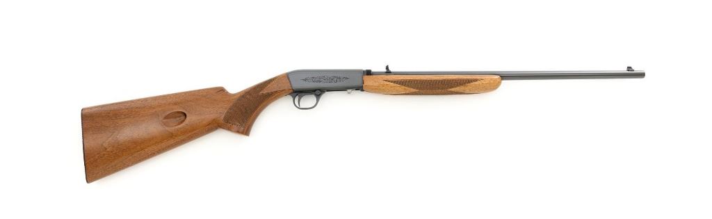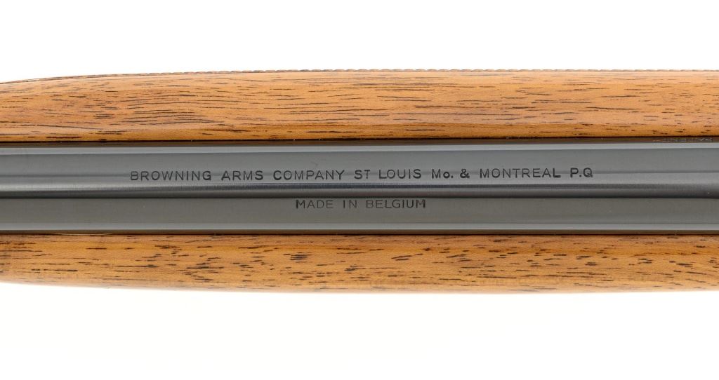 Belgian Browning SA-22 Grade I Semi-Automatic Rifle, #8T1406, .22 LR cal., 19" barrel, blue finish, checkered walnut pistol grip stock and forend, brass tipped blade front sight, and adjustable folding rear sight. Receiver with standard Grade I border and scroll engraving. Barrel is factory drilled and tapped near the rear sight. Factory markings are clear with Belgian proofs on the barrel and ejection port, marked "MADE IN BELGIUM" on the barrel. Mfgd 1968. Includes Browning Naugahyde luggage case with faux fur interior, original tag, and keys. Case is in fine condition with scuffs and light marks on the exterior and near excellent interior. Rifle is in excellent overall condition, retaining approx. 99% factory blue. Stock with a few minor storage marks and sharp checkering detail. Buttstock ends with a ribbed blue steel buttplate, providing a 14" LOP. Action operates smoothly. Bore is mirror bright with excellent rifling. Overall, shows little evidence of use. Est.: $800-$1,200. (C&R)