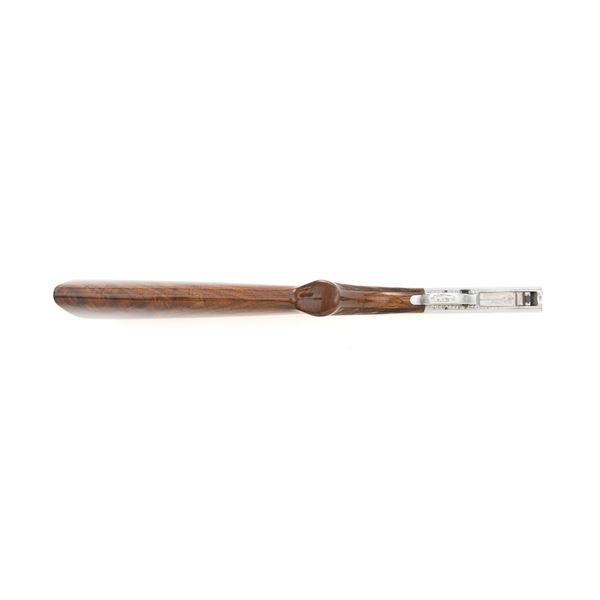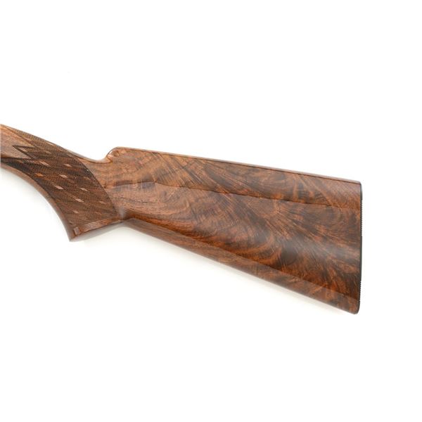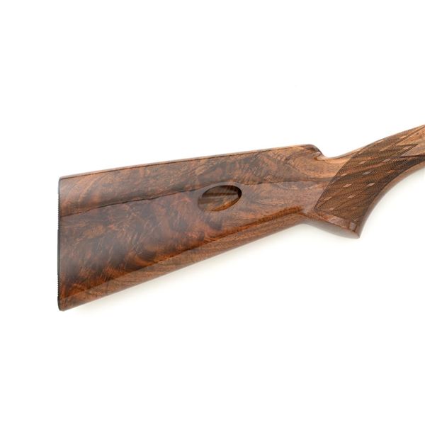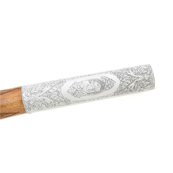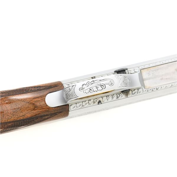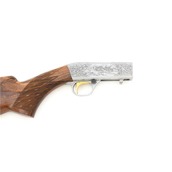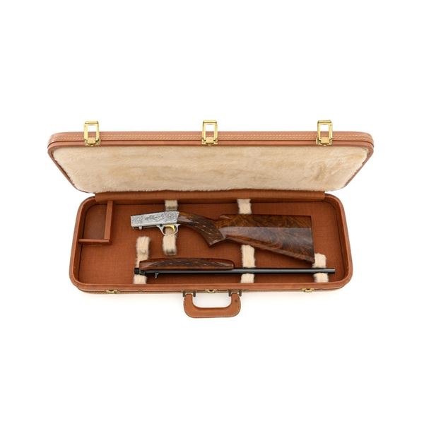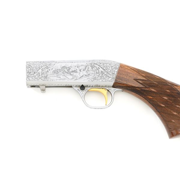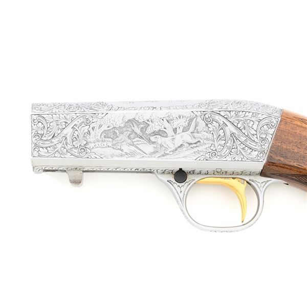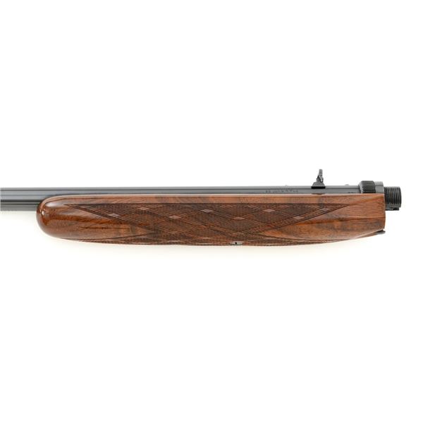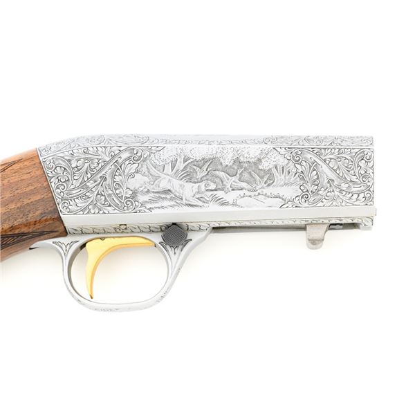 Outstanding Factory Engraved & Signed Belgian Browning Grade III SA-22 Semi-Automatic Rifle, Engraving by Master Engraver J.M. Debrus, #70T40620, .22 LR cal., 19.4" barrel, blued with coin finished receiver. Receiver features nearly full coverage in deeply and finely engraved panel game scenes that are expertly accomplished, depicting portrait of a dog with duck on top, dog flushing pheasants on the left, and dog flushing ducks on the right, along with accompanying deluxe scroll and floral engraving. Left side is signed "J.M. Debrus". Beautifully figured walnut stock displays deluxe checkering on the forend and wrist, with gloss finish. Rifle also features a brass beaded blade front sight, folding notched rear sight, and gold colored trigger. Mfgd 1970. Contained in an original Browning Naugahyde case. Master Engraver Jean Marie Debrus was born in 1938, was an engraving apprentice at Fabrique Nationale, went on to work for FN Browning, and retired in 1999. The overall condition of this outstanding rifle is excellent and would be hard to improve upon, showing only a few light handling marks to the wood, most noticeable on the left side of the buttstock. Action is crisp. Bore is bright with excellent rifling. Case is in excellent condition. Est.: $4,000-$6,000. (C&R)