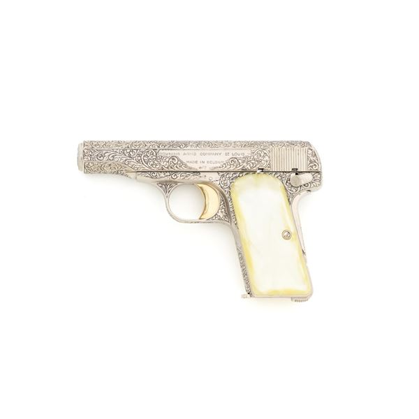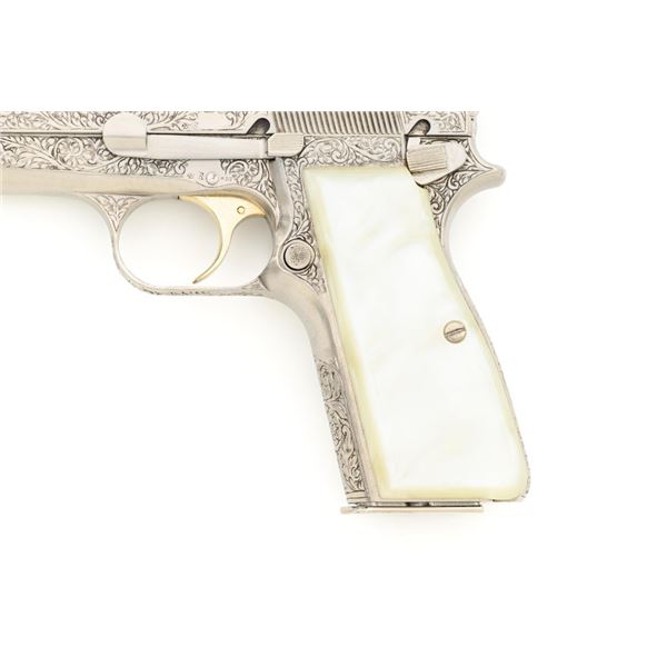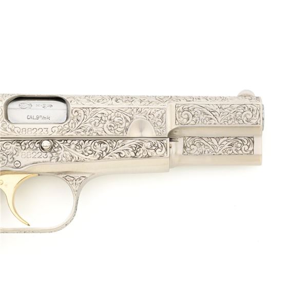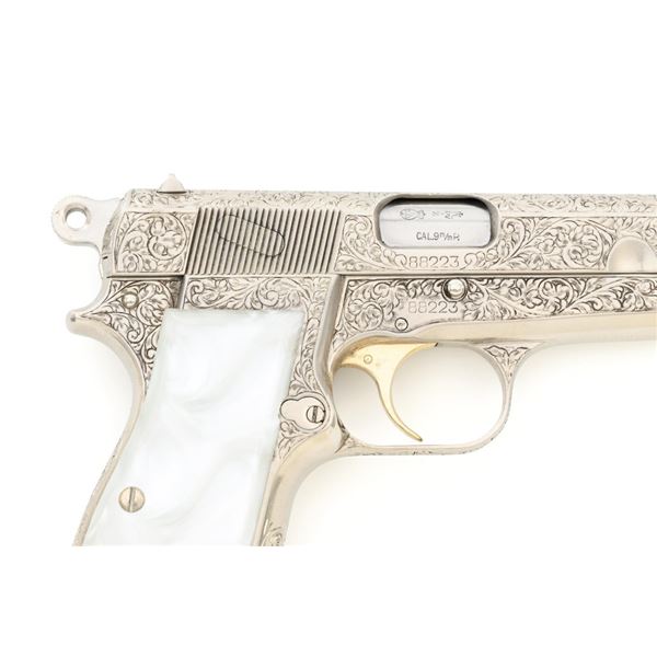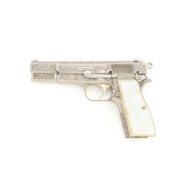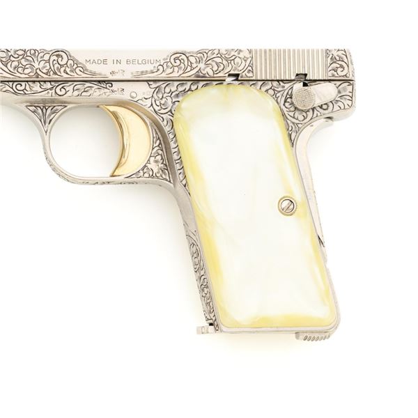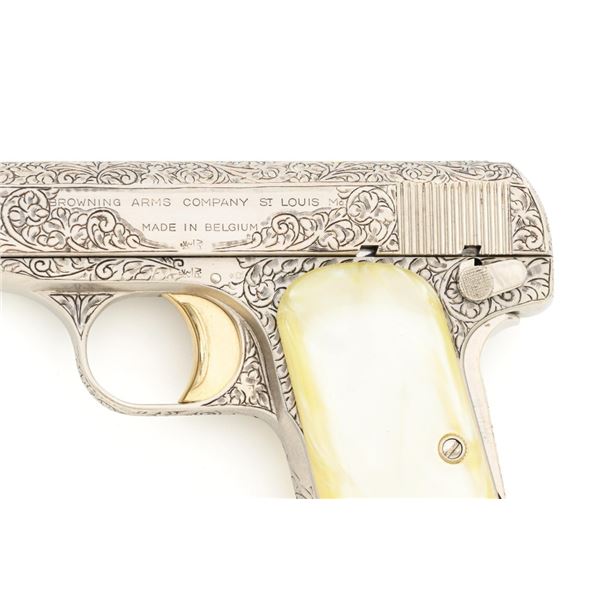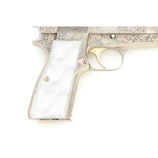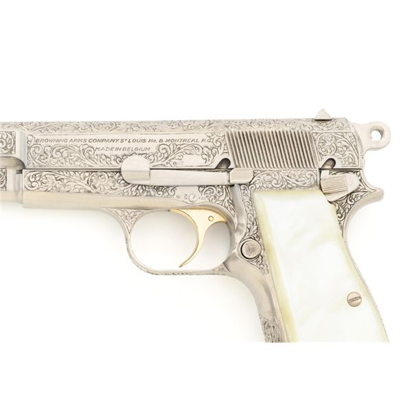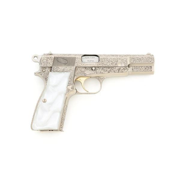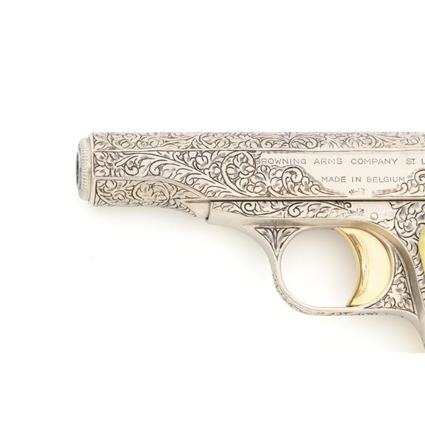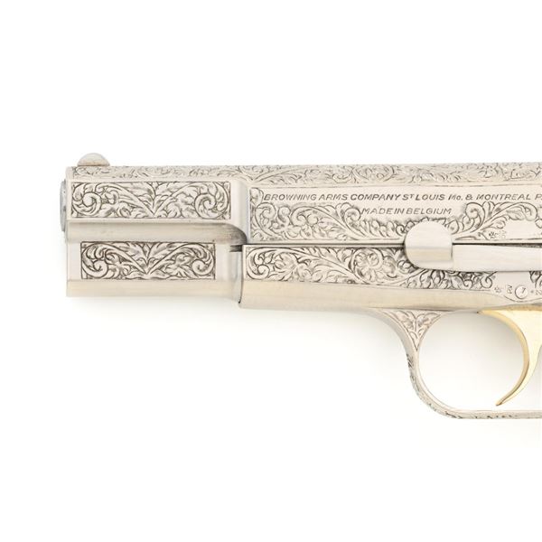 Set of Three Belgian Browning Renaissance Engraved Semi-Automatic Pistols, which includes the following: 1.) High Power, #88223, 9mm cal., 4.6" barrel, half-moon blade front sight, and dovetailed rear sight with "U"-notched groove. Mfgd 1959. 2.) Model 1955, #526194, .380 ACP cal., 3.5" barrel, small blade front sight and integral "U"-notched rear sight. Mfgd 1965. 3.) Baby, #139174, .25 ACP cal., 2.1" barrel, small blade front sight, and square-notched rear sight. Mfgd pre-1958. All feature a coin finish and extensive factory "Renaissance" engraving, gold colored triggers, pearlite grips, and retain their respective original magazines. All are displayed in a hardwood case with French fit red interior that has a Browning plaque in the lower right hand corner. The lid with a small brass plaque that has the previous owners name. Included is an original instruction manual. Pistols are in excellent overall condition; there is no flaking or finish loss, and minimal signs of handling. The sighting groove along the top of the Model 1955 pistol has a few spots that are slightly tarnished. Grips are excellent with the panels on the Model 1955 pistol showing some mild yellowing. All the actions function correctly and are like new. Bores are mirror bright with sharp lands and grooves. Exterior of the case has scattered small scratches and storage marks. Finish has blistered in the corners on the lid. Interior shows moderate age. Est.: $7,000-$9,000/set. (All C&R/PPT)