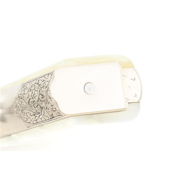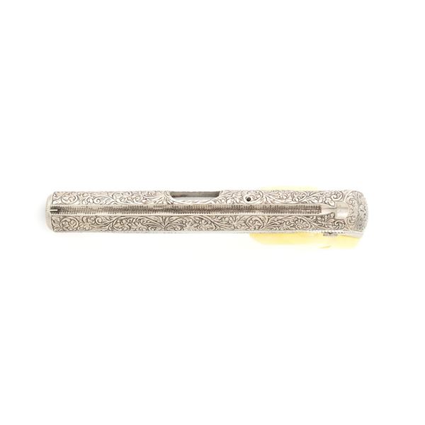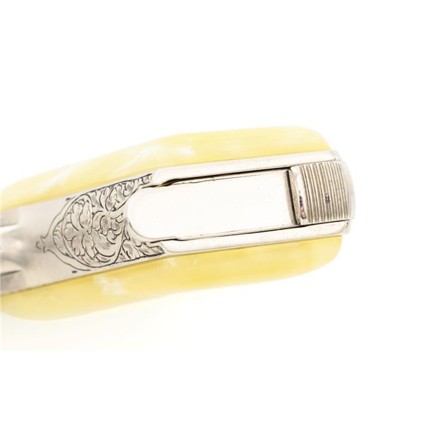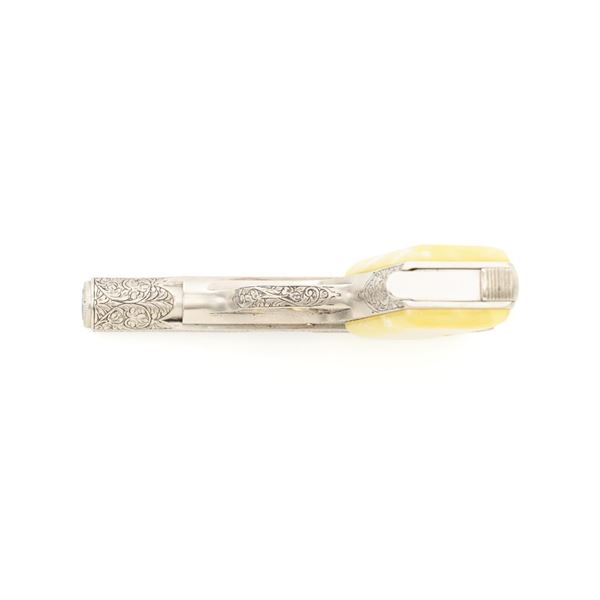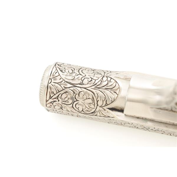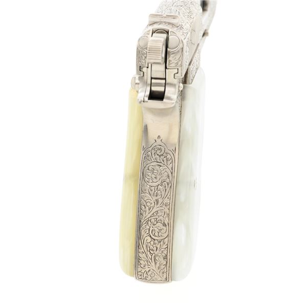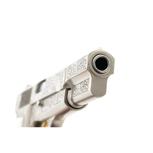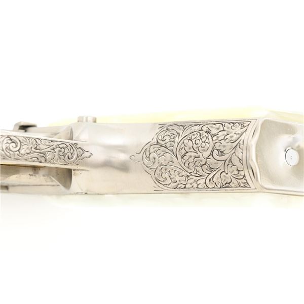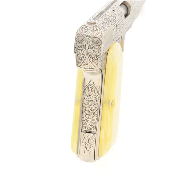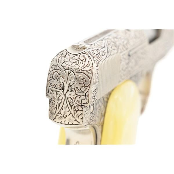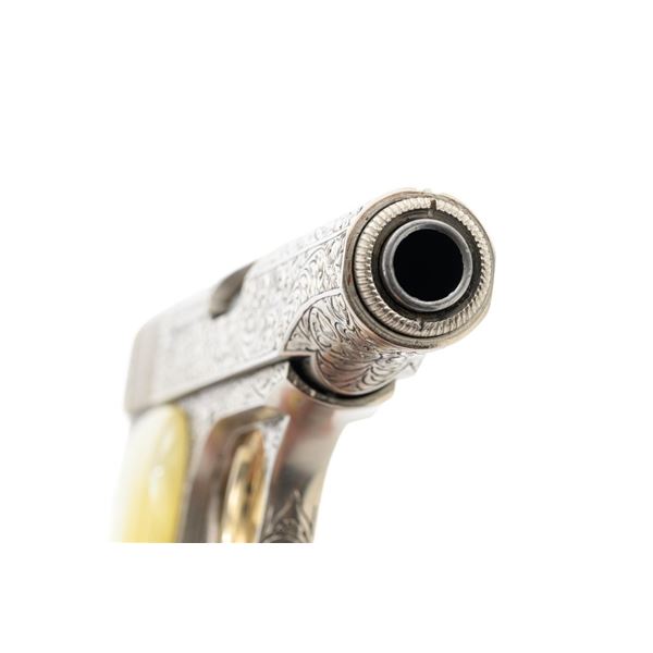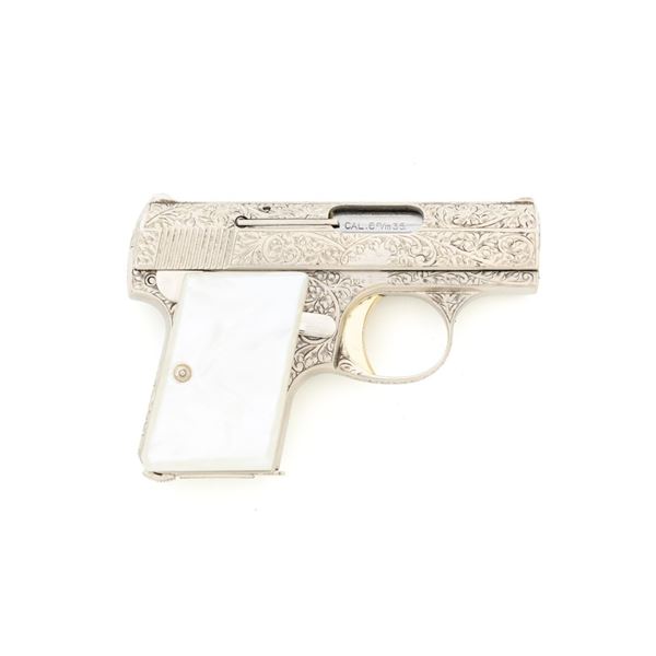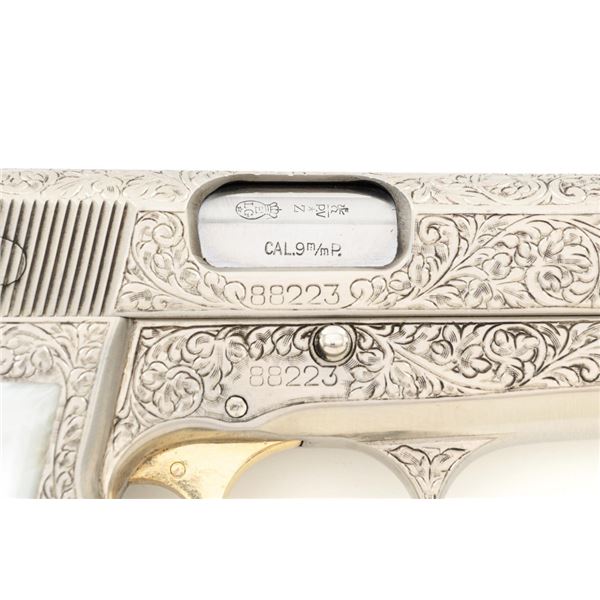 Set of Three Belgian Browning Renaissance Engraved Semi-Automatic Pistols, which includes the following: 1.) High Power, #88223, 9mm cal., 4.6" barrel, half-moon blade front sight, and dovetailed rear sight with "U"-notched groove. Mfgd 1959. 2.) Model 1955, #526194, .380 ACP cal., 3.5" barrel, small blade front sight and integral "U"-notched rear sight. Mfgd 1965. 3.) Baby, #139174, .25 ACP cal., 2.1" barrel, small blade front sight, and square-notched rear sight. Mfgd pre-1958. All feature a coin finish and extensive factory "Renaissance" engraving, gold colored triggers, pearlite grips, and retain their respective original magazines. All are displayed in a hardwood case with French fit red interior that has a Browning plaque in the lower right hand corner. The lid with a small brass plaque that has the previous owners name. Included is an original instruction manual. Pistols are in excellent overall condition; there is no flaking or finish loss, and minimal signs of handling. The sighting groove along the top of the Model 1955 pistol has a few spots that are slightly tarnished. Grips are excellent with the panels on the Model 1955 pistol showing some mild yellowing. All the actions function correctly and are like new. Bores are mirror bright with sharp lands and grooves. Exterior of the case has scattered small scratches and storage marks. Finish has blistered in the corners on the lid. Interior shows moderate age. Est.: $7,000-$9,000/set. (All C&R/PPT)