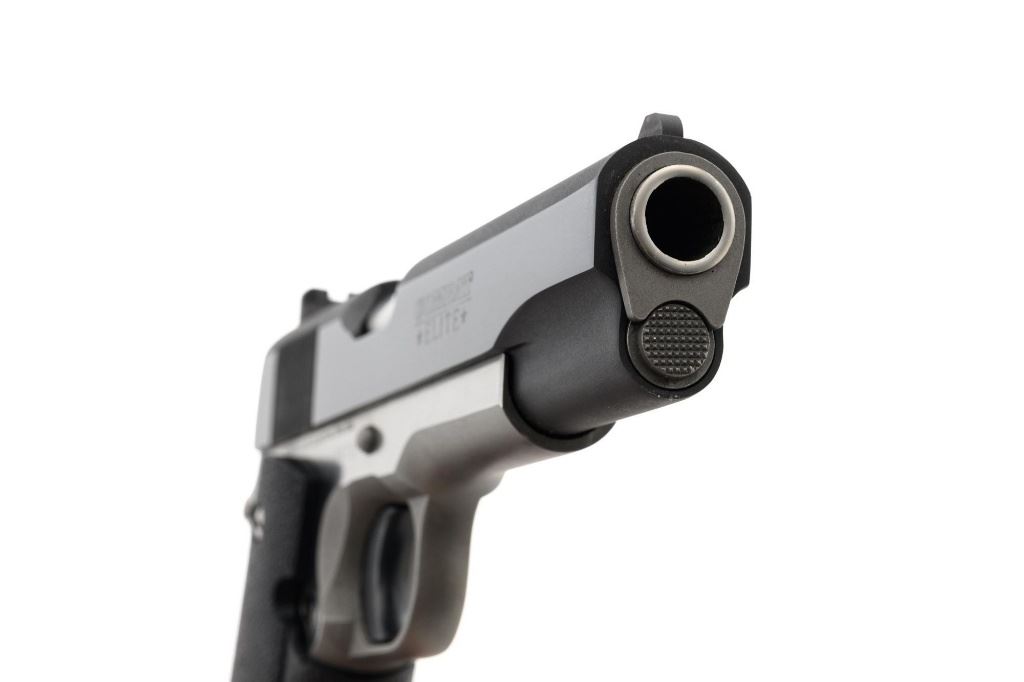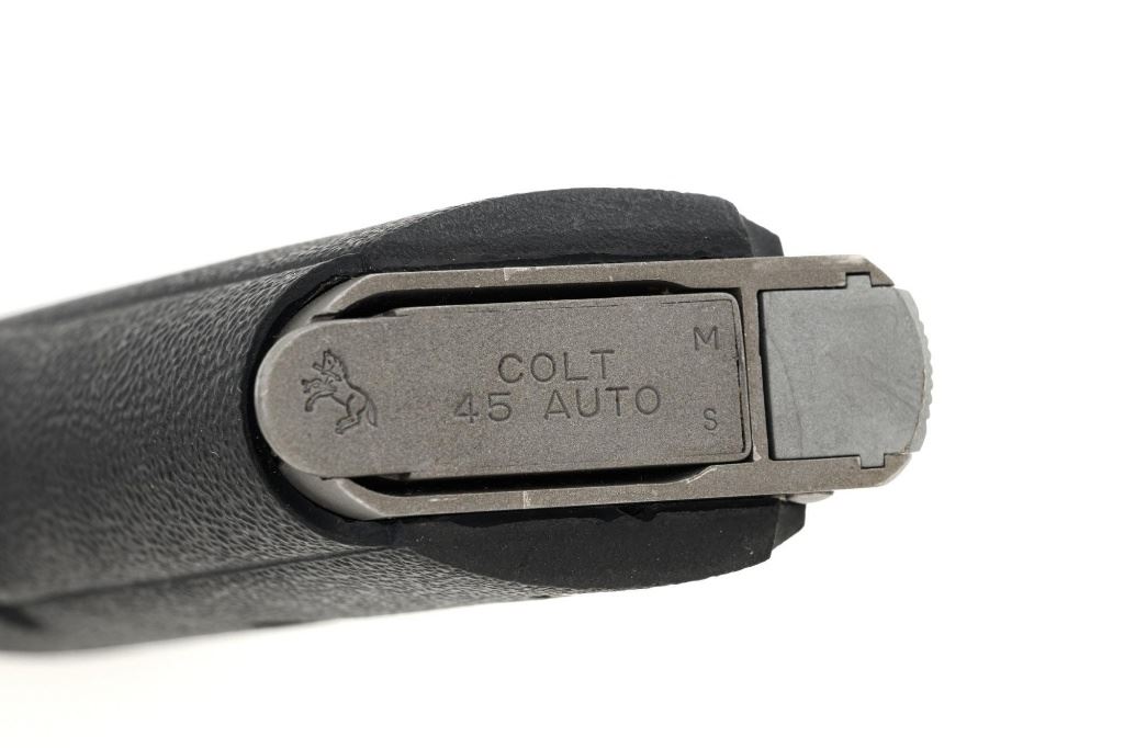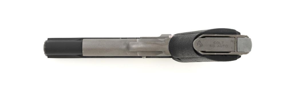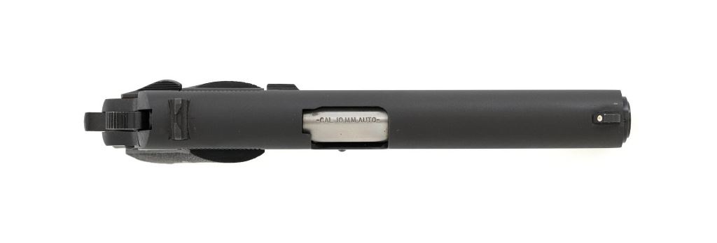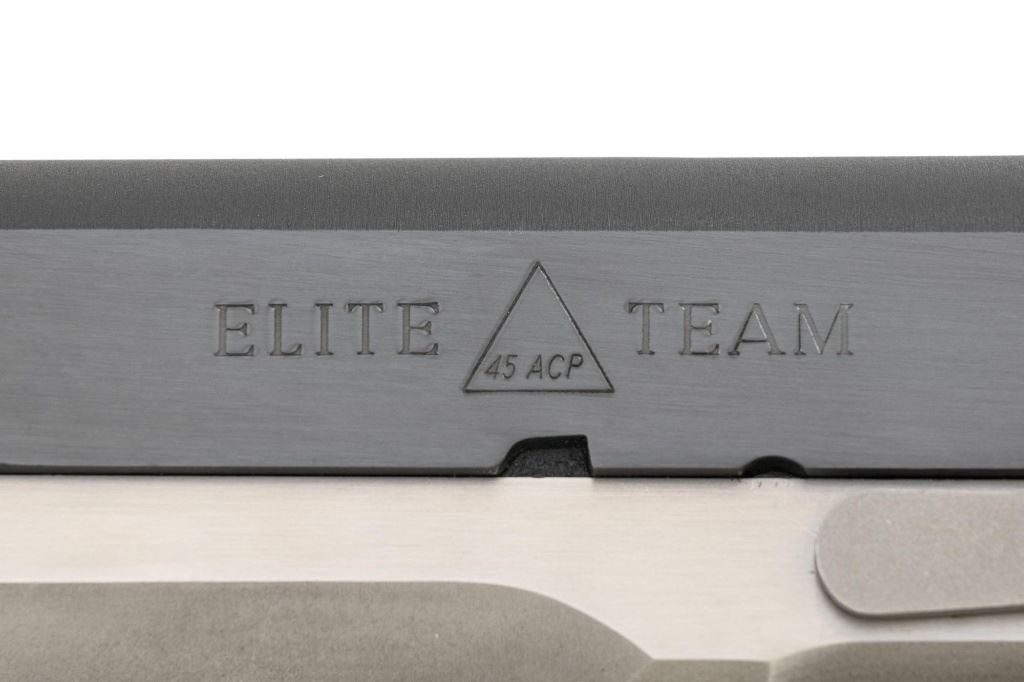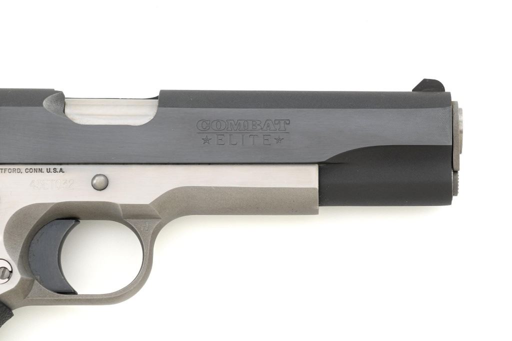 Scarce One of Only 250 Matched Sets of Colt Elite Team Semi-Automatic Pistols. Each set consists of the following: 1.) Colt Combat Elite Semi-Automatic Pistol, #45ET032, .45 ACP cal., 5" barrel, blue slide, stainless steel frame, textured wraparound black rubber grips with silver Colt medallions, white 3-dot sights, with two (2) stainless Colt magazines. 2.) Colt Delta Elite Semi-Automatic Pistol, #10ET032, 10mm cal., 5" barrel, blue finish, original wraparound textured black rubber grips with Delta Elite medallions, white 3-dot sights, and two (2) factory blued steel Delta Elite magazines. Both pistols with standard markings for their respective model as well as "Elite Team" on left side of the slide. Each gun includes the original matching numbered box with two-piece Styrofoam insert, orange hang tag, instruction manual, and other misc. factory literature. Pistol #1 is in excellent overall condition, showing little evidence of use, with only a few minor handling marks and a mirror bright bore. Pistol #2 is also in excellent overall condition and shows little evidence of use. Inexplicably there is a line of finish wear on both sides of the slide, along the bottom edge of the front bevel. In an area that does not make any contact with the frame. Overall, it detracts little from an otherwise like new pistol that has a mirror bright bore. Boxes have clear end labels and display typical light storage type wear, mainly along the edges. A total of only 250 sets were produced in 1989. Est.: $3,500-$5,000/set. (Modern/PPT)