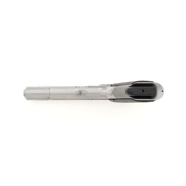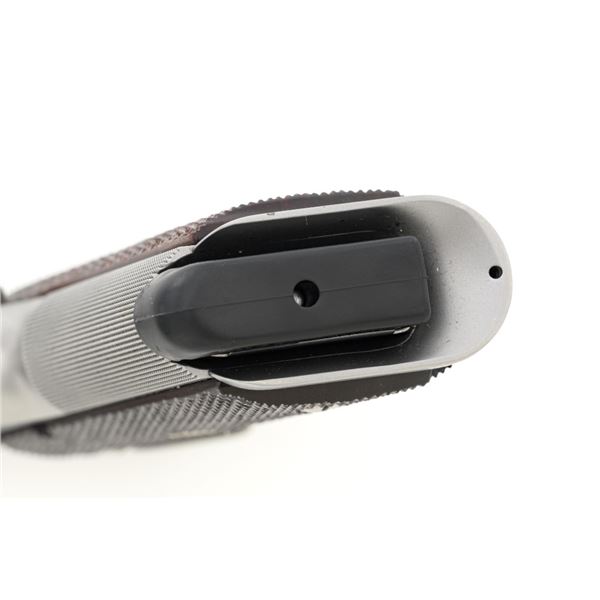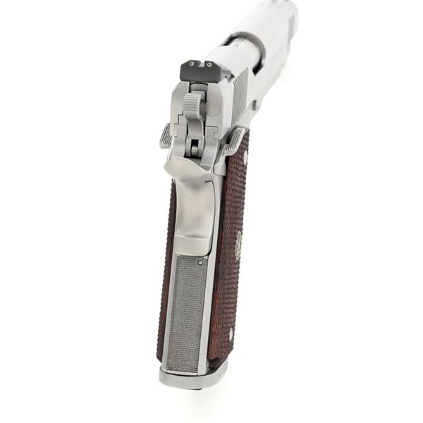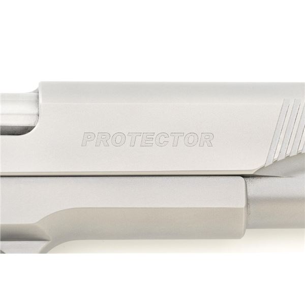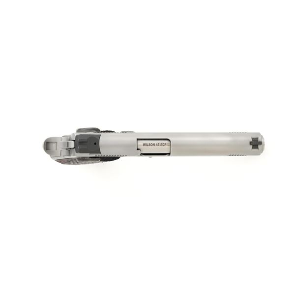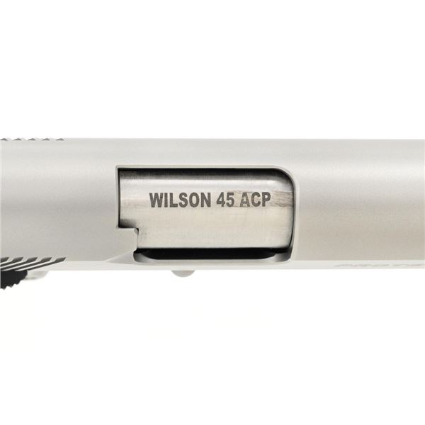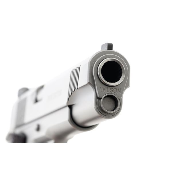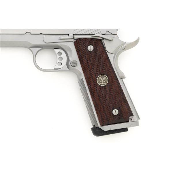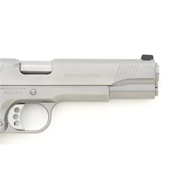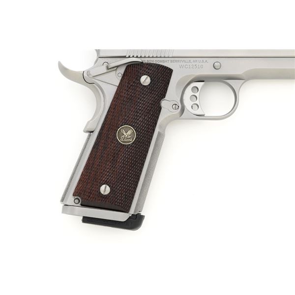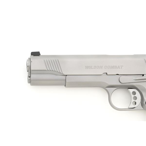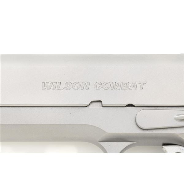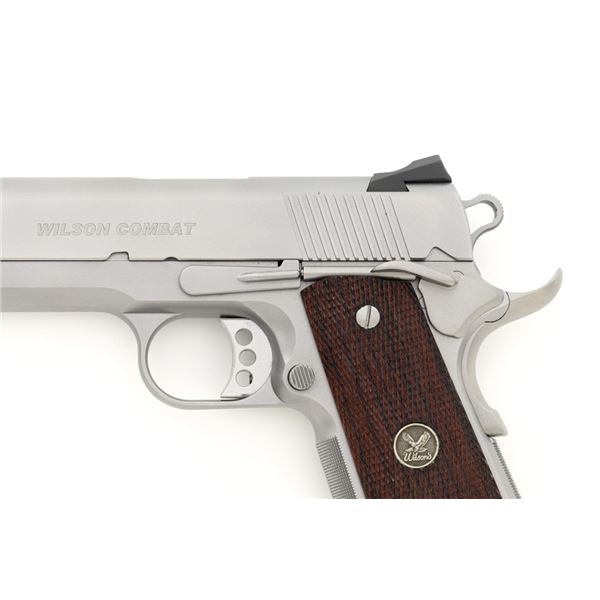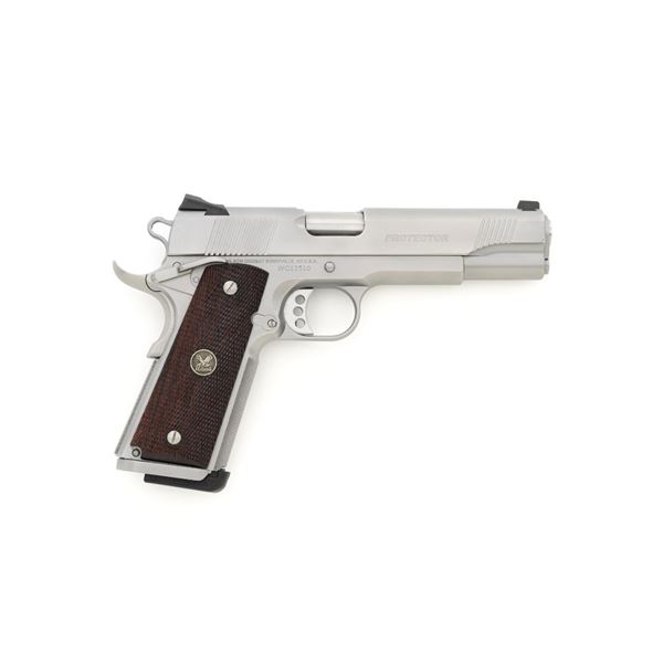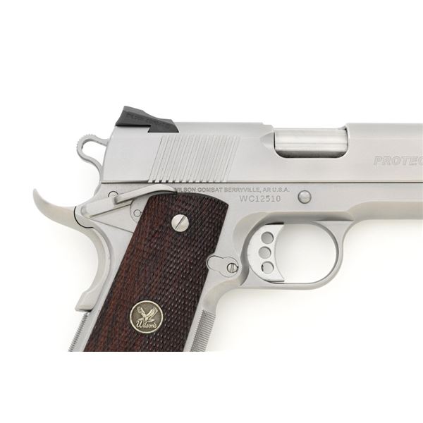 Wilson Combat Protector 1911 Semi-Automatic Pistol, #WC12510, .45 ACP cal., 5" stainless steel match grade barrel, satin stainless finish, checkered cocobolo two-piece Wilson Combat grips, Wilson Combat Tritium night sights (dim), full-size stainless steel frame, skeletonized hammer and three hole trigger, high ride beavertail grip safety, 30 LPI high-cut checkered front strap, contoured magazine well, hand fit bushing, full-length guide rod, with one 8-round Wilson Combat magazine. Pistol is in excellent overall condition, with only light handling marks. Grips are excellent with sharp checkering detail. Action is crisp and functions smoothly. Bore is mirror bright with excellent rifling, showing little use. Est.: $2,000-$2,500. (Modern/PPT)