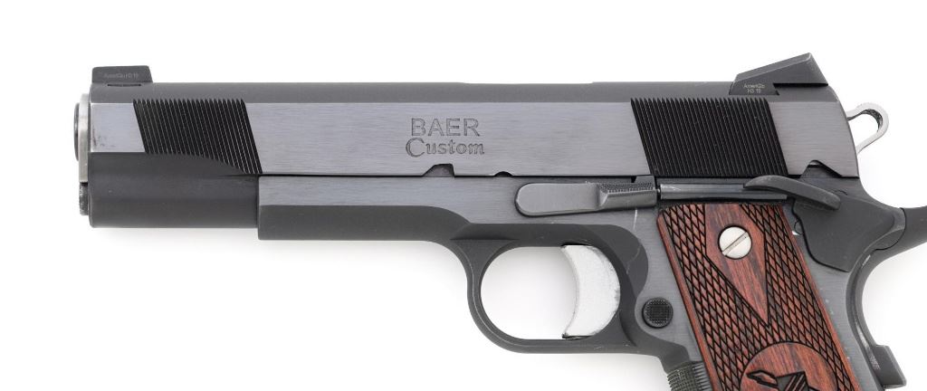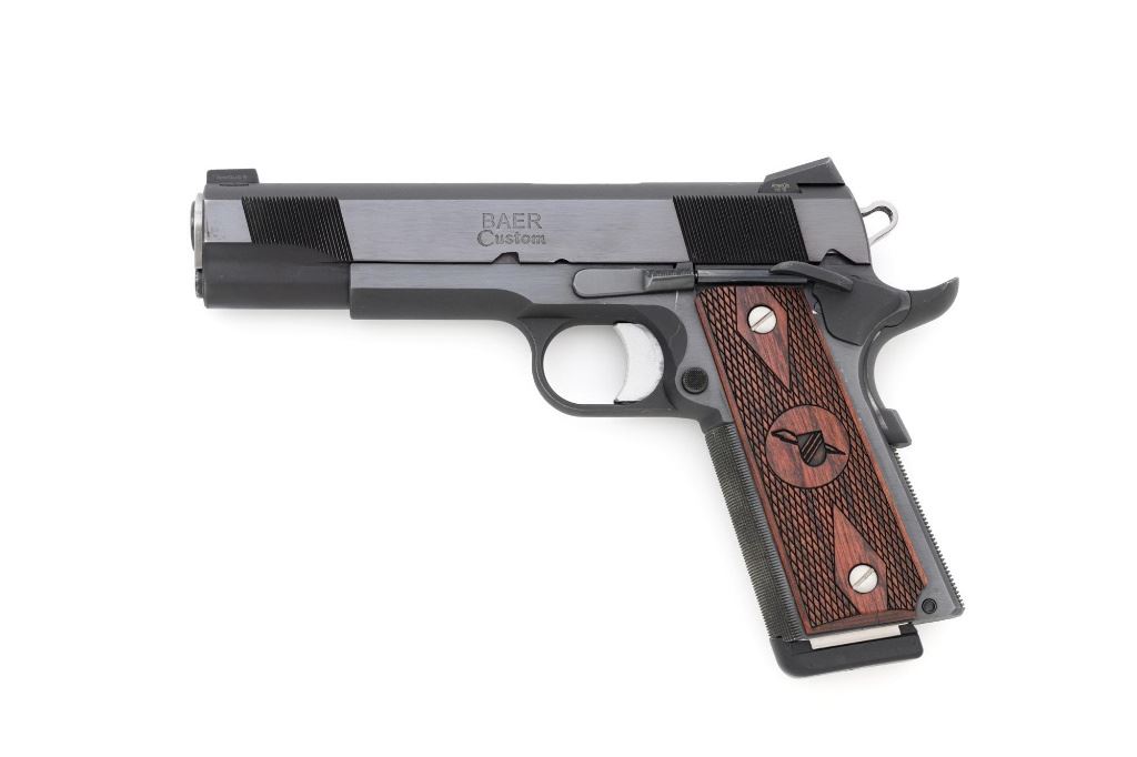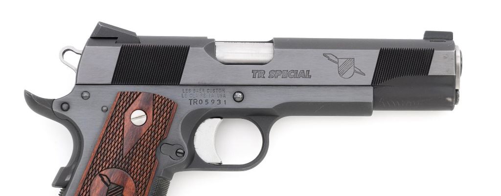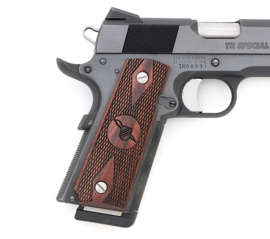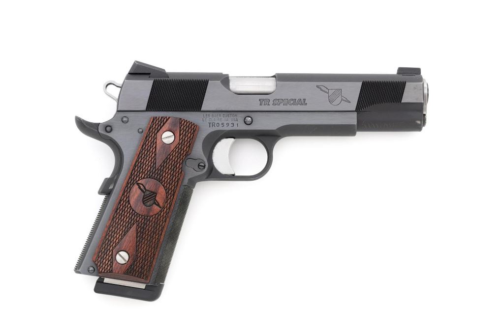 Les Baer Thunder Ranch Special 1911 Semi-Automatic Pistol, #TR05931, .45 ACP cal., 5" stainless steel barrel, blue finish, checkered walnut two-piece slim line grips with Thunder Ranch logo, steel slide with front and rear serrations, extended ejector, flared ejection port, deluxe commander style hammer and sear, aluminum match trigger, LBC deluxe fixed rear sight and dovetailed front sight with tritium inserts (dim), beavertail grip safety with pad, extended combat safety, checkered front and rear straps, beveled magwell, with two (2) stainless steel 7-round magazines with nylon bumper pads. Mfgd 2019. Pistol is in near excellent overall condition, retaining approx. 97%-98% factory finish, with light wear at the muzzle, and modest high point edgewear. Grips are in excellent condition with only minor storage marks. Action functions smoothly with a crisp trigger. Bore is near excellent with well-defined rifling. Est.: $1,500-$2,500. (Modern/PPT)