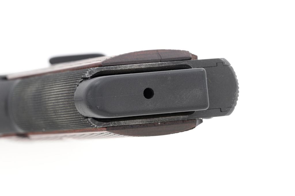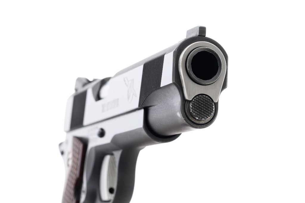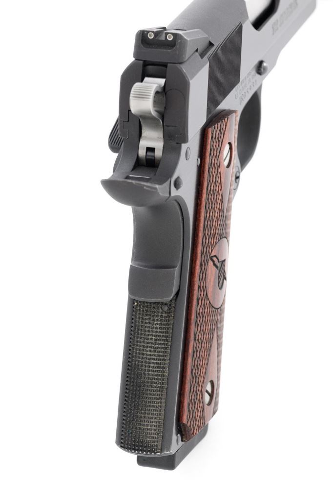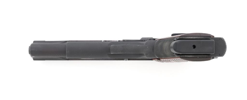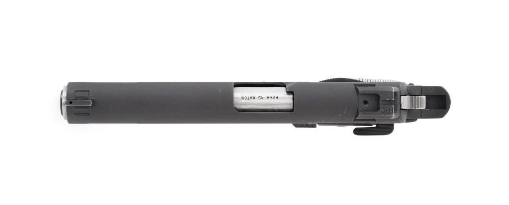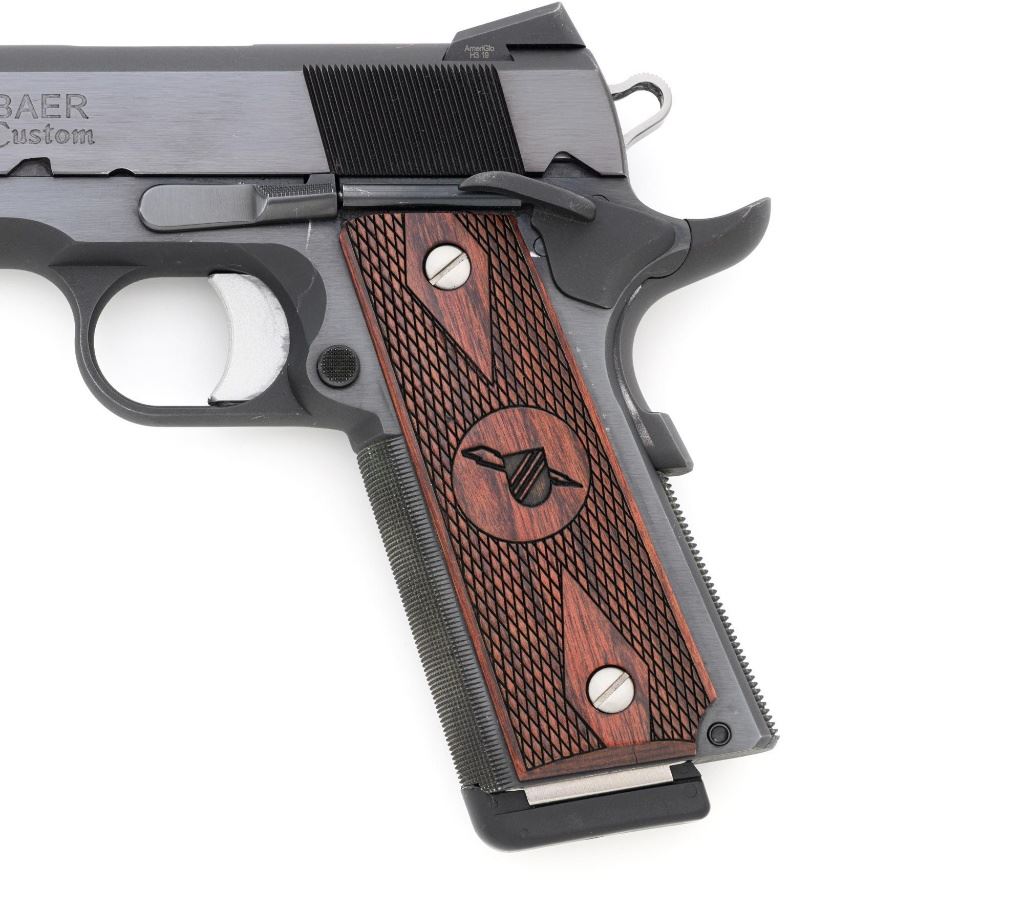 Les Baer Thunder Ranch Special 1911 Semi-Automatic Pistol, #TR05931, .45 ACP cal., 5" stainless steel barrel, blue finish, checkered walnut two-piece slim line grips with Thunder Ranch logo, steel slide with front and rear serrations, extended ejector, flared ejection port, deluxe commander style hammer and sear, aluminum match trigger, LBC deluxe fixed rear sight and dovetailed front sight with tritium inserts (dim), beavertail grip safety with pad, extended combat safety, checkered front and rear straps, beveled magwell, with two (2) stainless steel 7-round magazines with nylon bumper pads. Mfgd 2019. Pistol is in near excellent overall condition, retaining approx. 97%-98% factory finish, with light wear at the muzzle, and modest high point edgewear. Grips are in excellent condition with only minor storage marks. Action functions smoothly with a crisp trigger. Bore is near excellent with well-defined rifling. Est.: $1,500-$2,500. (Modern/PPT)