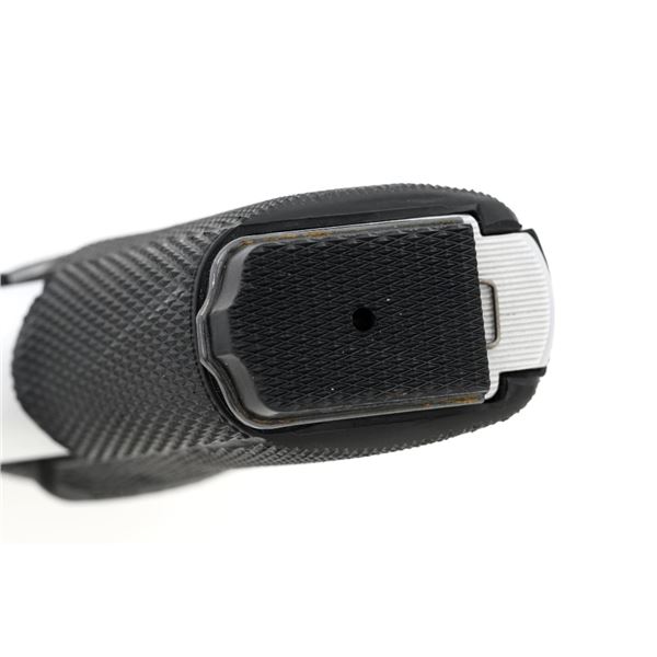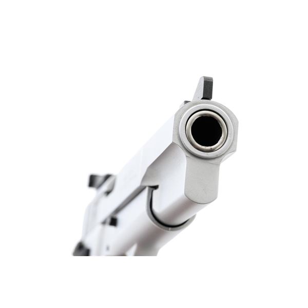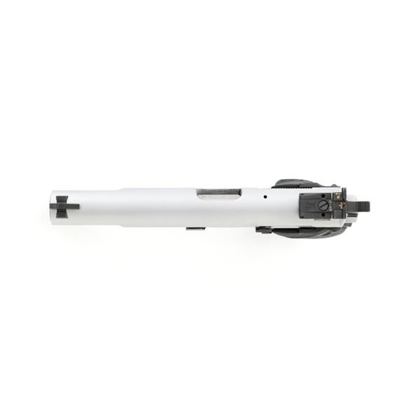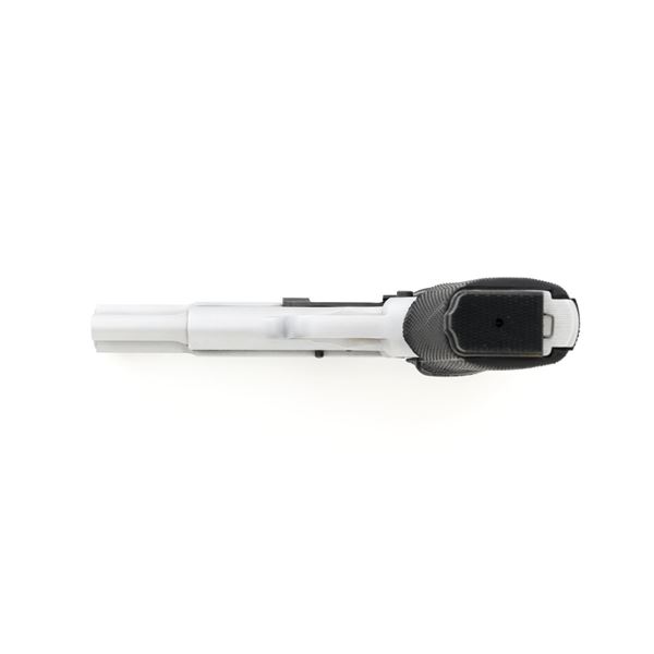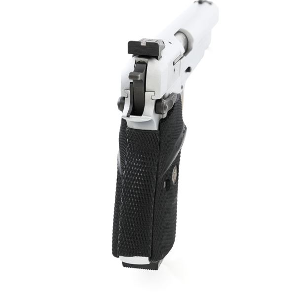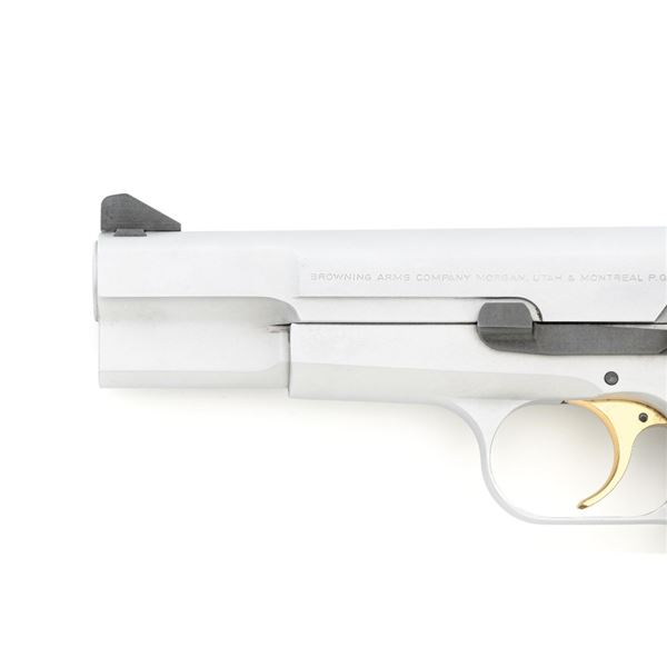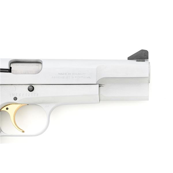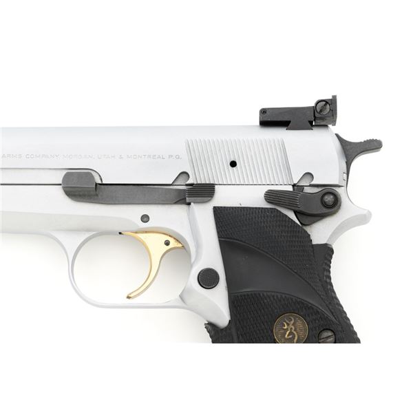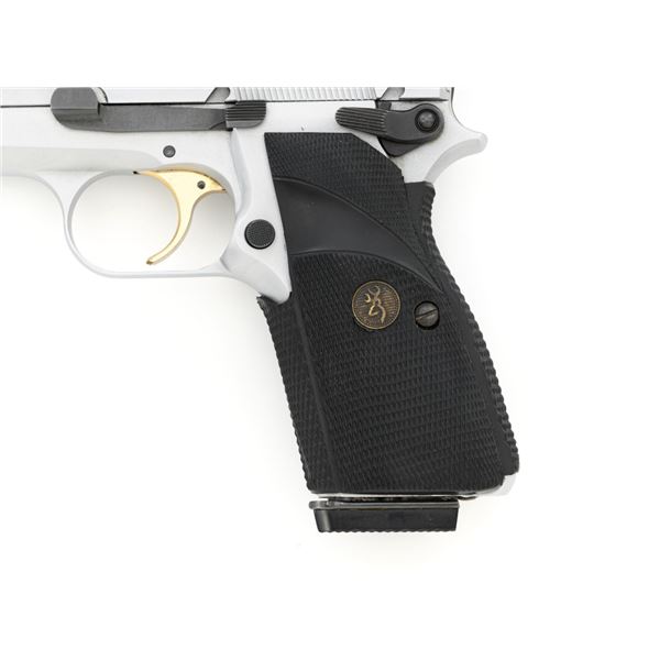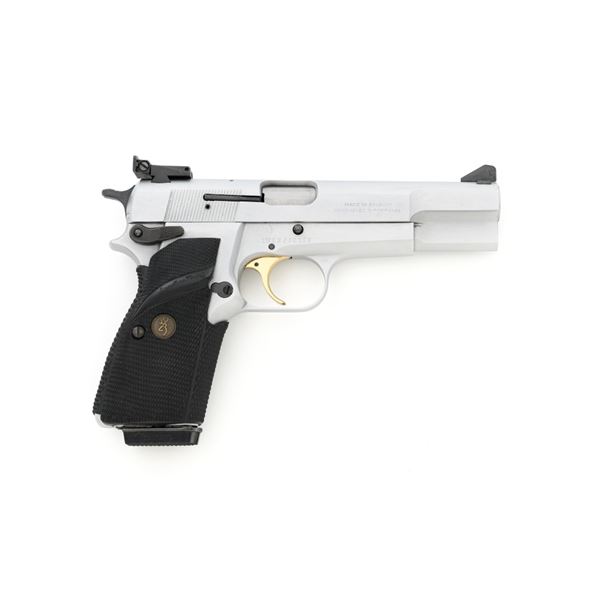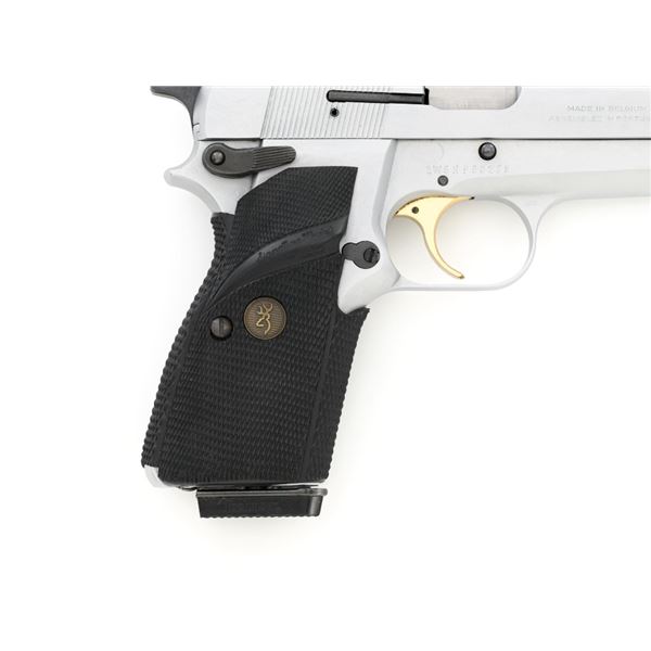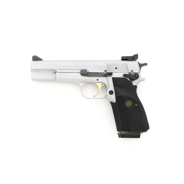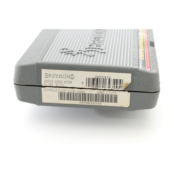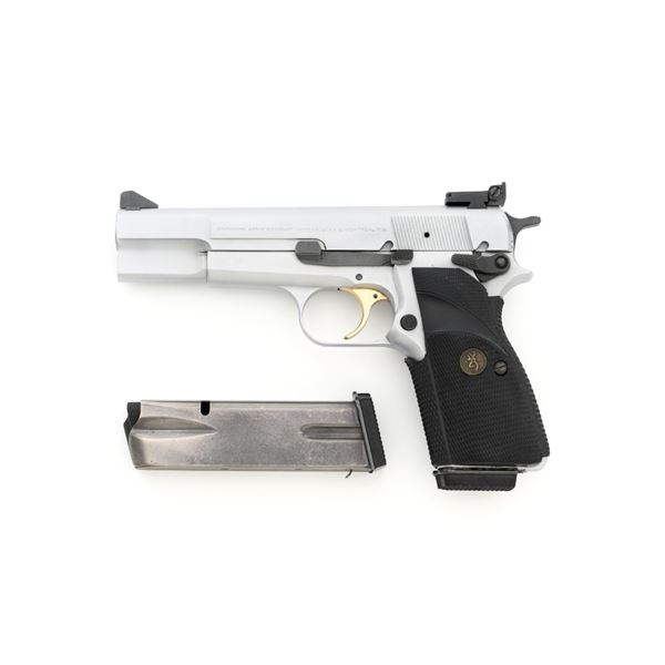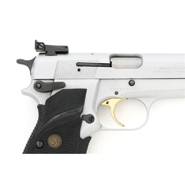 Browning Hi-Power Semi-Automatic Pistol, #2W5NP50258, .40 S&W cal., 4.6" barrel, satin nickel finish, checkered black rubber wraparound Pachmayr grips, blade front sight, adjustable square-notch rear sight, with two (2) 10-round magazines. Factory markings are sharp with a Belgian proof on the trigger guard, right side of the slide is marked "MADE IN BELGIUM/ASSEMBLED IN PORTUGAL". Includes factory plastic hard case with matching end label, instruction manual, warranty card, brochure, and associated packaging materials. Pistol is in excellent overall condition, showing light wear. Grips are near excellent with crisp checkering. Action operates smoothly. Bore is excellent with well-defined rifling. Est.: $800-$1,200. (Modern/PPT)