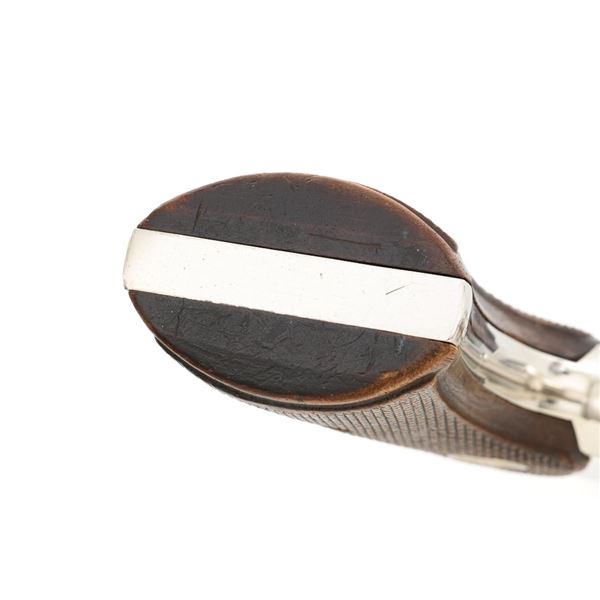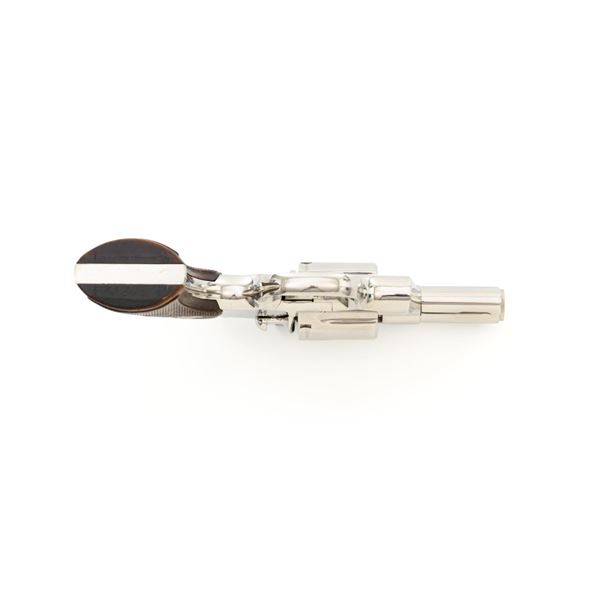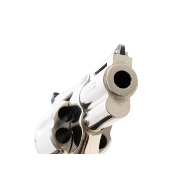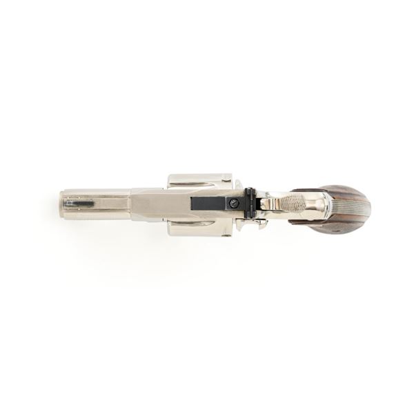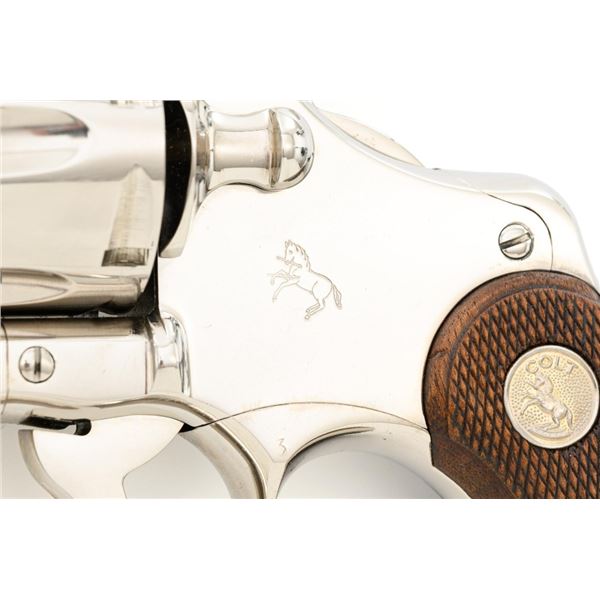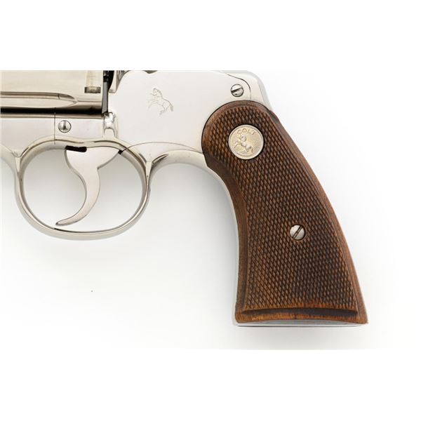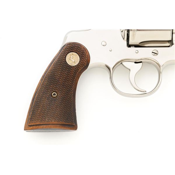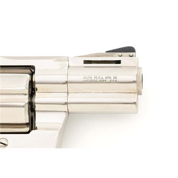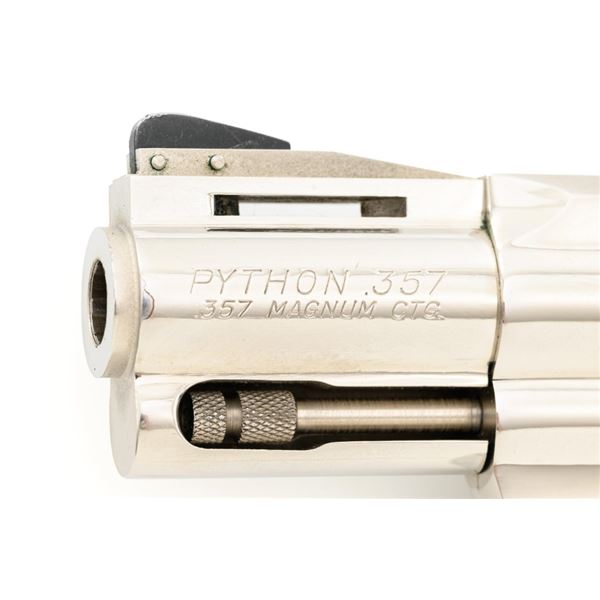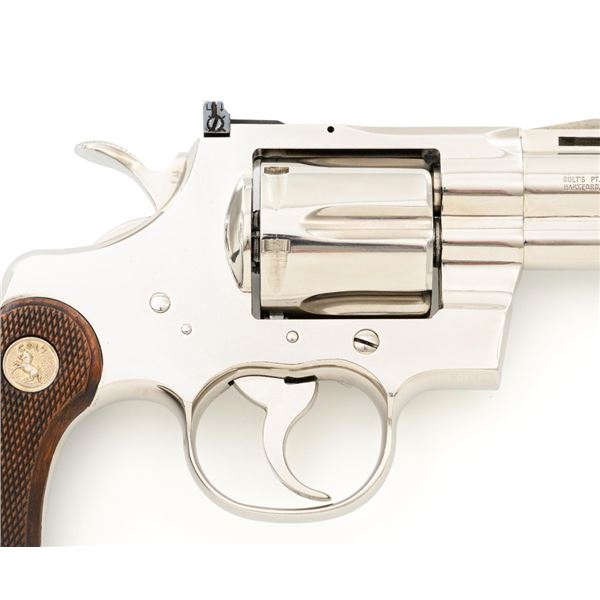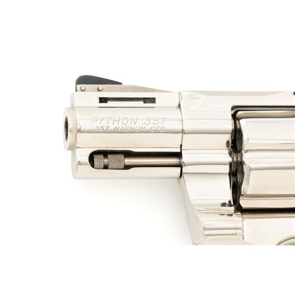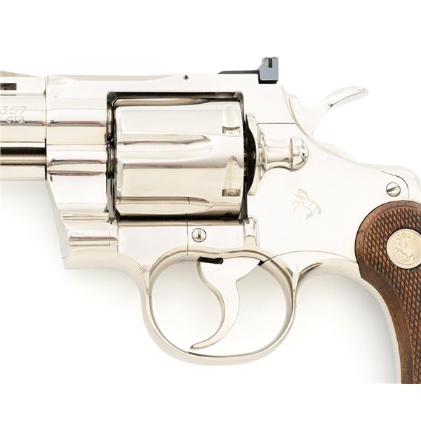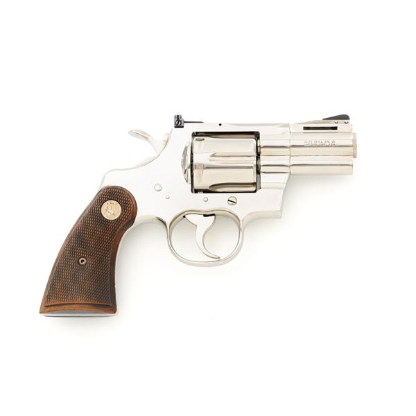Colt Python Double Action Revolver, #E43789, .357 Mag. cal., 2.5" vent rib barrel, nickel finish, checkered walnut two-piece grips with Colt medallions, ramped blade front sight, and adjustable square-notch rear sight. Mfgd 1972. Revolver is in near excellent overall condition, with light frosting at the muzzle and minor scratches, largest are at the butt. Cylinder shows minor leading edgewear and faint index. Factory markings are crisp, with Rampant Colt at the left rear of the frame. Grips are near excellent, with minor smoothing and edgewear. Action is crisp and locks up securely. Bore is bright with near excellent rifling. Est.: $2,500-$3,000. (C&R/PPT)