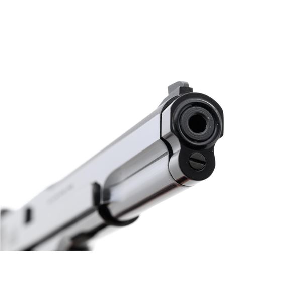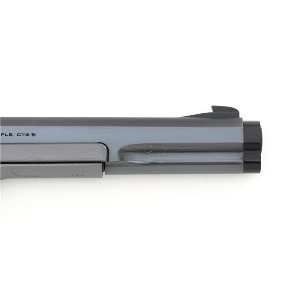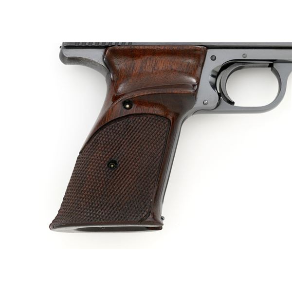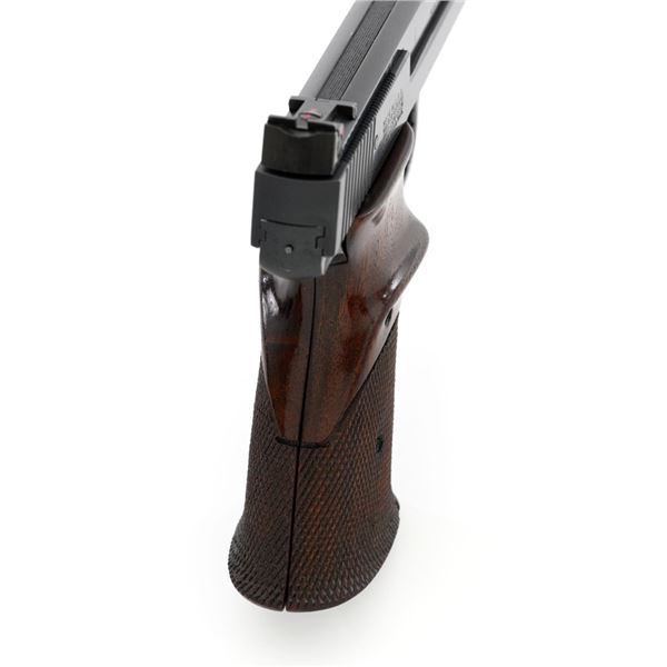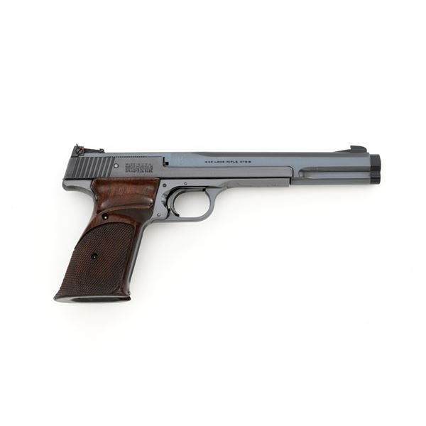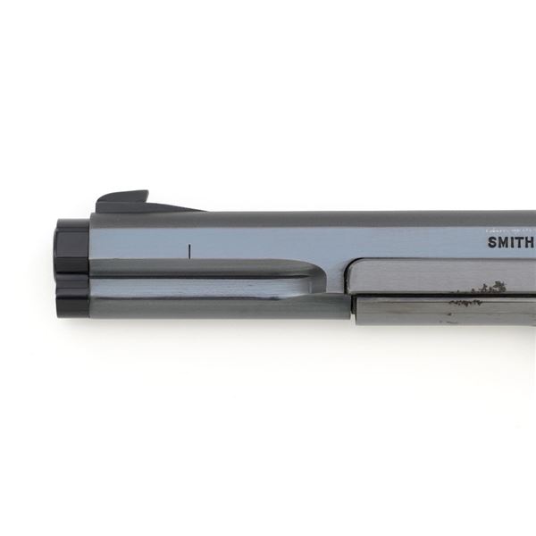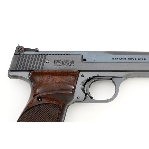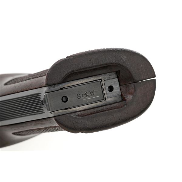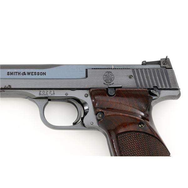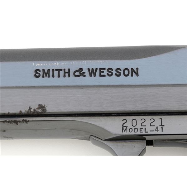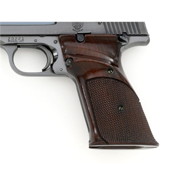 Early Smith & Wesson Model 41 Semi-Automatic Pistol, #20221, .22 LR cal., 7 3/8" barrel, blue finish, checkered walnut two-piece grips with thumb rest, ramped blade front sight, adjustable square-notch rear sight with two spots of added red paint, and includes one 10-round blue steel S&W magazine. Mfgd 1959. Pistol is in fine overall condition, retaining approx. 95%-96% factory blue, with a few scattered spots of mild pin prick pitting on left side of the frame/slide, and freckles of corrosion on the underside. Right side shows a series of light vertical scratches. Otherwise, grips are near excellent with scattered light indentations and handling marks. Action functions smoothly. Bore is near excellent with well-defined rifling. Est.: $800-$1,200. (C&R/PPT)