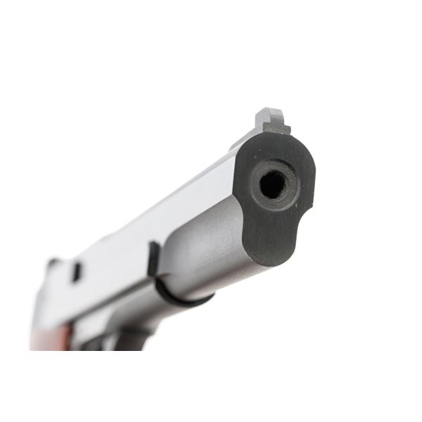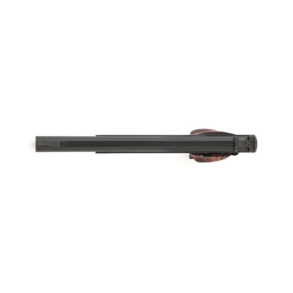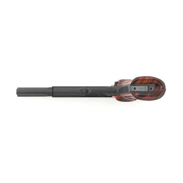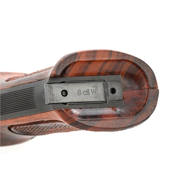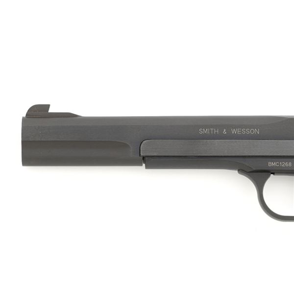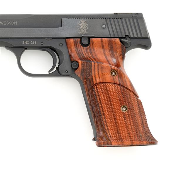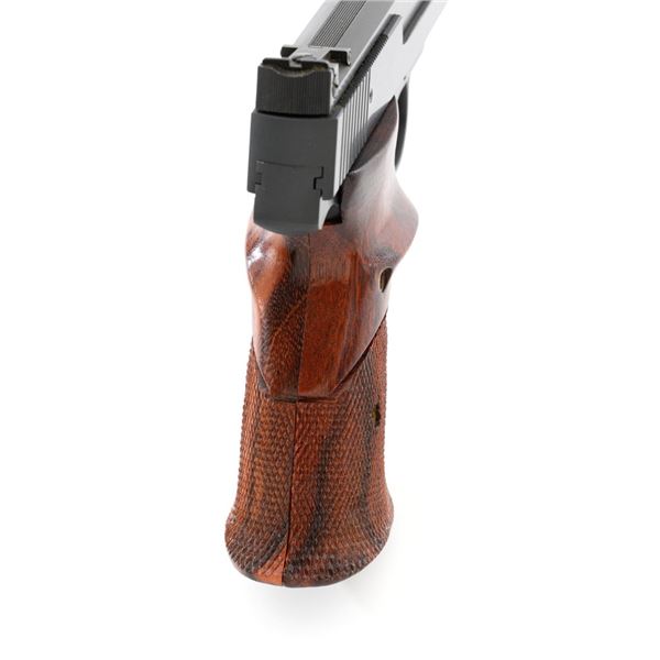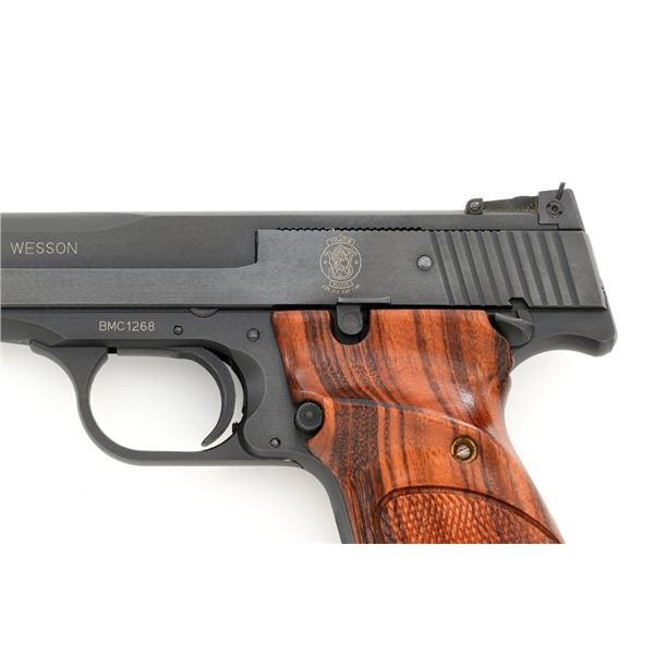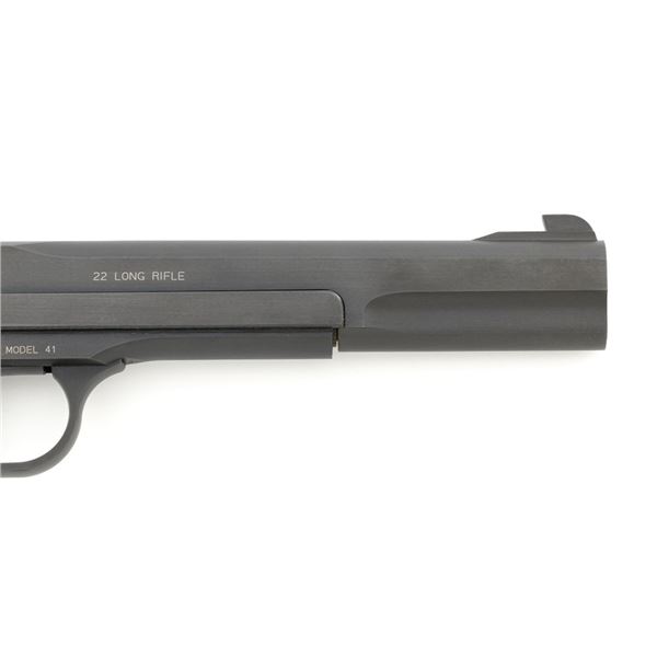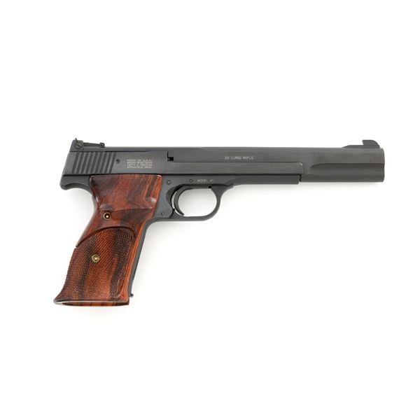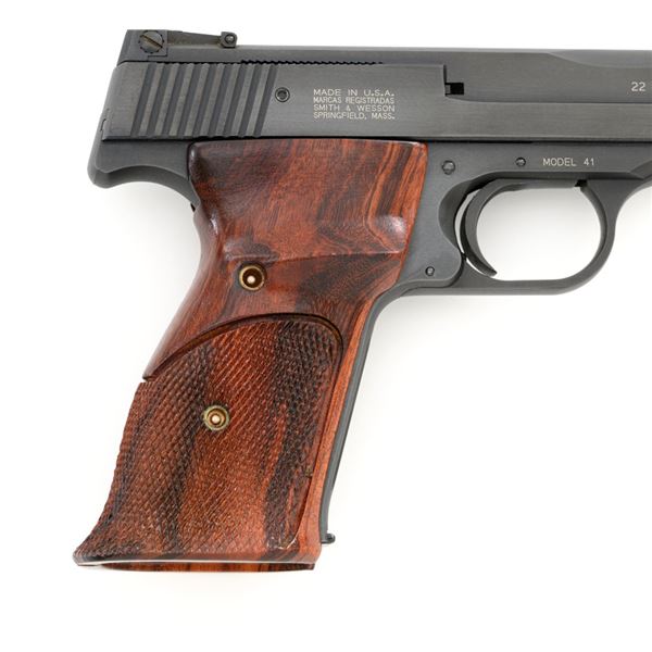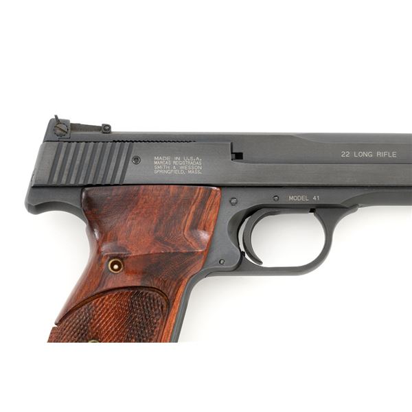 Smith & Wesson Model 41 Semi-Automatic Pistol, #BMC1268, .22 LR cal., 7" barrel, blue finish, checkered walnut two-piece grips with thumb rest, ramped blade front sight, and adjustable square-notch rear sight, with one 12-round blue steel S&W magazine. Mfgd 1993. Pistol is in excellent overall condition, retaining approx. 98%-99% factory finish, with only minor handling marks. Grips are excellent with sharp checkering, showing little use. Action functions well and locks up securely. Bore is mirror bright with excellent rifling. Est.: $800-$1,000. (Modern/PPT) (Magazines with a capacity greater than 10-rounds are not available for sale to CA residents or other states where such items are prohibited.)
