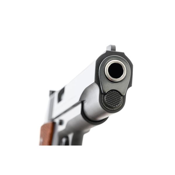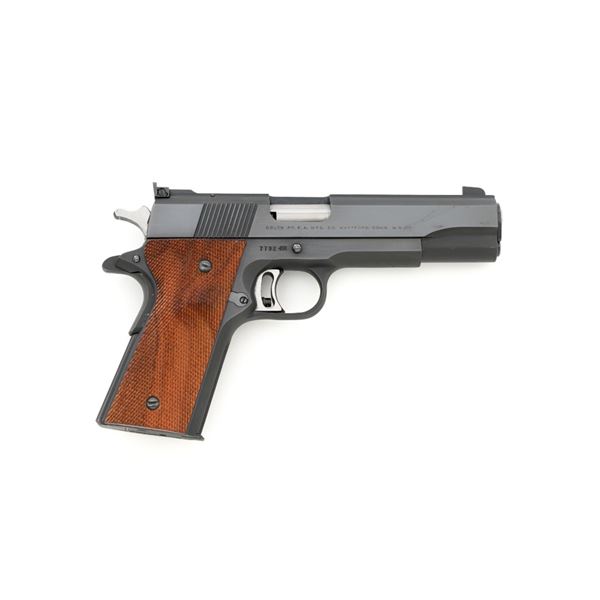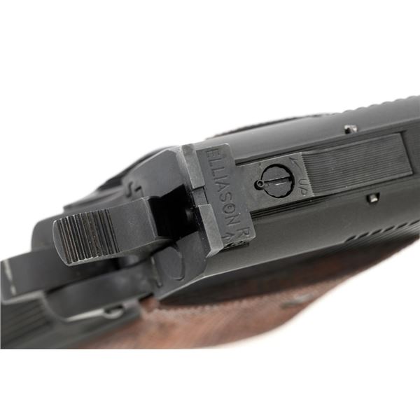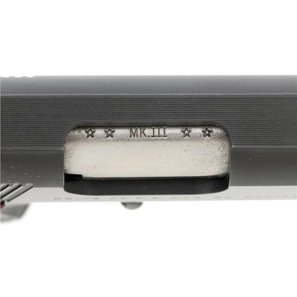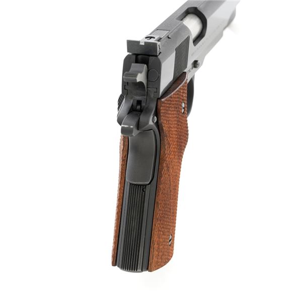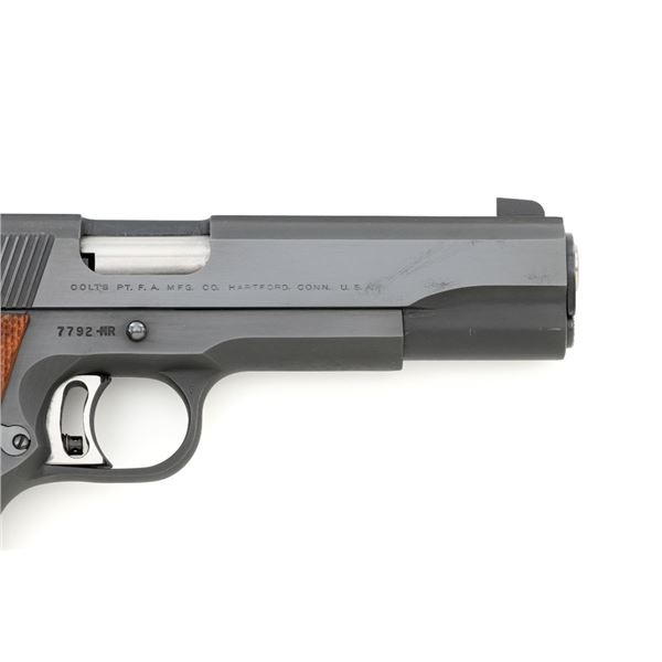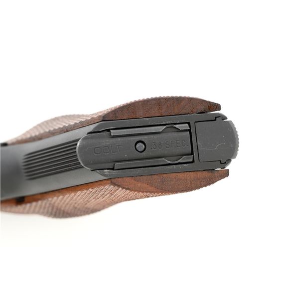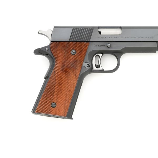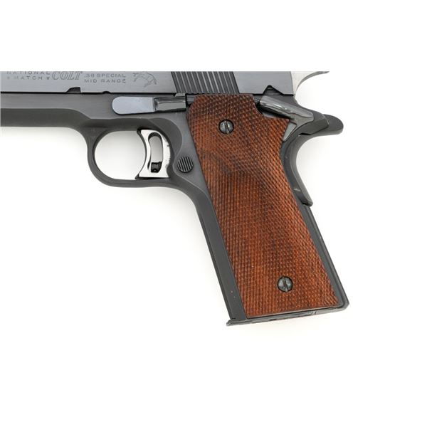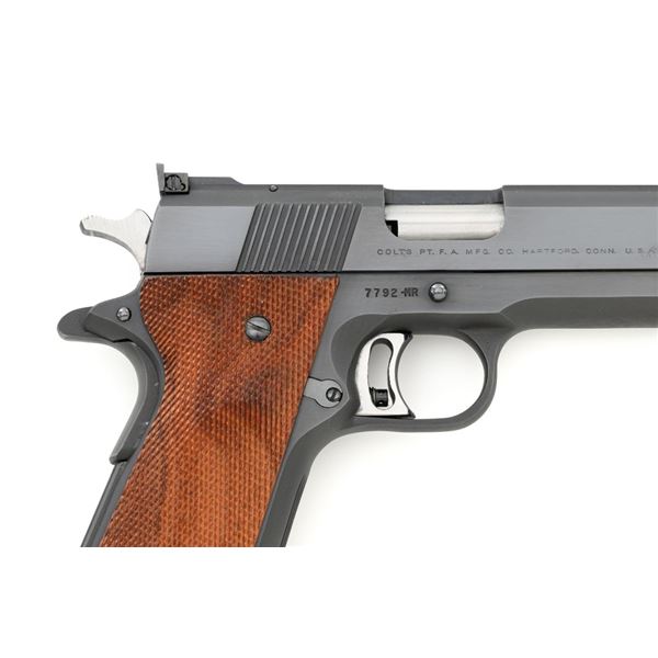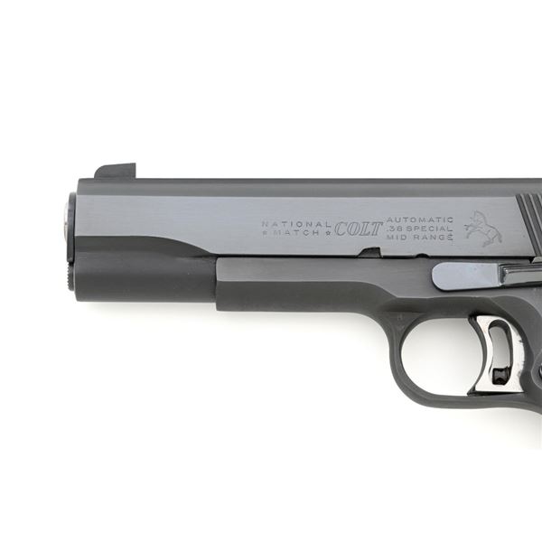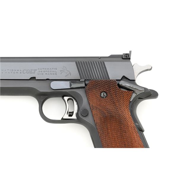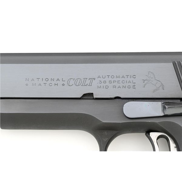 Colt MK III National Match Mid-Range Semi-Automatic Pistol, #7792-MR, .38 Spl. Mid-Range cal., 5" barrel marked "MK III" with stars, blue finish, checkered walnut two-piece grips with palm swell, blade front sight, Elliason adjustable square-notch rear sight, with an adjustable trigger. Includes one 5-round blue steel magazine, base is marked "COLT / .38 SPEC.". Mfgd 1971. Pistol is in excellent overall condition, retaining approx. 97%-98% factory blue, with light wear at the muzzle and minor edgewear. Factory lettering is clear. Grips are in excellent condition with crisp checkering detail. Action functions smoothly. Bore is near excellent with well-defined rifling. Est.: $1,600-$2,200. (C&R/PPT)