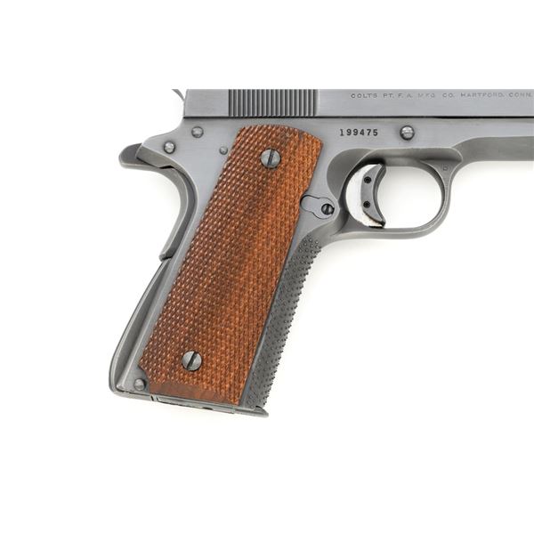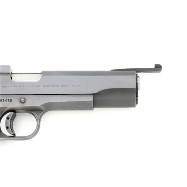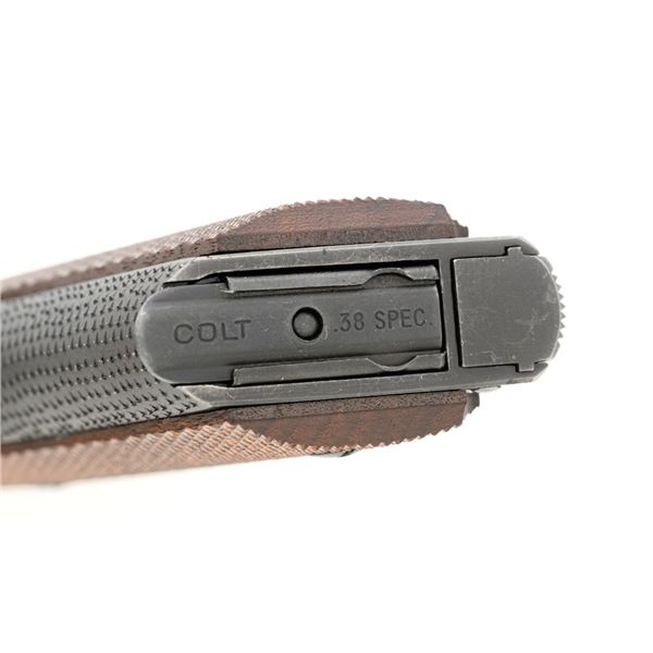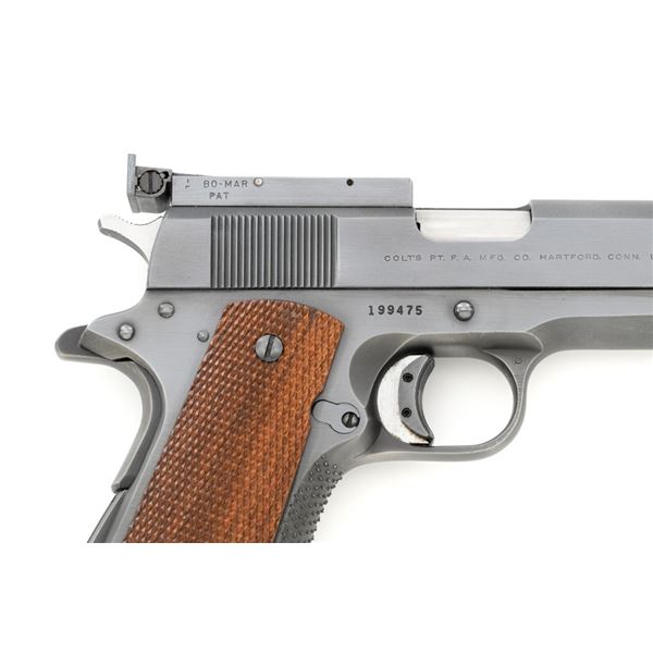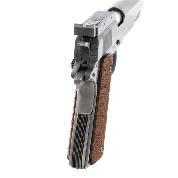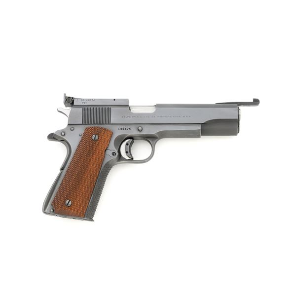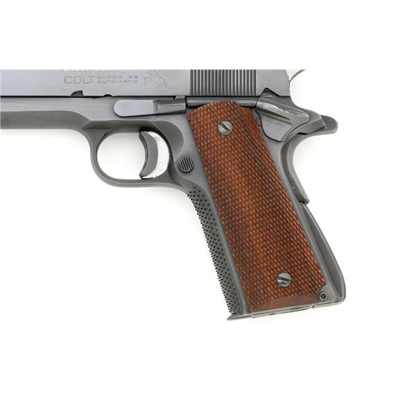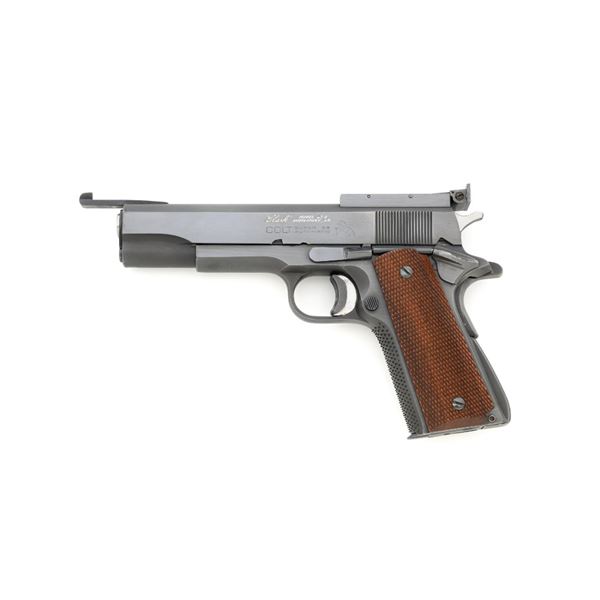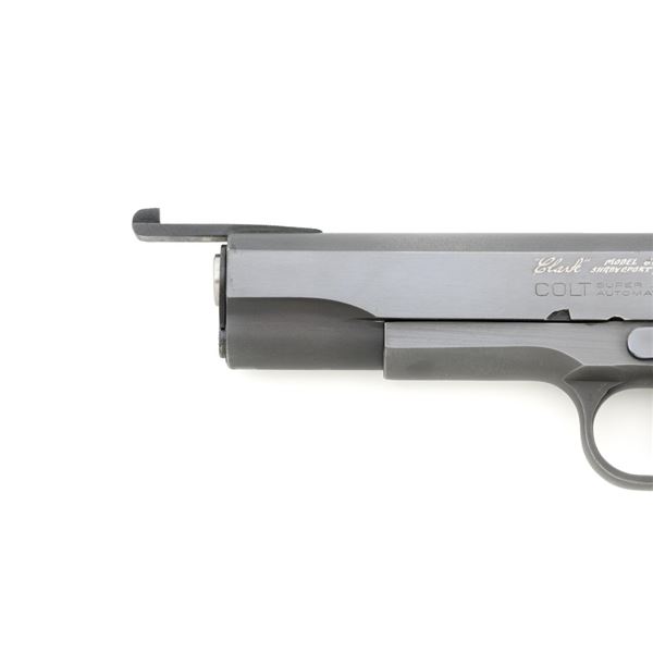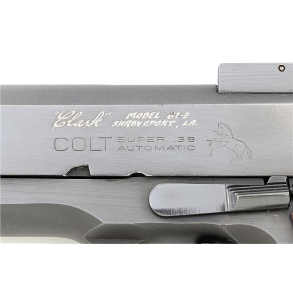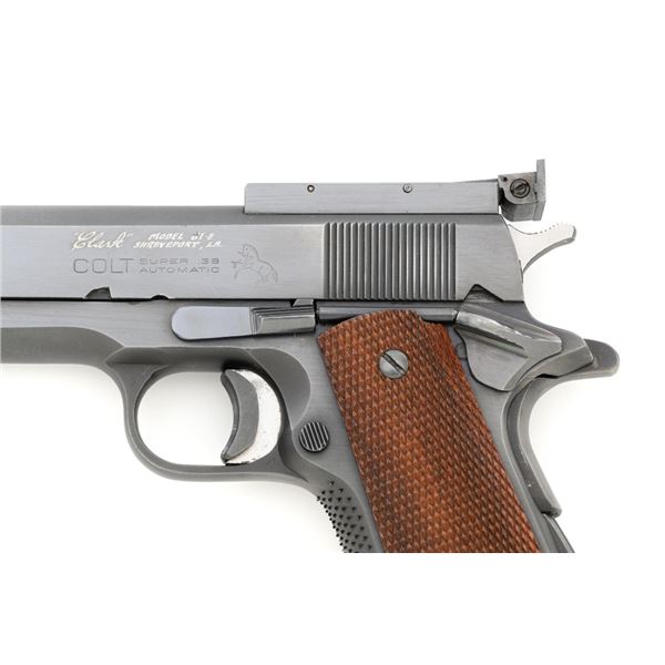 Custom Clark Model G1-E Colt Super .38 Semi-Automatic Pistol, #199475, .38 Super cal., 5" barrel is marked "Colt Super .38 Auto", blue finish, checkered walnut two-piece grips, extended blade front sight, Bo-Mar adjustable square-notch rear sight, tuned trigger with added shoe, with three (3) blued steel magazines marked "COLT / .38 SPEC.". Factory markings are clear, with "CLARK MODEL G1-E / SHREVEPORT, LA" in script on the slide. Mfgd 1968. Pistol is in near excellent overall condition as customized by Clark, retaining approx. 97%-98% blue, with intermittent light scratches and handling marks. Front grip strap features Clark "tiger tooth" stippling. Grips are in near excellent condition with sharp checkering detail. Action functions smoothly. Bore is near excellent with well-defined rifling. Est.: $1,500-$2,500. (C&R/PPT)