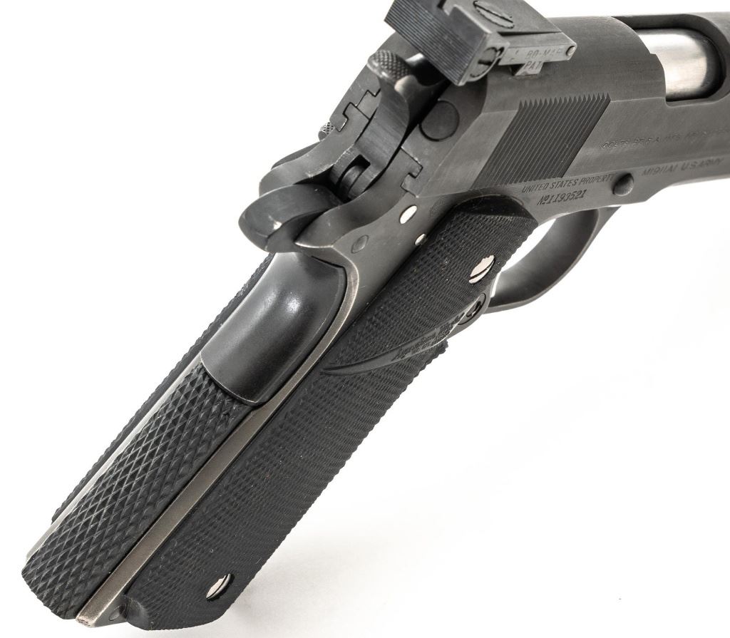 Custom Colt U.S. Property Marked 1911A1 Semi-Auto Pistol, #1193521, .45 ACP cal., 5" barrel, parkerized finish, checkered black rubber Pachmayr wraparound grips, checkered black rubber mainspring housing, high profile blade front, and Bo-Mar adjustable rear sight, barrel bushing marked "Micro" in script. Slide is a post-war Colt replacement with one-line Colt address on the right side, numbered "7790314"on the left side. Right rear of the frame with a partially visible "(crossed cannons)" ordnance symbol, with partial "G.H.D." inspection mark on the left side. Pistol also features a replacement heavy recoil spring and two (2) 7-round magazines, with the serial number etched into the bases, also marked #1 and #2. Included is the original barrel bushing and spring cap. Frame was mfgd 1943. Pistol is in near excellent overall condition, retaining approx. 95% metal finish, showing intermittent light marks and a few scratches from handling and use. There is some mild corrosion on the sides of the trigger. Grips show normal light handling wear. Action is slightly stuff but functions well. Bore is bright, displaying a little mild etching, with very good rifling. Est.: $1,000-$1,500. (C&R/PPT)