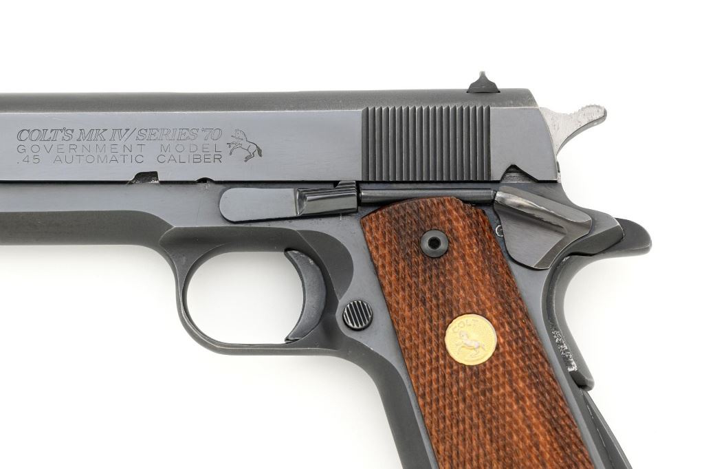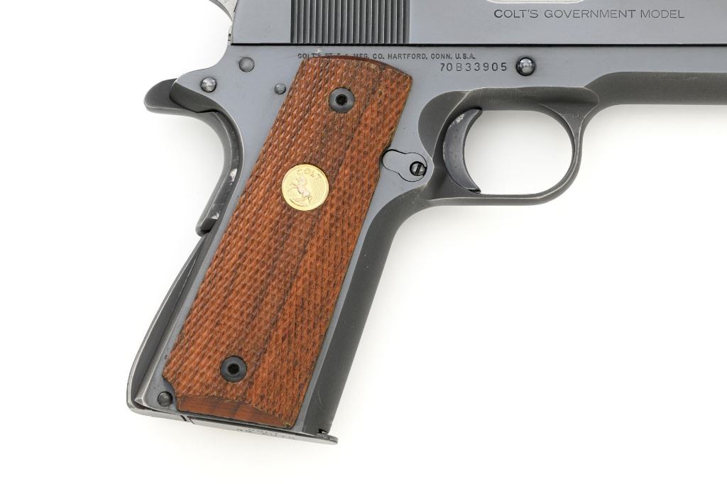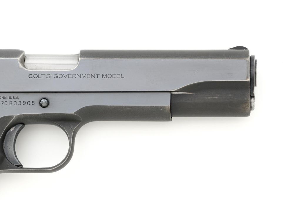 Colt MK IV Series 70 Government Model Semi-Automatic Pistol, #70B33905, .45 ACP cal., 5" barrel, blue finish, checkered walnut two-piece grips with Colt medallions, blade front sight (red/white paint added), and drift adjustable square-notch rear sight, with one 7-round blue steel Colt magazine. Magazine base is marked "COLT / 45 AUTO". Mfgd 1982. Pistol is in fine overall condition, retaining approx. 94%-95% factory blue with high point edgewear and scattered light scratches along the slide and frame. Straps show light edgewear with some loss of finish on the grip safety. Factory lettering is clear. Grips are in near excellent condition with fine checkering detail. Action functions smoothly. Bore is bright with well-defined rifling. Est.: $800-$1,200. (Modern/PPT)