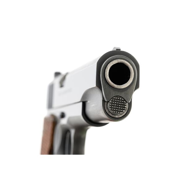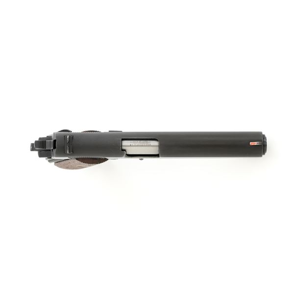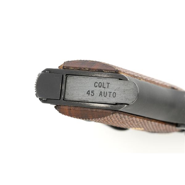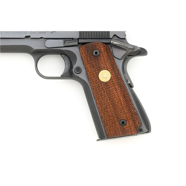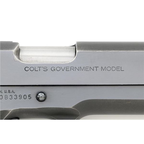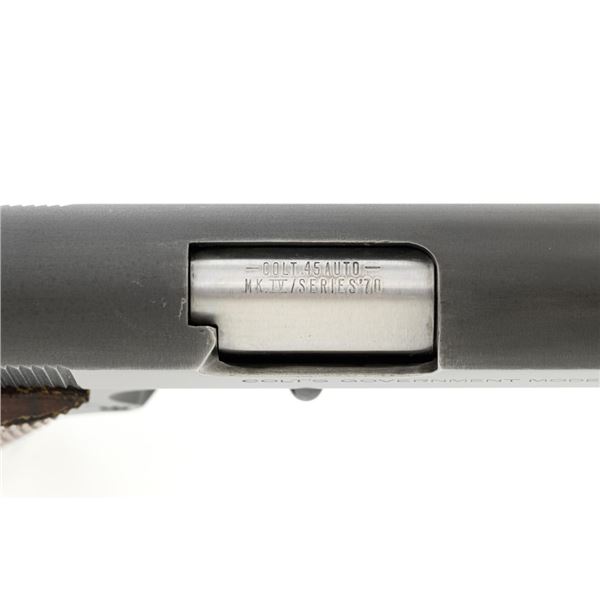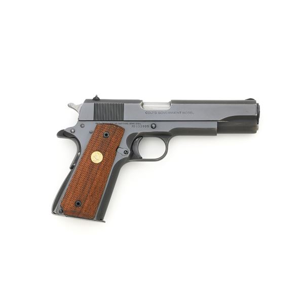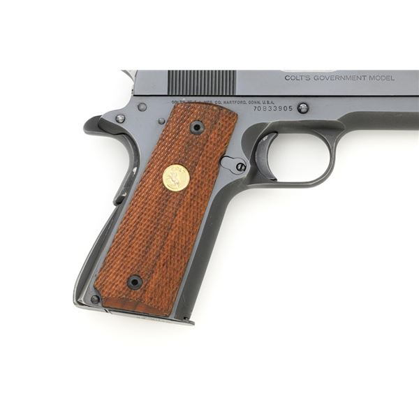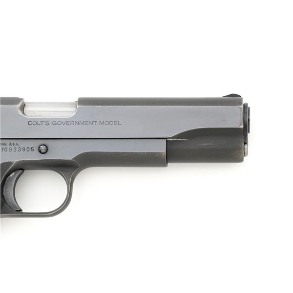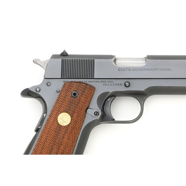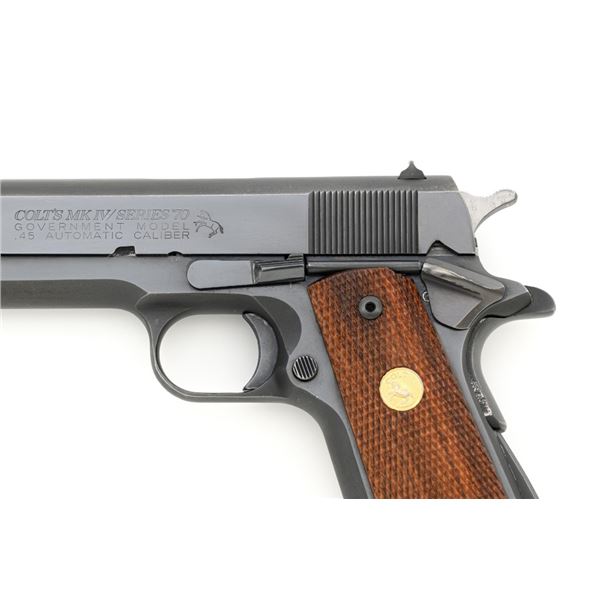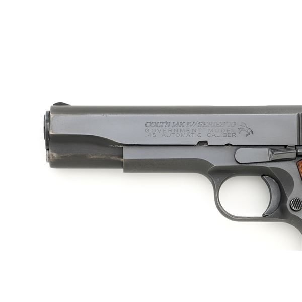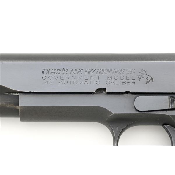Colt MK IV Series 70 Government Model Semi-Automatic Pistol, #70B33905, .45 ACP cal., 5" barrel, blue finish, checkered walnut two-piece grips with Colt medallions, blade front sight (red/white paint added), and drift adjustable square-notch rear sight, with one 7-round blue steel Colt magazine. Magazine base is marked "COLT / 45 AUTO". Mfgd 1982. Pistol is in fine overall condition, retaining approx. 94%-95% factory blue with high point edgewear and scattered light scratches along the slide and frame. Straps show light edgewear with some loss of finish on the grip safety. Factory lettering is clear. Grips are in near excellent condition with fine checkering detail. Action functions smoothly. Bore is bright with well-defined rifling. Est.: $800-$1,200. (Modern/PPT)