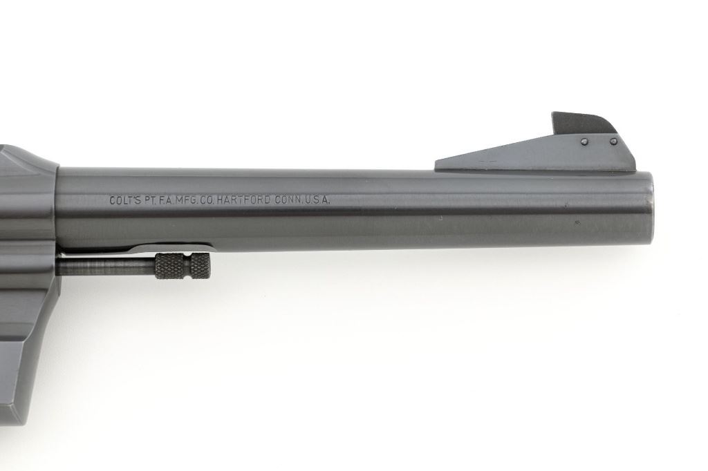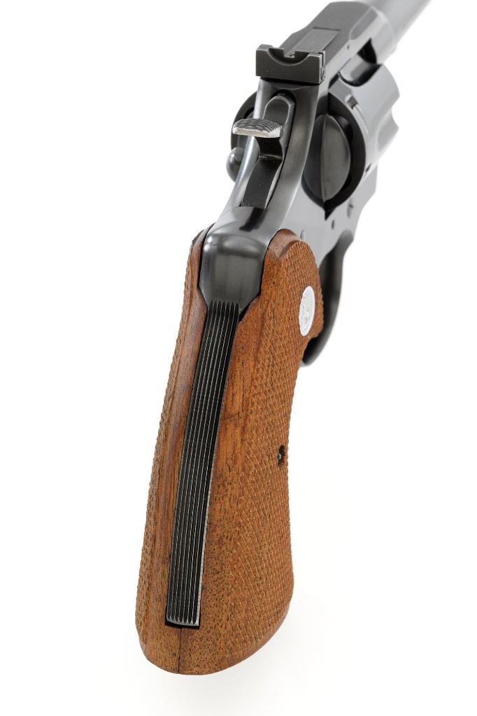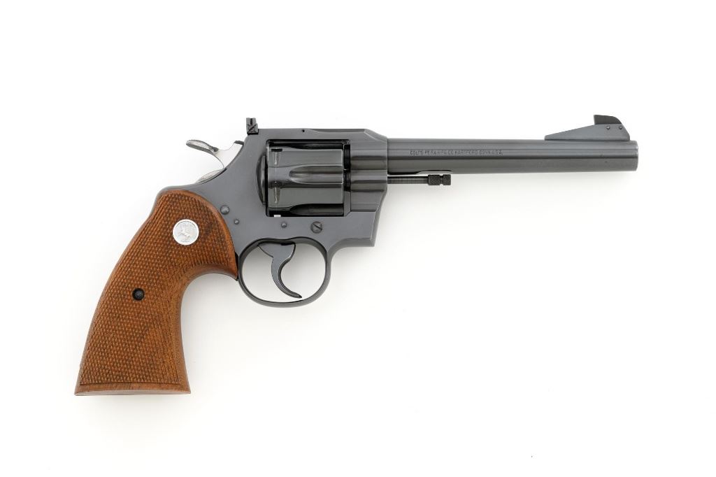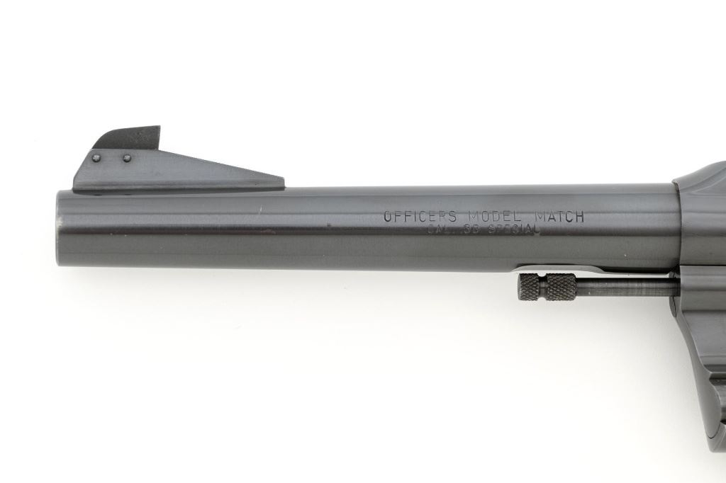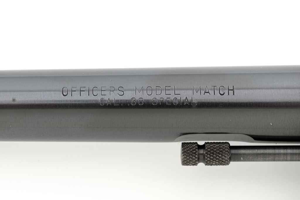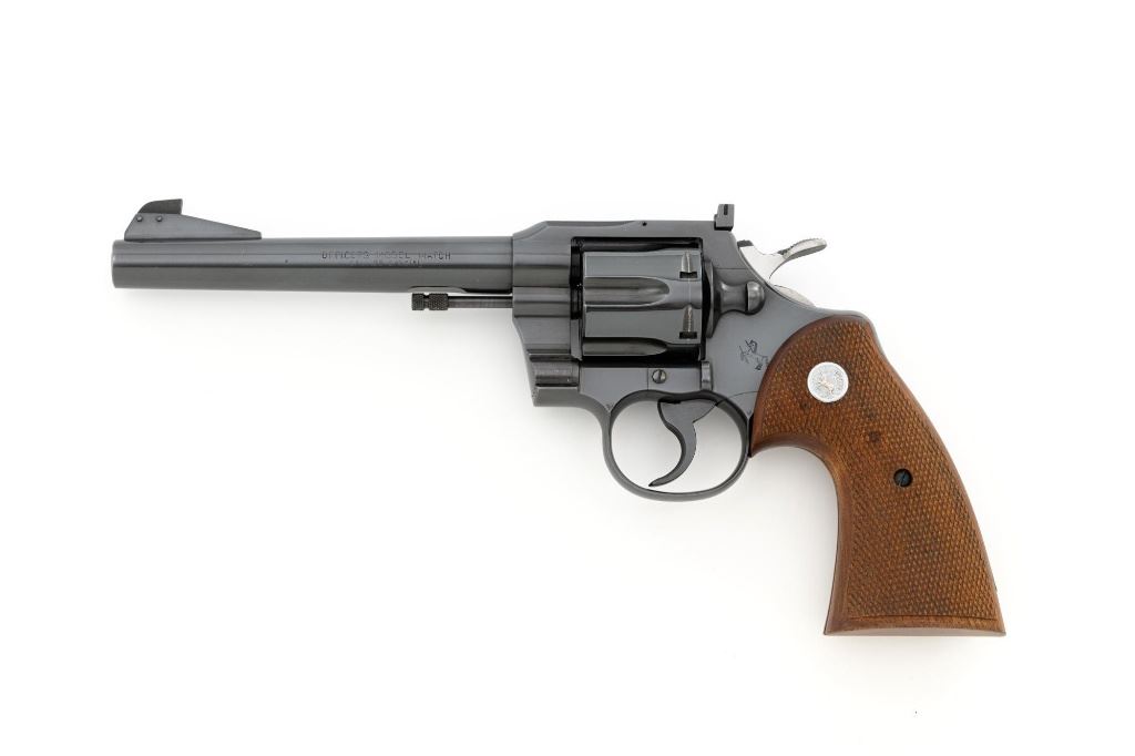 Colt Officers Model Match 5th Issue Double Action Revolver, #912798, .38 Spl. cal., 6" tapered heavy barrel, blue finish, checkered walnut two-piece target grips with Colt medallions, serrated ramped blade front and Accro micrometer adjustable rear sights, with wide target hammer, and factory ribbed trigger. Mfgd 1965. Revolver is in excellent overall condition, retaining approx. 97%-98% factory finish, with light wear at the muzzle and minor handling marks. Cylinder shows modest leading edgewear and a faint index line. Grips are in excellent condition with fine checkering detail and fit. Action is crisp and locks up securely. Bore is excellent, showing little use. Est.: $700-$900. (C&R)