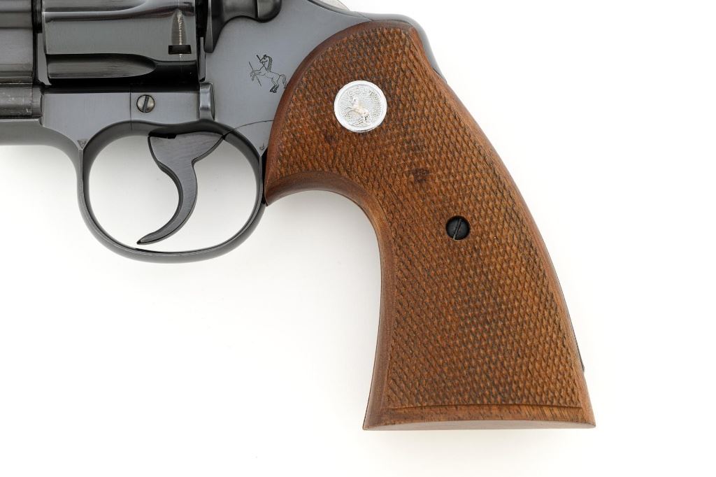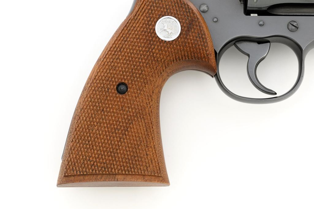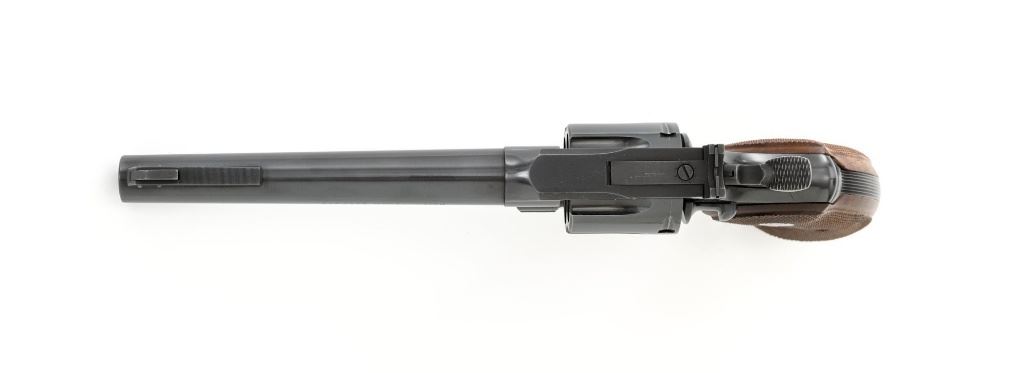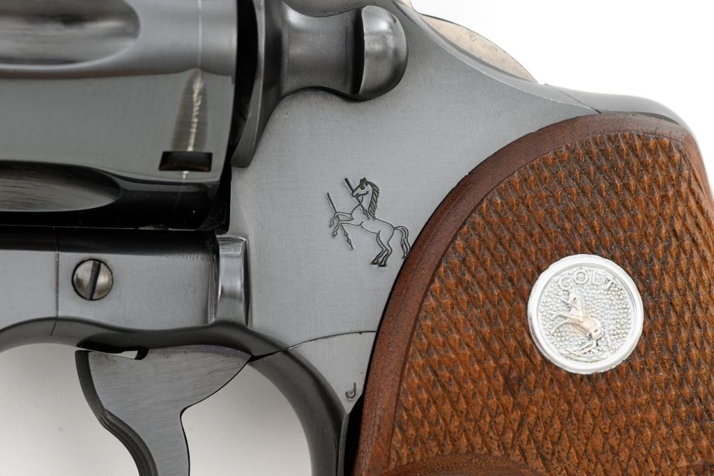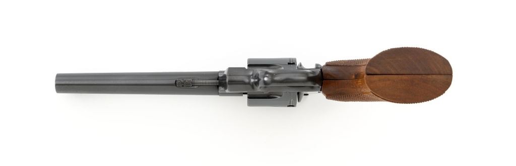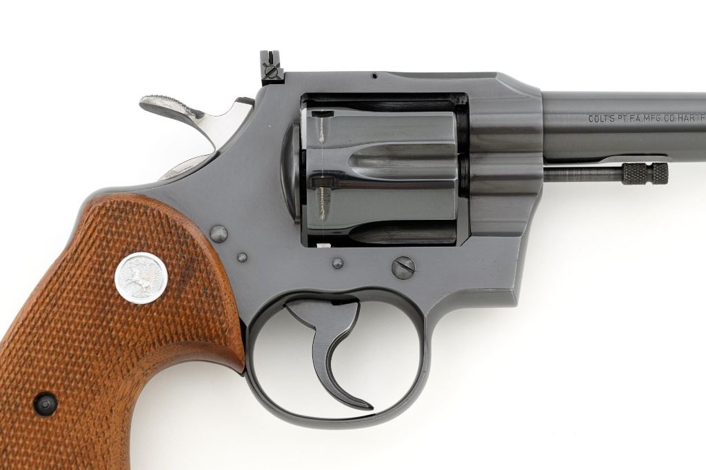 Colt Officers Model Match 5th Issue Double Action Revolver, #912798, .38 Spl. cal., 6" tapered heavy barrel, blue finish, checkered walnut two-piece target grips with Colt medallions, serrated ramped blade front and Accro micrometer adjustable rear sights, with wide target hammer, and factory ribbed trigger. Mfgd 1965. Revolver is in excellent overall condition, retaining approx. 97%-98% factory finish, with light wear at the muzzle and minor handling marks. Cylinder shows modest leading edgewear and a faint index line. Grips are in excellent condition with fine checkering detail and fit. Action is crisp and locks up securely. Bore is excellent, showing little use. Est.: $700-$900. (C&R)