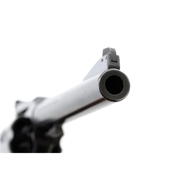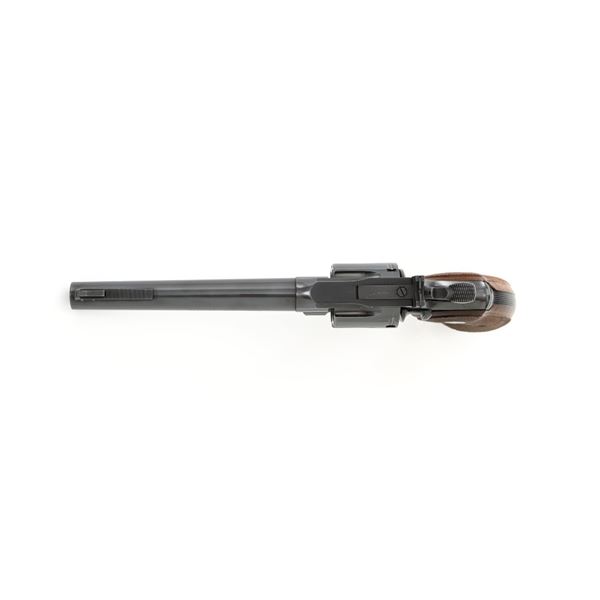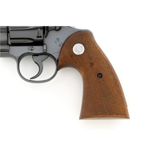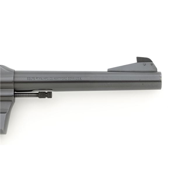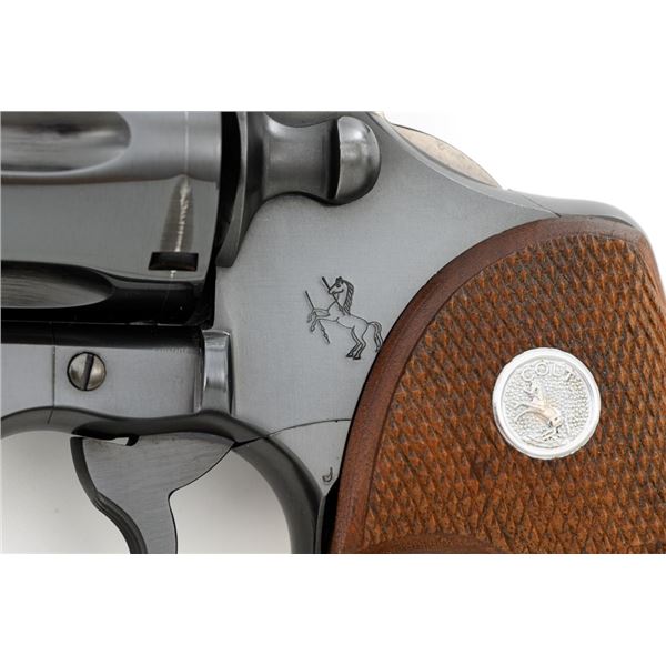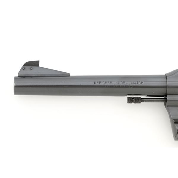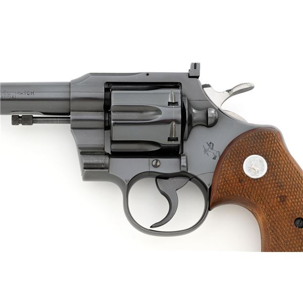 Colt Officers Model Match 5th Issue Double Action Revolver, #912798, .38 Spl. cal., 6" tapered heavy barrel, blue finish, checkered walnut two-piece target grips with Colt medallions, serrated ramped blade front and Accro micrometer adjustable rear sights, with wide target hammer, and factory ribbed trigger. Mfgd 1965. Revolver is in excellent overall condition, retaining approx. 97%-98% factory finish, with light wear at the muzzle and minor handling marks. Cylinder shows modest leading edgewear and a faint index line. Grips are in excellent condition with fine checkering detail and fit. Action is crisp and locks up securely. Bore is excellent, showing little use. Est.: $700-$900. (C&R)