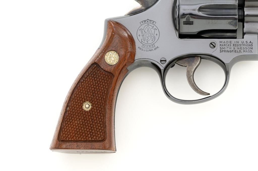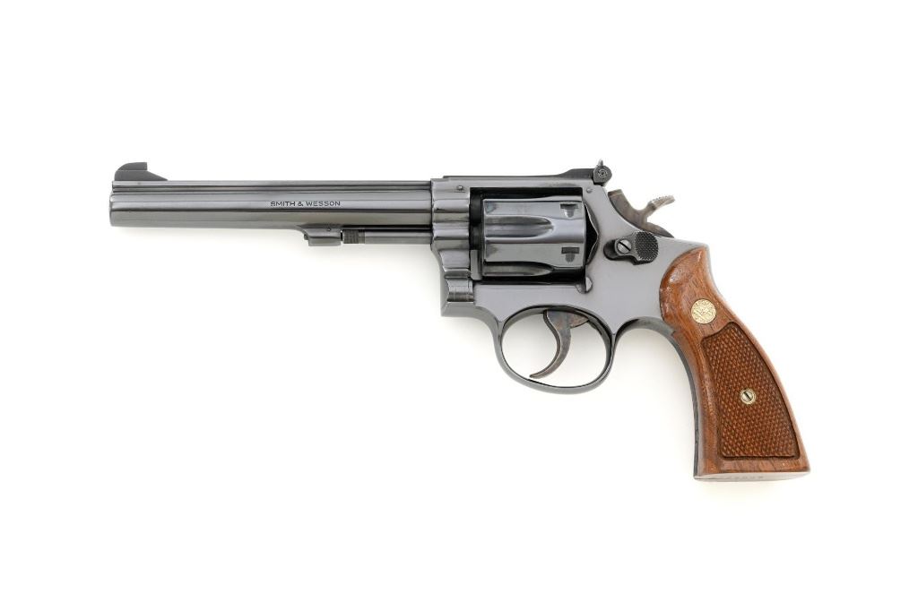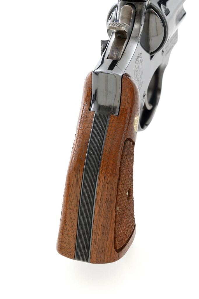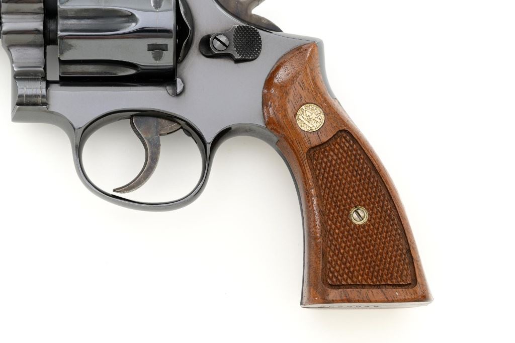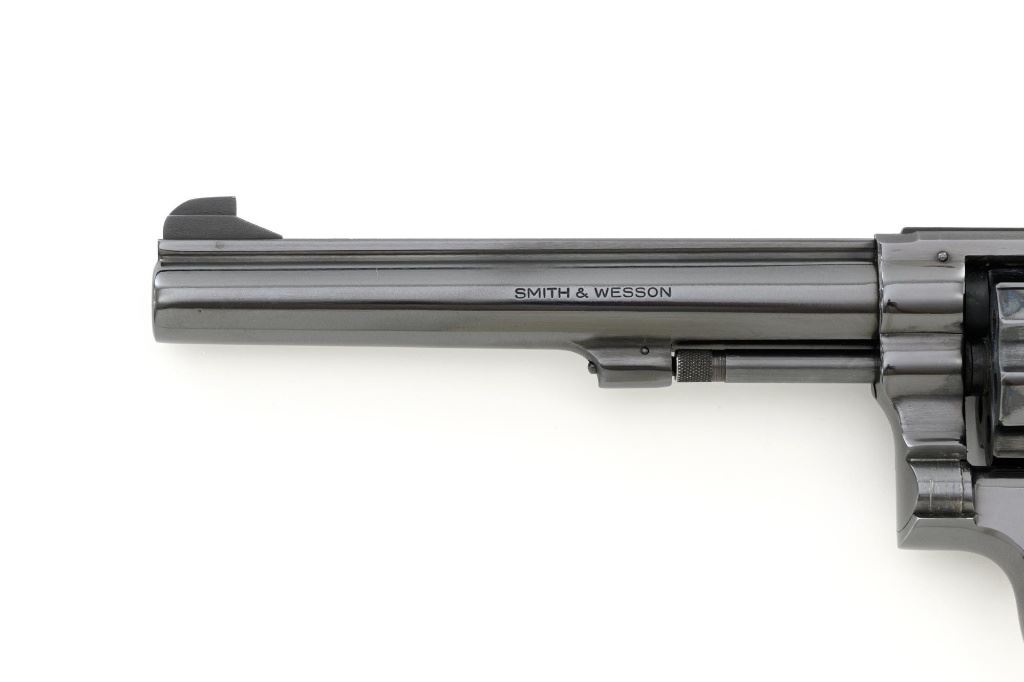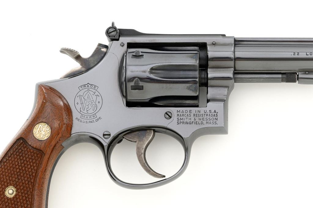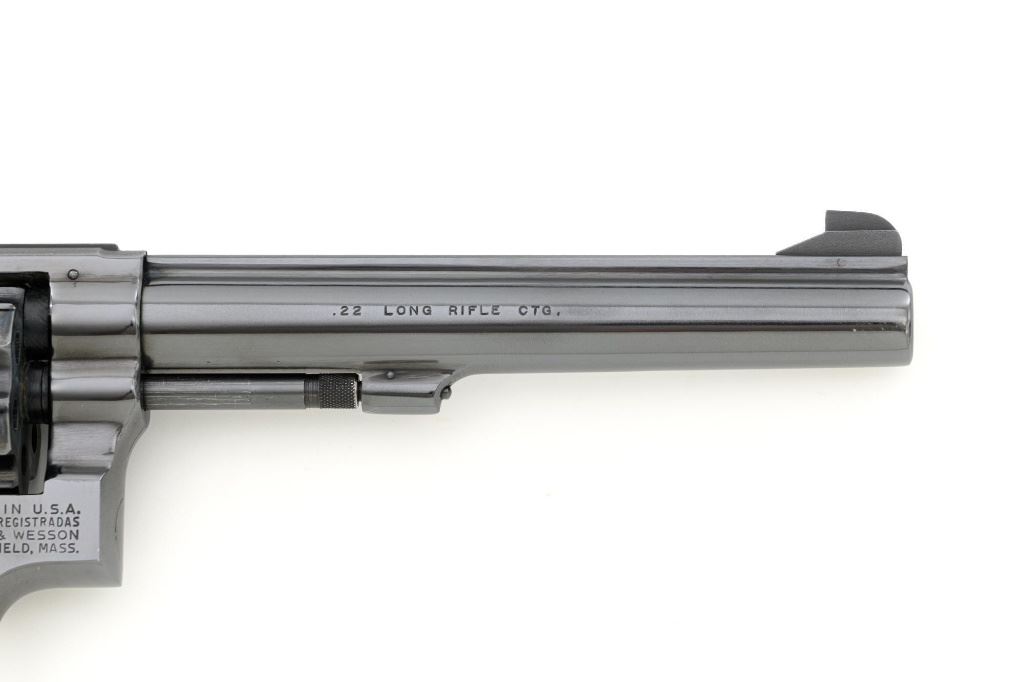 Smith & Wesson Model 17-3 Double Action Revolver, #3K28949, .22 LR cal., 6" pinned barrel, blue finish, checkered two-piece walnut grips with S&W medallions, Patridge front sight, adjustable square-notch rear sight, with color case hardened hammer and trigger. Mfgd 1971. Revolver is in excellent overall condition, retaining approx. 98%-99% factory blue, with light handling marks, and a faint index line on the cylinder. Grips are in excellent condition with sharp checkering detail. Interior of the right panel is stamped with the matching serial number. Action is crisp and locks up securely. Bore is mirror bright with excellent rifling, showing little use. Est.: $600-$800. (C&R/PPT)