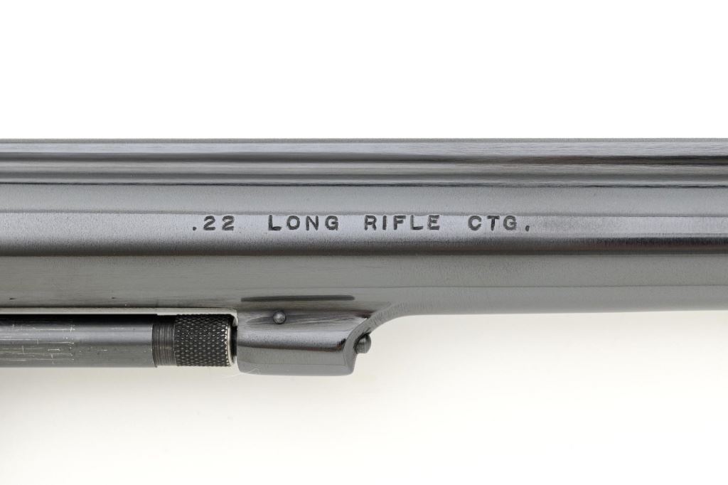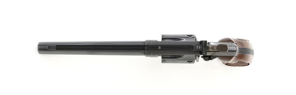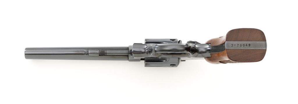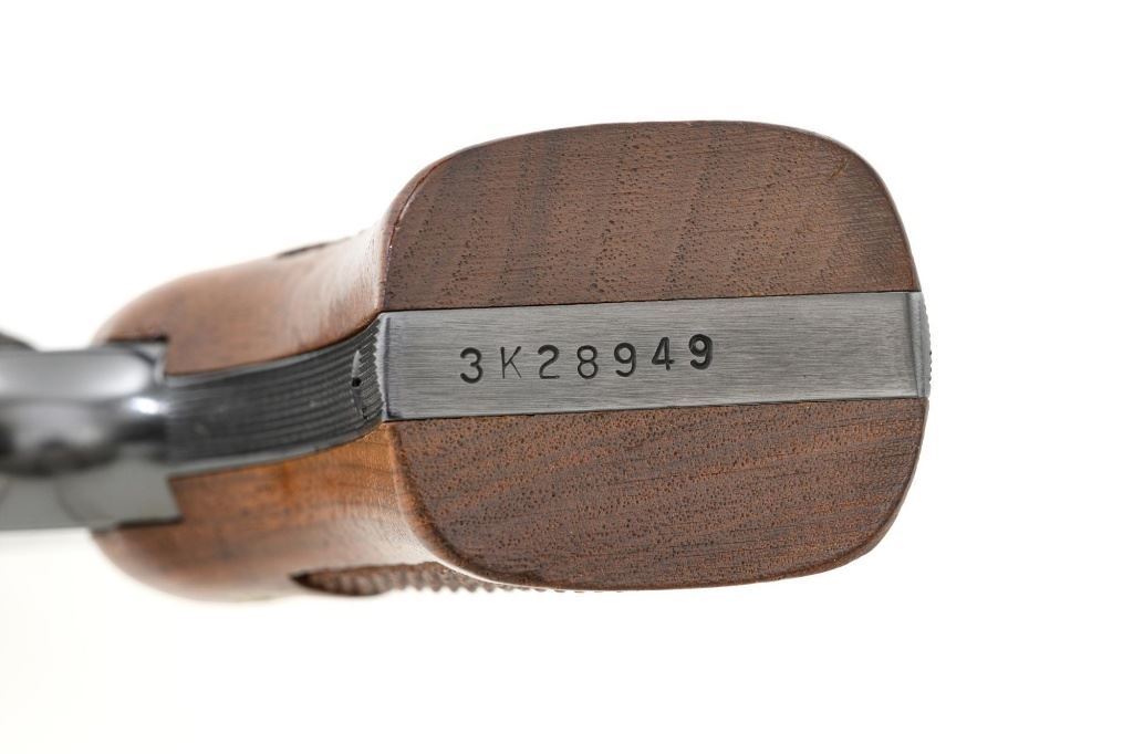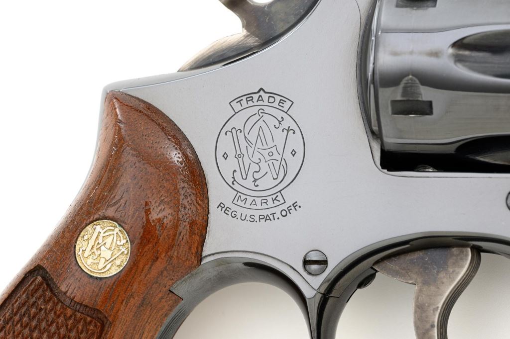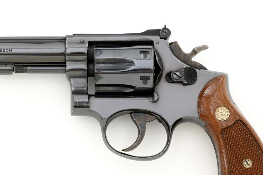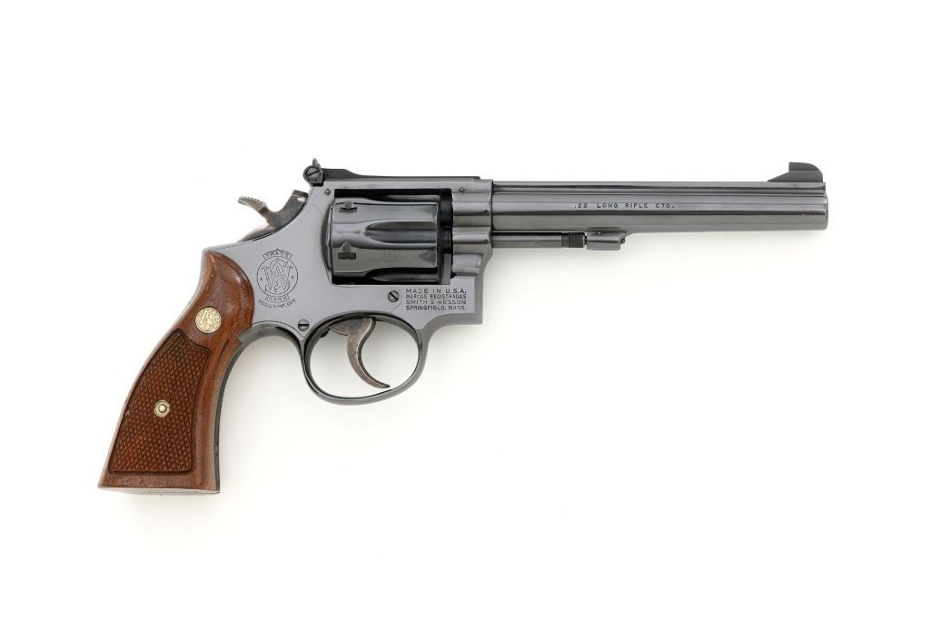 Smith & Wesson Model 17-3 Double Action Revolver, #3K28949, .22 LR cal., 6" pinned barrel, blue finish, checkered two-piece walnut grips with S&W medallions, Patridge front sight, adjustable square-notch rear sight, with color case hardened hammer and trigger. Mfgd 1971. Revolver is in excellent overall condition, retaining approx. 98%-99% factory blue, with light handling marks, and a faint index line on the cylinder. Grips are in excellent condition with sharp checkering detail. Interior of the right panel is stamped with the matching serial number. Action is crisp and locks up securely. Bore is mirror bright with excellent rifling, showing little use. Est.: $600-$800. (C&R/PPT)
