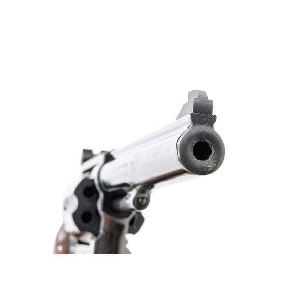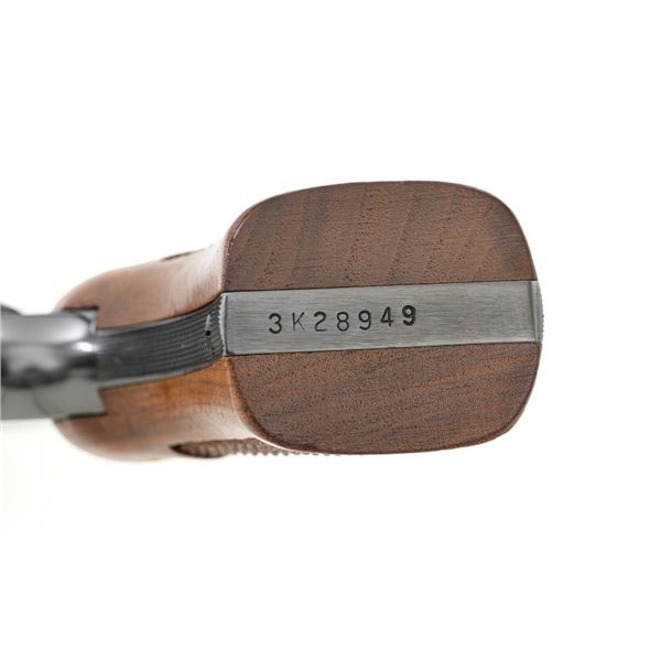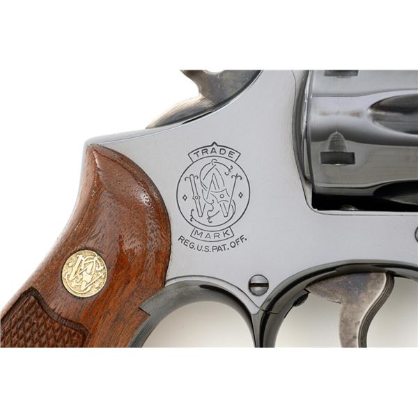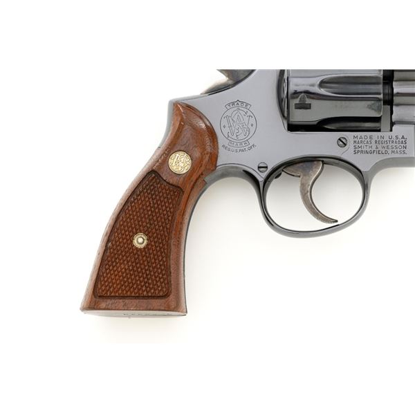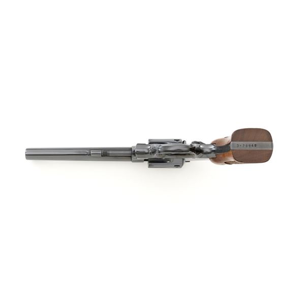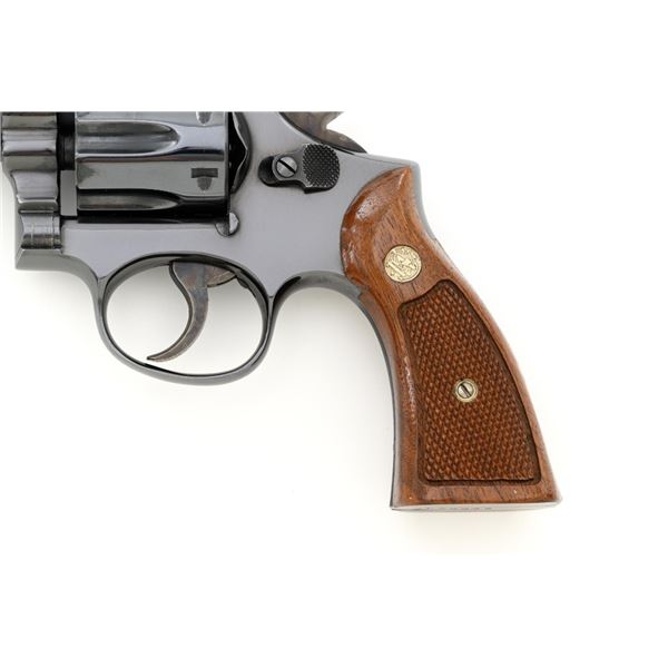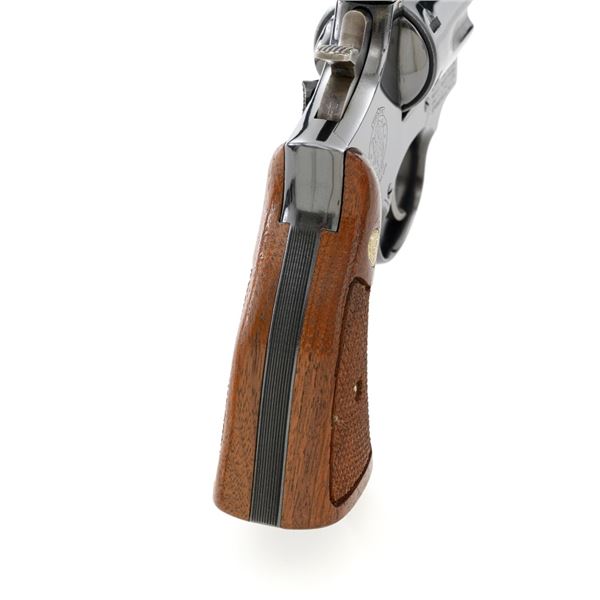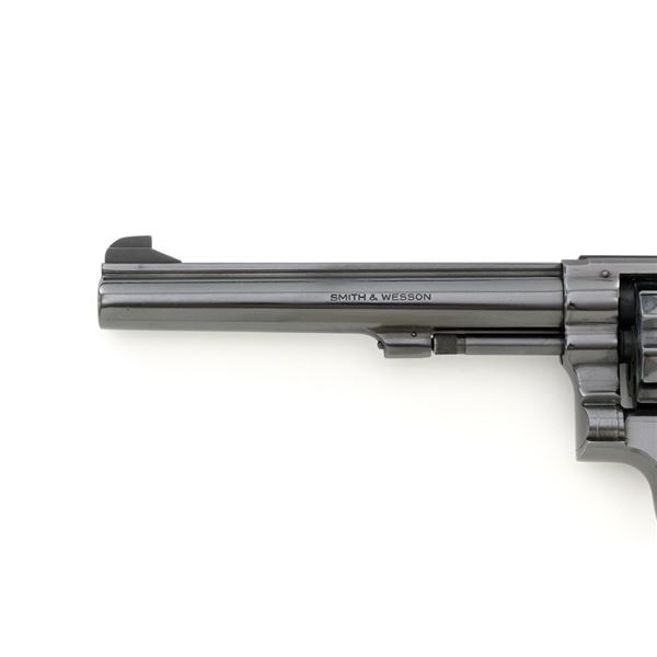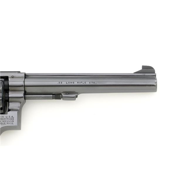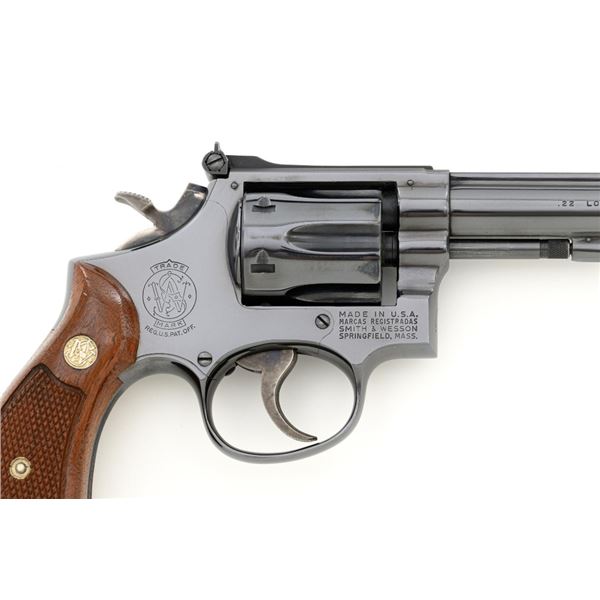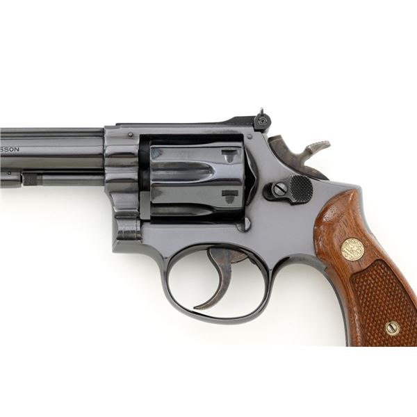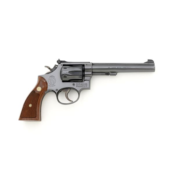 Smith & Wesson Model 17-3 Double Action Revolver, #3K28949, .22 LR cal., 6" pinned barrel, blue finish, checkered two-piece walnut grips with S&W medallions, Patridge front sight, adjustable square-notch rear sight, with color case hardened hammer and trigger. Mfgd 1971. Revolver is in excellent overall condition, retaining approx. 98%-99% factory blue, with light handling marks, and a faint index line on the cylinder. Grips are in excellent condition with sharp checkering detail. Interior of the right panel is stamped with the matching serial number. Action is crisp and locks up securely. Bore is mirror bright with excellent rifling, showing little use. Est.: $600-$800. (C&R/PPT)