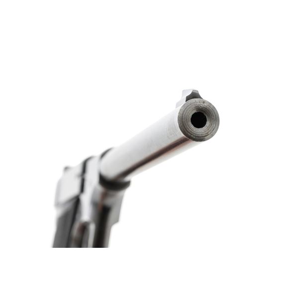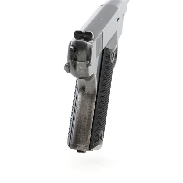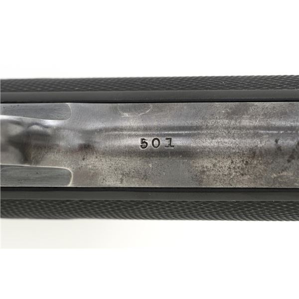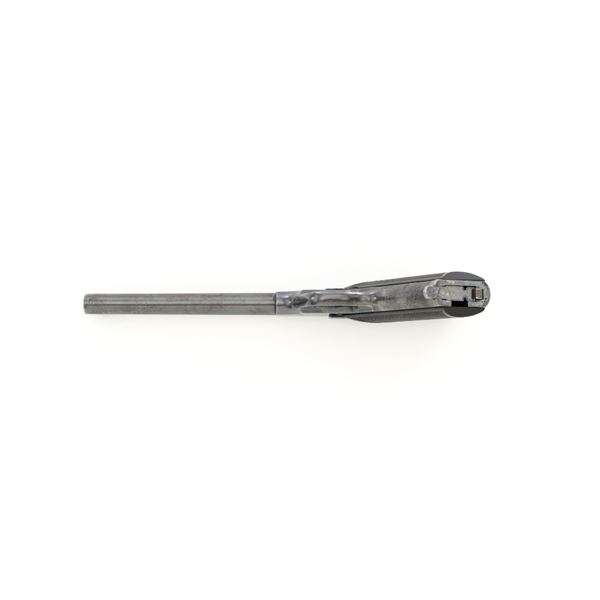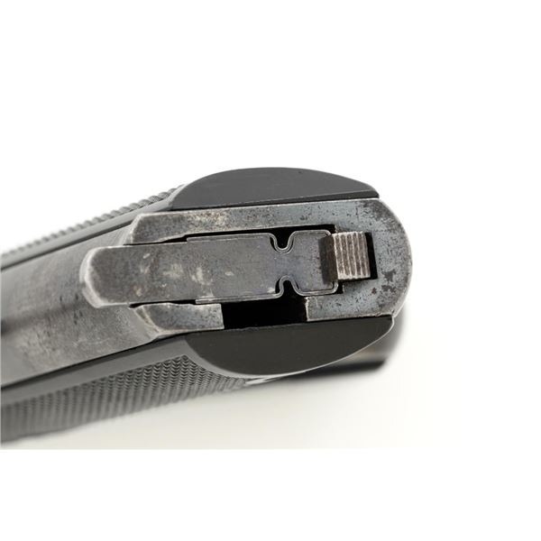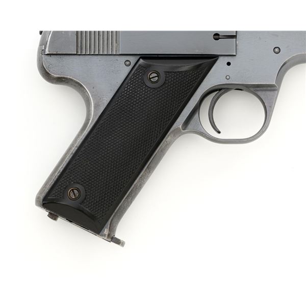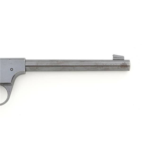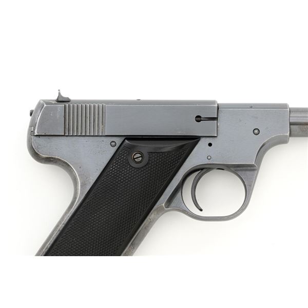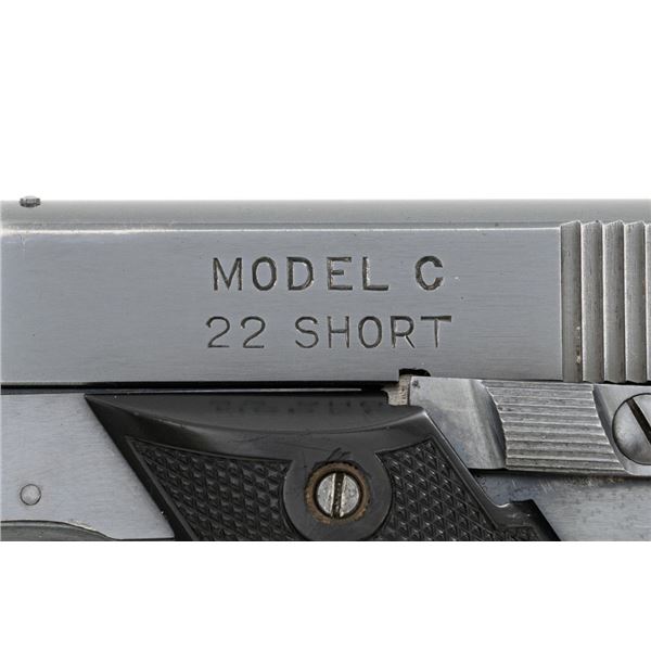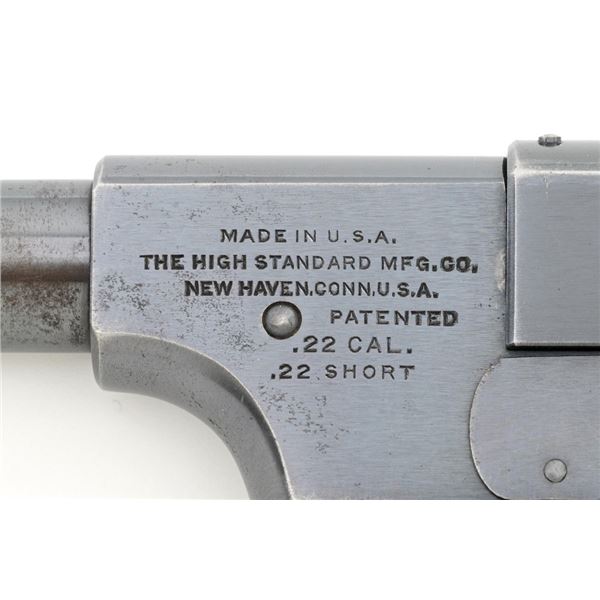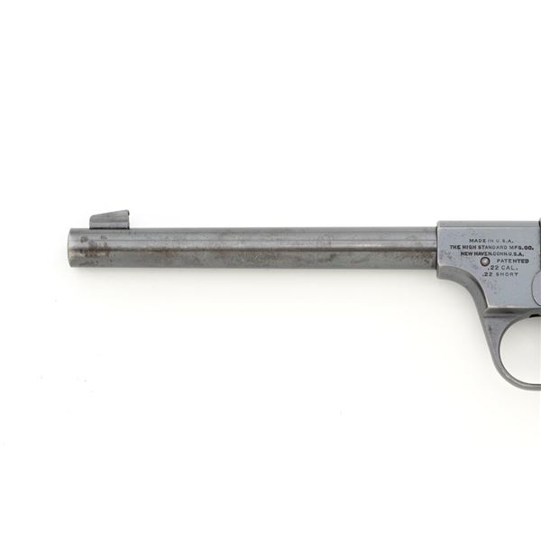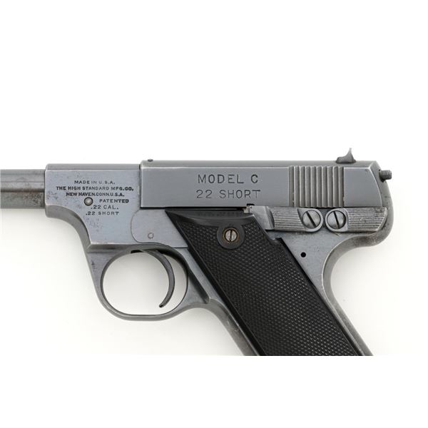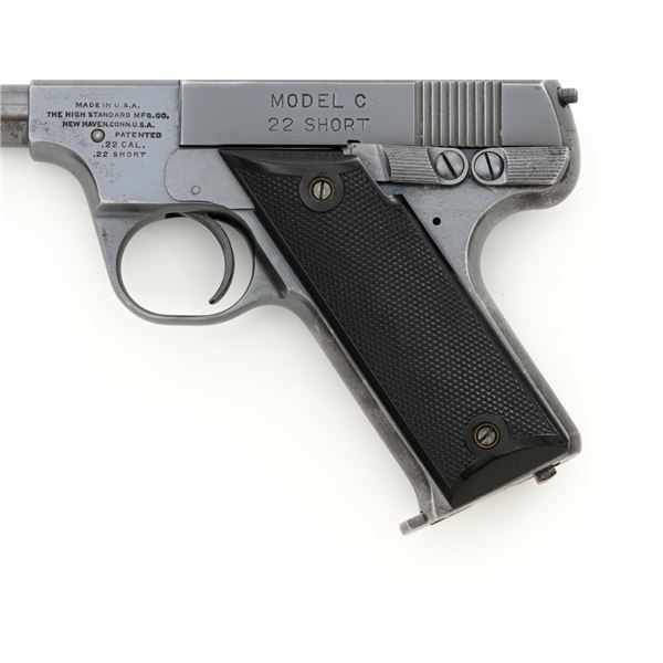 Scarce Early High Standard Model C Semi-Automatic Pistol, #501, .22 Short cal., 6.75" lightweight barrel, blue finish, checkered hard rubber two-piece grips, serrated blade front and fixed rear sights, with one unmarked two-tone 10-round magazine. Factory markings are clear, with "MADE IN U.S.A./THE HIGH STANDARD MFG. CO./NEW HAVEN CONN. U.S.A./PATENTED" on the left barrel lug. Mfgd in 1936, the first year of production. Pistol is in fine overall condition, retaining approx. 88%-90% factory blue, with wear at the muzzle, spots of toning and thinning finish along the barrel. Frame and slide show high point edgewear and light marks. Checkered hard rubber grips are in fine condition and fit well. Action functions well. Bore is very good with defined rifling. Earlier production of the Model C had a separate serial number series beginning with 500 through 3,116, after which it joined the regular series. This pistol appears to be the 2nd produced, based on the serial number. Est.: $750-$1,000. (C&R)