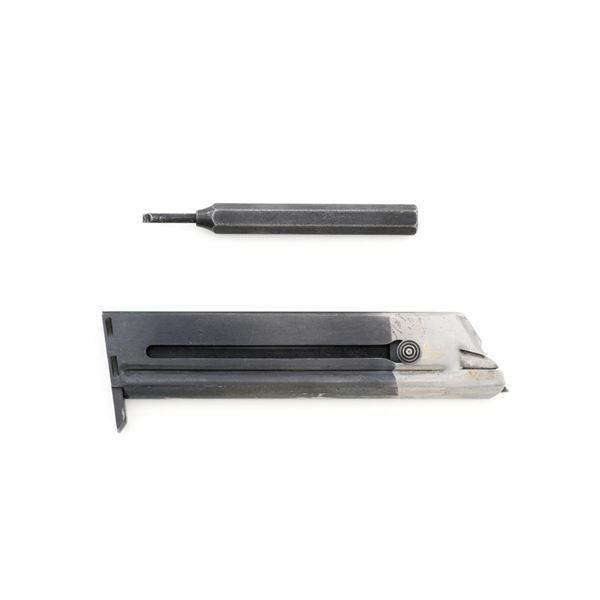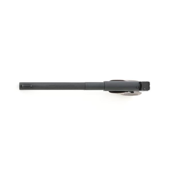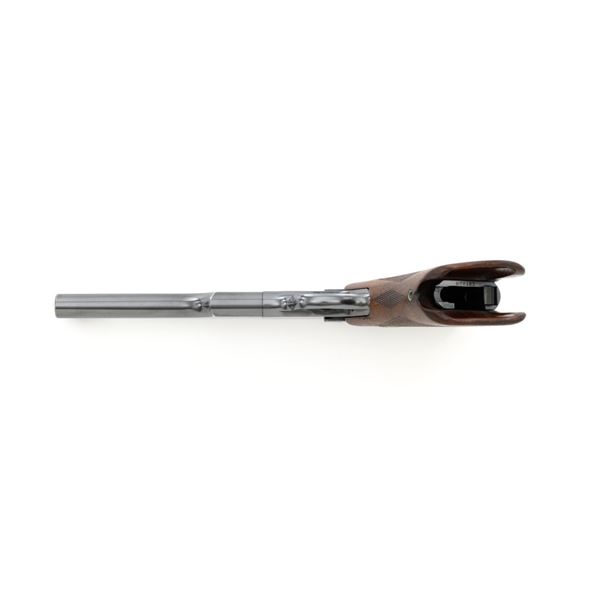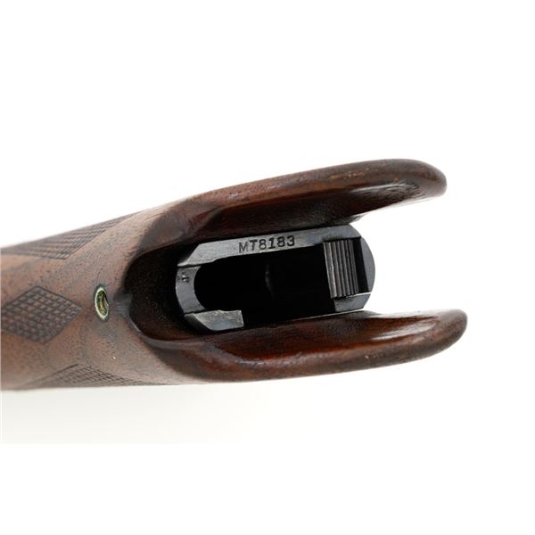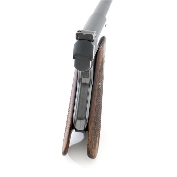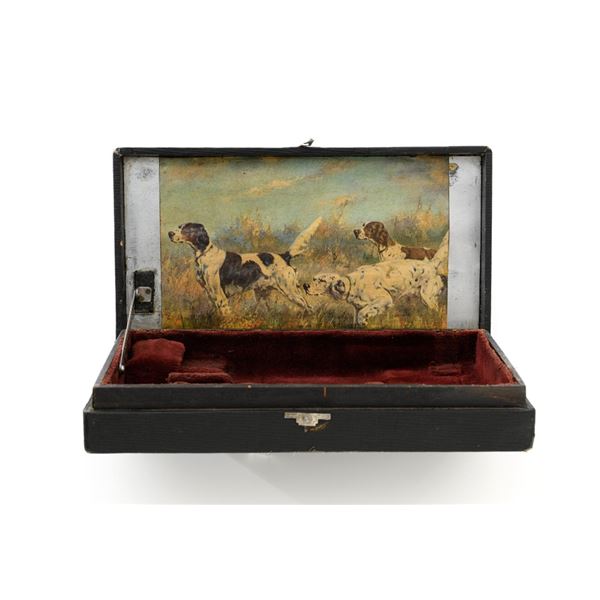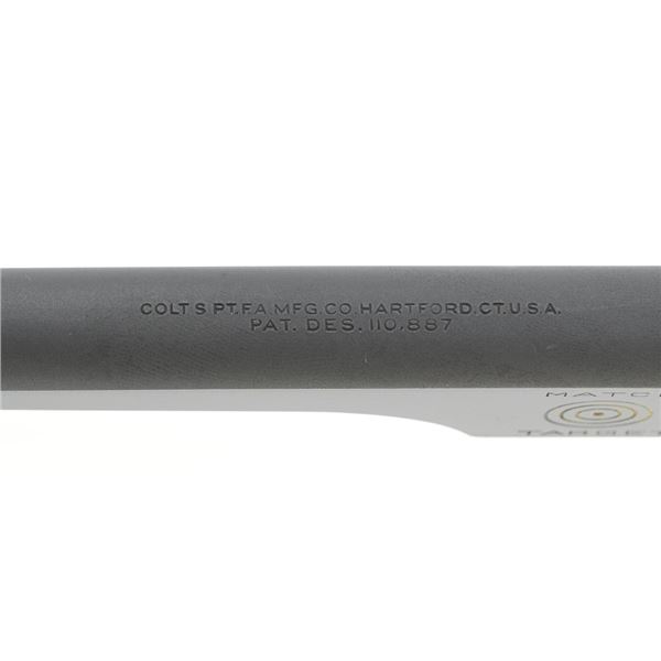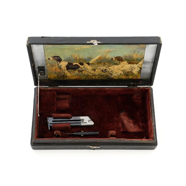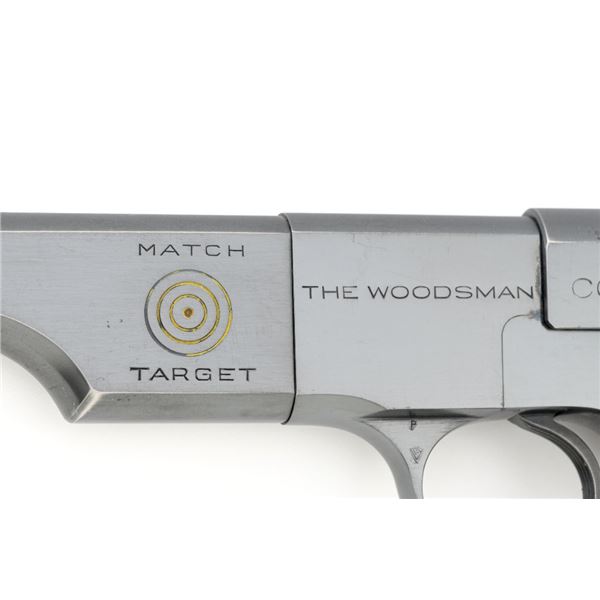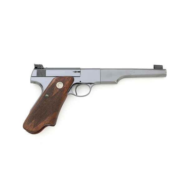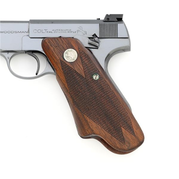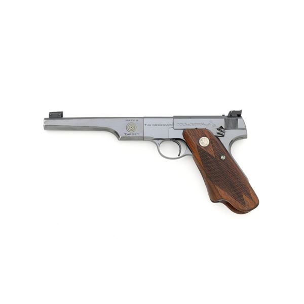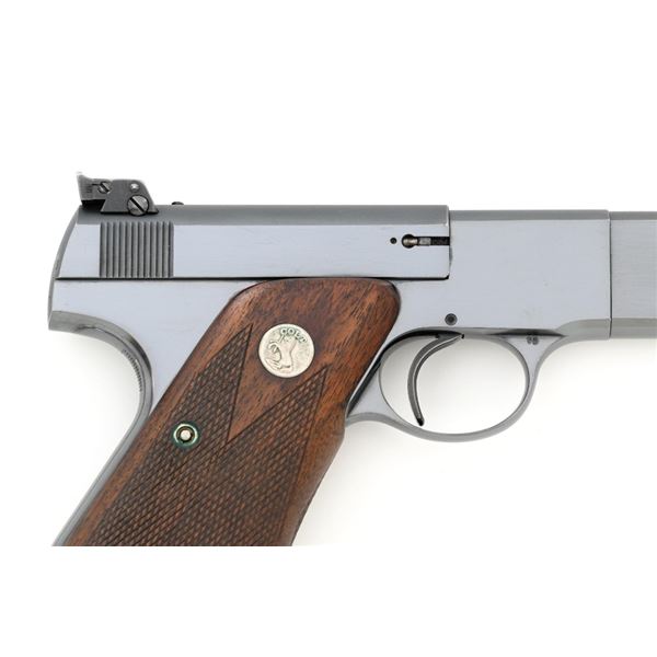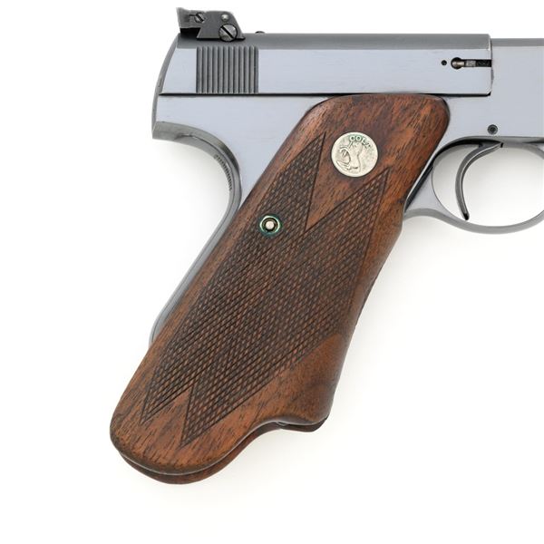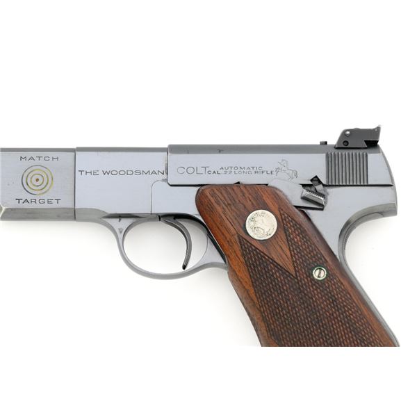 Colt Bullseye Match Target Woodsman 1st Series Semi-Automatic Target Pistol, #MT8183, .22 LR cal., 6-5/8" heavy barrel, blue finish, checkered two-piece walnut "Elephant Ear" grips with Colt medallions, pinned blade front sight (red nail polish added), adjustable square-notched rear sight, with one correct 10-round two-tone magazine marked "COLT WOODSMAN / CAL.22 L.R. / MATCH TARGET MOD.". Includes a custom, period leatherette covered wooden case with screwdriver, maroon velveteen interior, with a print depicting three pointers inside the lid. Case is in very good condition with exposed edges and corners, showing wear and age on the exterior. Interior is very good with impressions and tattered edges.Mfgd 1940. Pistol is in near excellent overall condition, retaining approx. 96%-97% factory blue, showing some areas of thinning, high point edgewear, and minor marks from handling and use. Grips are near excellent with minor smoothing of the checkering detail and bright medallions. Action functions smoothly. Bright bore is near excellent with crisp rifling. Est.: $1,500-$2,500. (C&R)