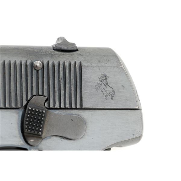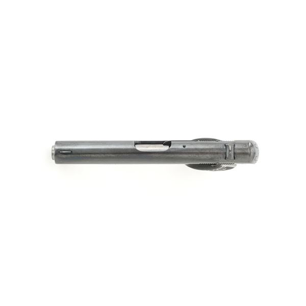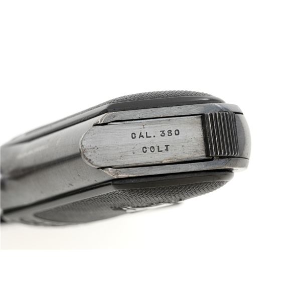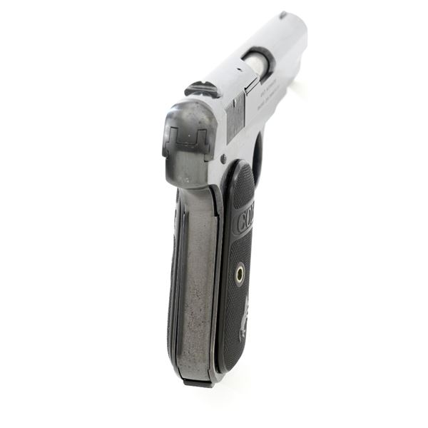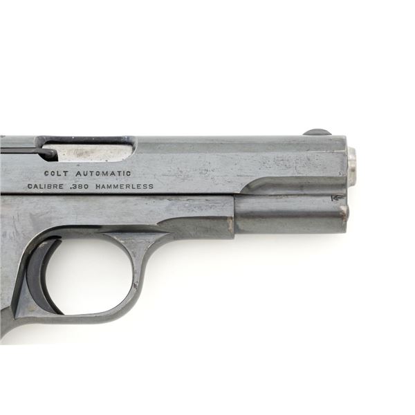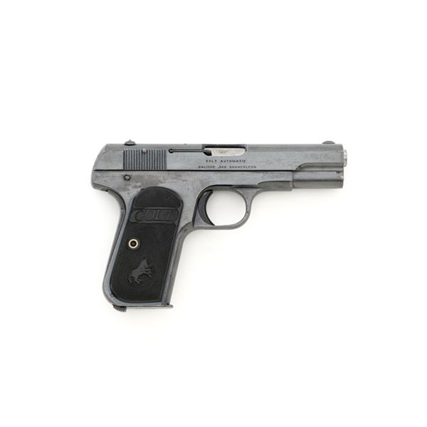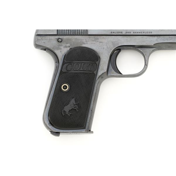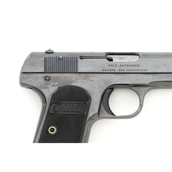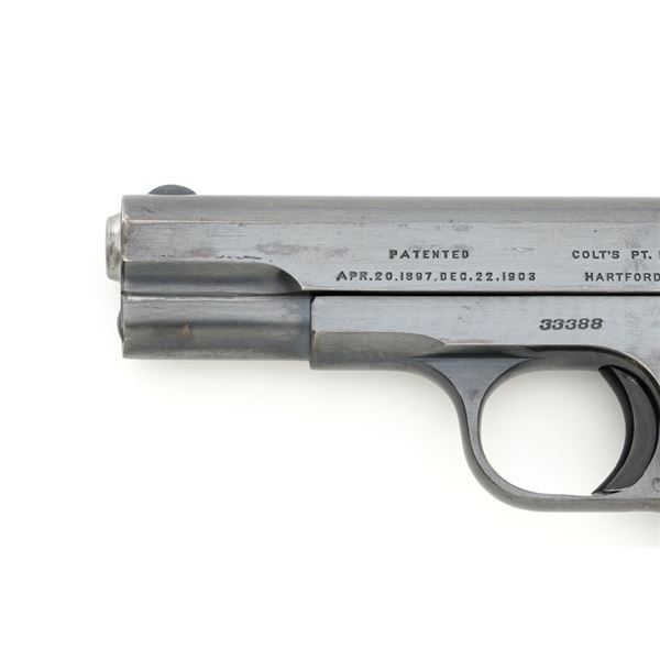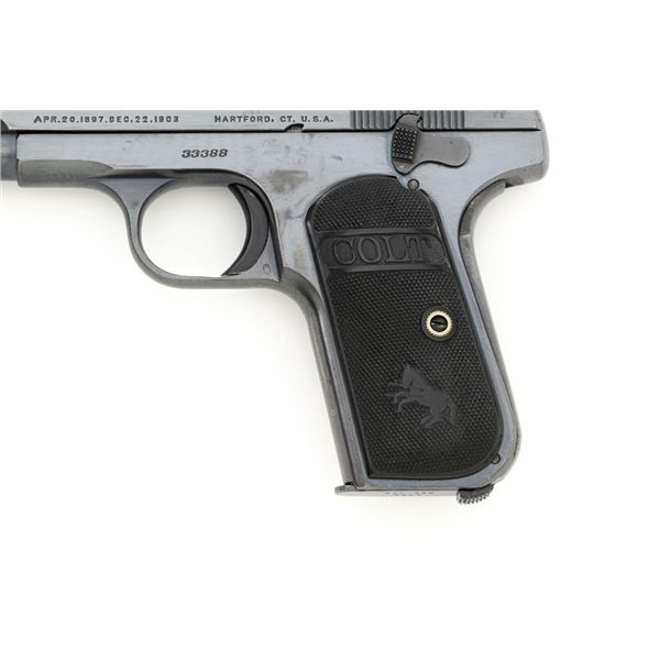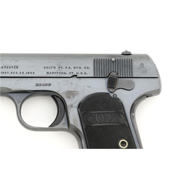 Colt Model 1908 Pocket Hammerless Type III Semi-Automatic Pistol, #33388, .380 ACP cal., 3.75" barrel, blue finish, checkered hard rubber two-piece Colt grips, half-moon blade front sight, and fixed rear sight with small "U"-notched groove. Includes blue steel magazine, base is marked "CAL .380/COLT". Mfgd 1918. Overall condition of this pistol is fine+, retaining approx. 90%-92% factory blue, with intermittent minor salt and pepper blemishes and handling marks, with spots of finish loss, particularly on right rear of the frame. Factory lettering is clear. Grips are near excellent, showing mild handling wear, no chips, or cracks. Action operates smoothly. Bore is bright, rifling is clearly defined and rates good overall. Magazine retains most of the finish but has a mottled appearance on the upper portion that is in the white. Est.: $700-$900. (C&R/PPT)