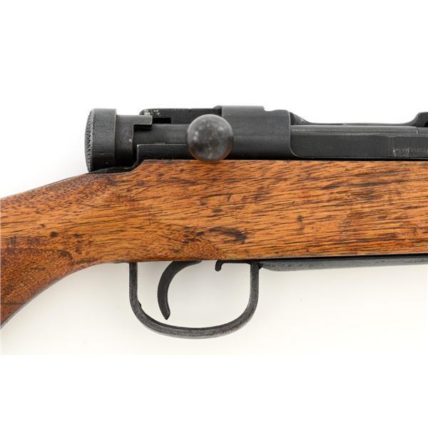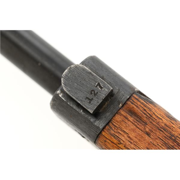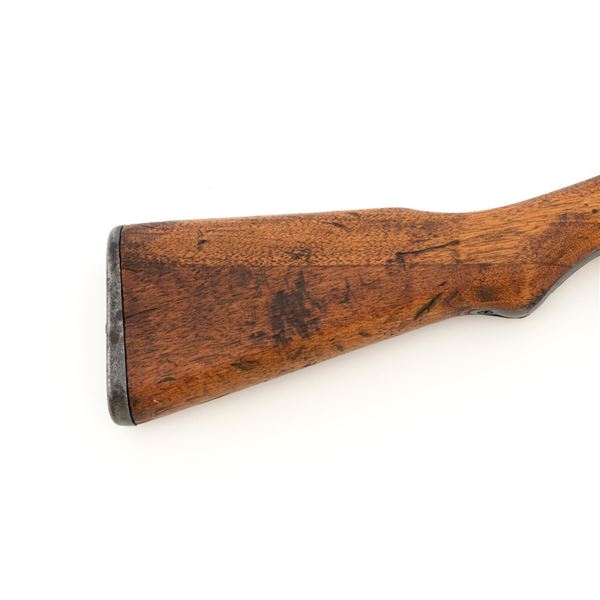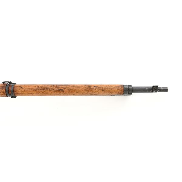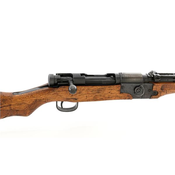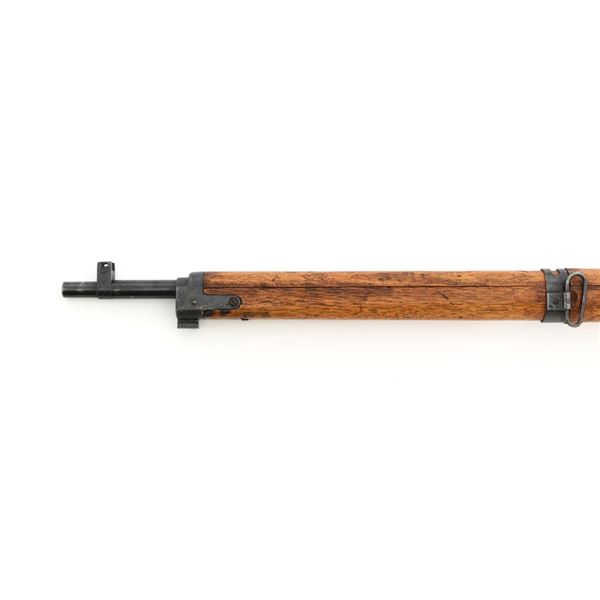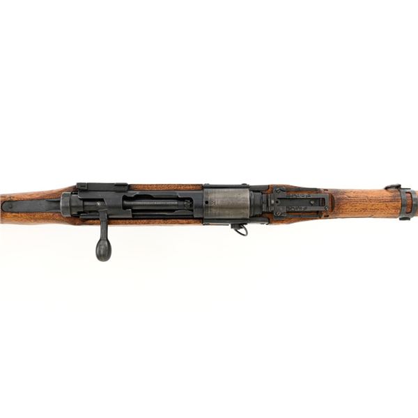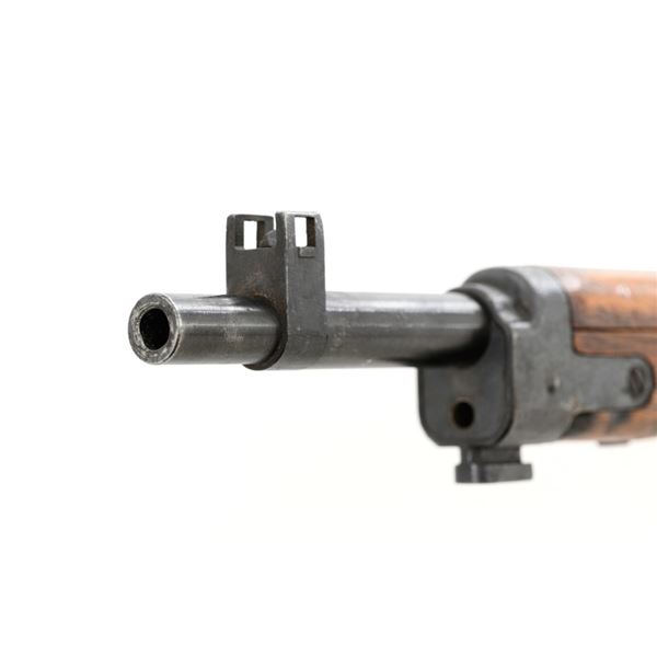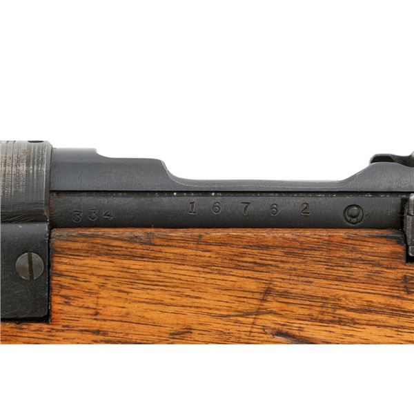 Japanese Type 2 Paratrooper Bolt Action Rifle, #16762, 7.7x58mm cal., 26"barrel, blued finish, hardwood stock and handguard with two-piece buttstock, inverted-"V" front sight with protectors; adjustable folding leaf rear sight with anti-aircraft wings, aperture, and battle sight, graduated to 1500 meters. No cleaning rod. Top of the receiver ring has been polished bright and the only visible marking is the Japanese character for "Type". Left side of the receiver is marked with the symbol for Nagoya arsenal. Assembly number 334" is stamped on left side of the receiver, rear takedown assembly, and d-ring wedge. Number "127" is stamped on the bottom rear of the barrel (visible when disassembled) and underside of the bayonet mount. Matching receiver number "762" is stamped on left side of the front takedown assembly and left side of the barrel. Bolt handle, extractor, firing pin, and safety are numbered "263". No visible import marks. Condition overall is very good with the metal retaining much of its toning finish, wear to the buttplate and polishing to the receiver ring accounts for much of the finish loss. Wood is good with bruises and scratches throughout, the largest are on the right side of the buttstock. Handguard appears to have been lightly sanded. Action operates smoothly. Bore is bright with very good rifling. Est.: $1,400-$1,800. (C&R)