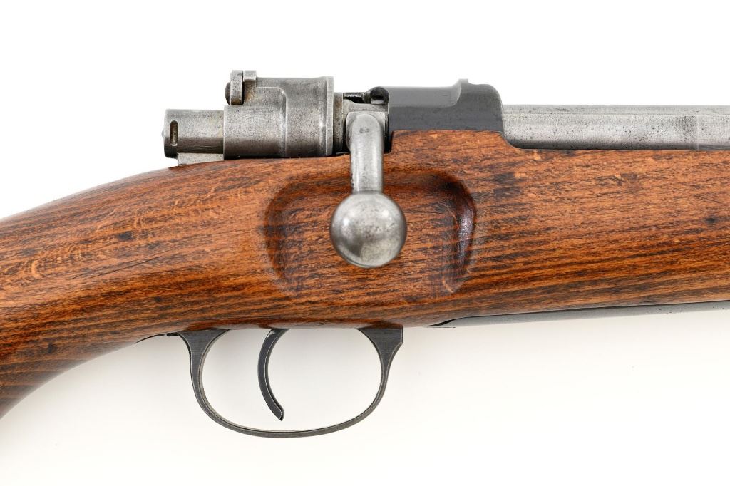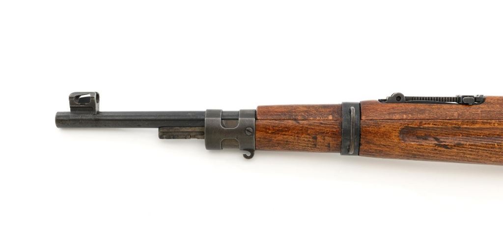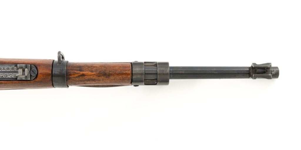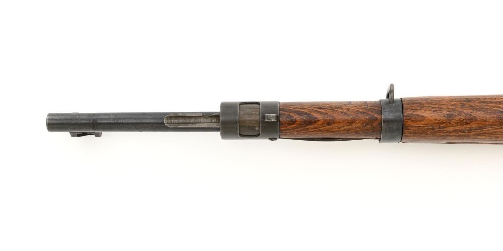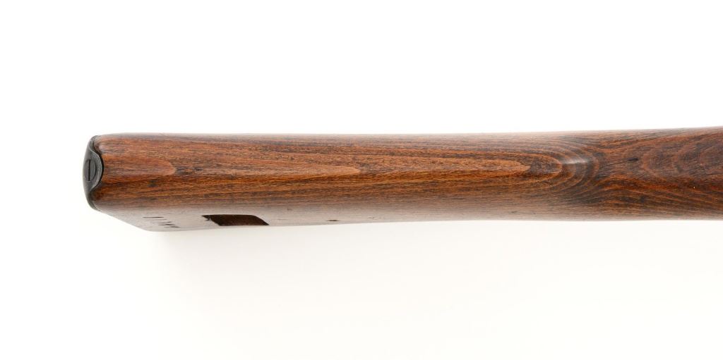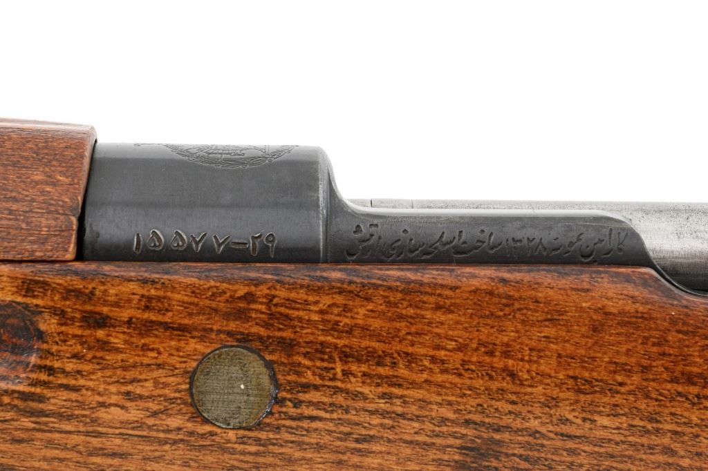 Iranian Model 49 Mauser Bolt Action Carbine, #NVSN, 8x57mm cal., 18.1" barrel, blued finish with bright bolt assembly, inverted-"V" front sight with protectors, adjustable tangent rear sight with "U"-notched groove, graduated to 2000 meters. Cleaning rod is missing. Top of the receiver ring is marked with crowned Iranian crest, with partially visible Iranian proof stamps on the right side. Right side of the buttstock is stamped with a faint crescent moon and star symbol. Matching Farsi numbers. No visible import marks. Condition overall is very good, retaining approx. 85% blue, showing areas of thinning and toning, with small impact marks to the trigger guard/magazine floorplate, and wear to the buttplate. Bright bolt assembly shows mild toning. Front barrel band is an "H" type with parade hook. Wood has been lightly sanded and varnished, now in good condition, showing scattered light impressions and scratches. There is a small, closed crack to top of the stock wrist, behind the receiver tang. Action operates smoothly. Bore is bright with very good, defined rifling. Est:$800-$1,200. (C&R)