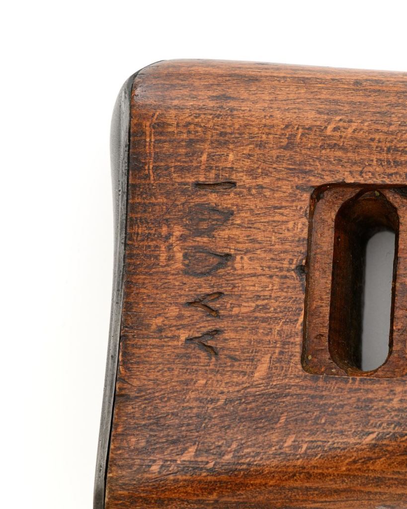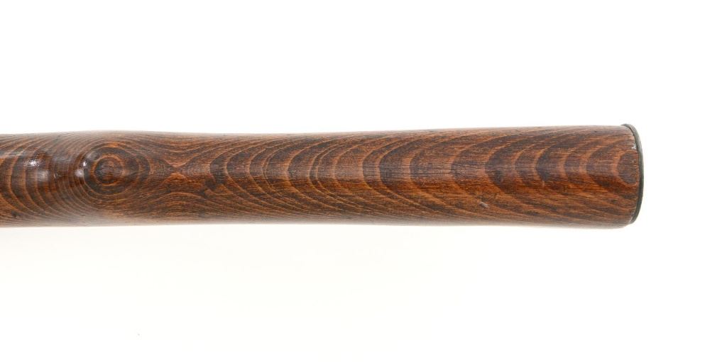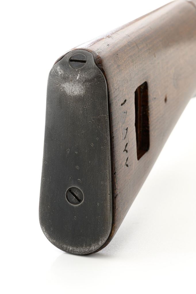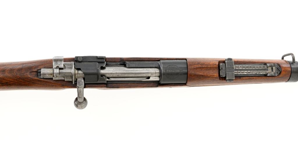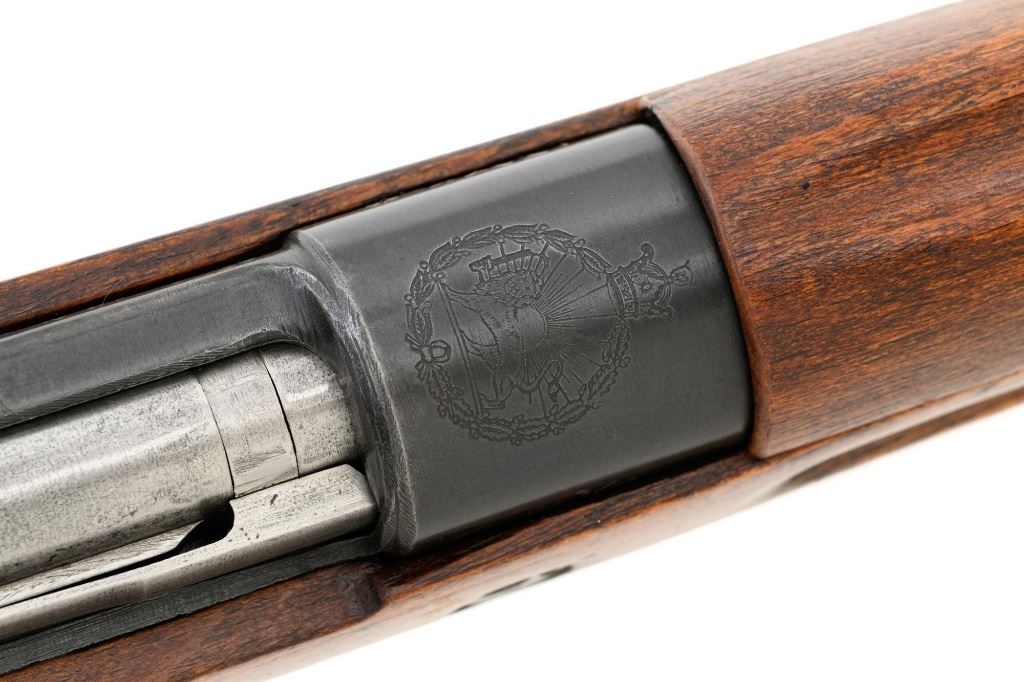 Iranian Model 49 Mauser Bolt Action Carbine, #NVSN, 8x57mm cal., 18.1" barrel, blued finish with bright bolt assembly, inverted-"V" front sight with protectors, adjustable tangent rear sight with "U"-notched groove, graduated to 2000 meters. Cleaning rod is missing. Top of the receiver ring is marked with crowned Iranian crest, with partially visible Iranian proof stamps on the right side. Right side of the buttstock is stamped with a faint crescent moon and star symbol. Matching Farsi numbers. No visible import marks. Condition overall is very good, retaining approx. 85% blue, showing areas of thinning and toning, with small impact marks to the trigger guard/magazine floorplate, and wear to the buttplate. Bright bolt assembly shows mild toning. Front barrel band is an "H" type with parade hook. Wood has been lightly sanded and varnished, now in good condition, showing scattered light impressions and scratches. There is a small, closed crack to top of the stock wrist, behind the receiver tang. Action operates smoothly. Bore is bright with very good, defined rifling. Est:$800-$1,200. (C&R)