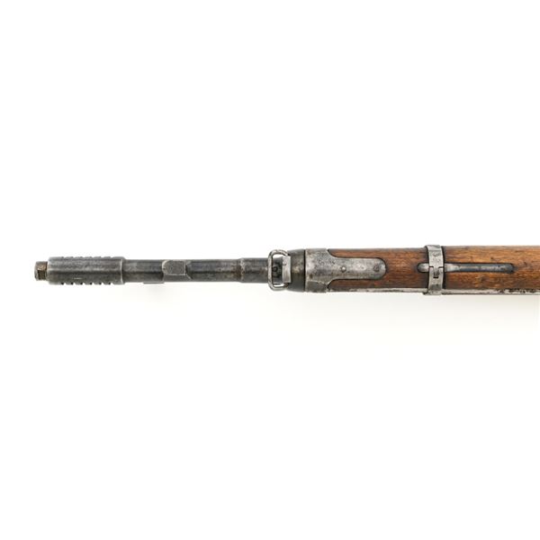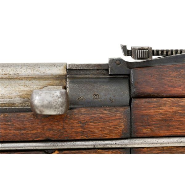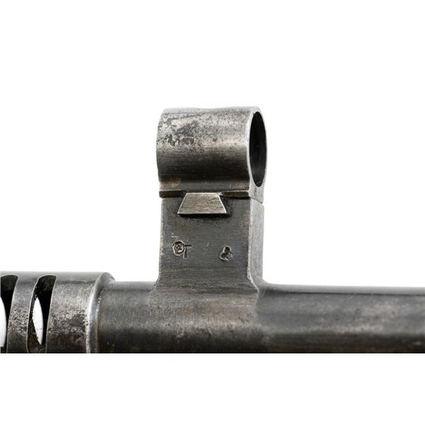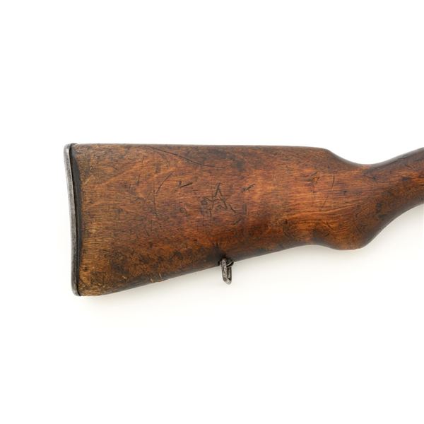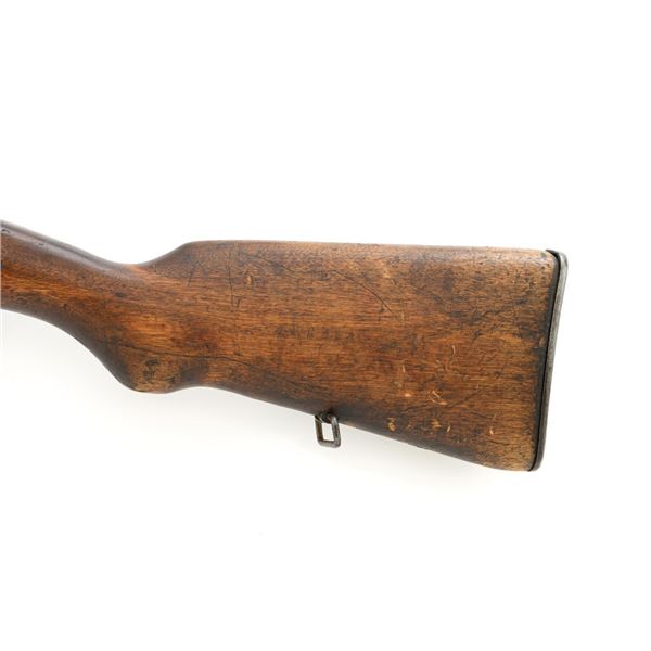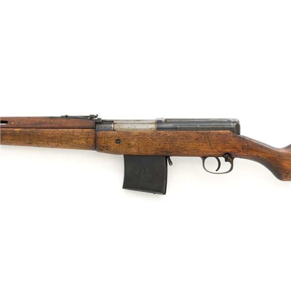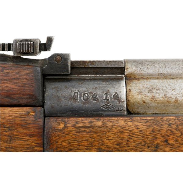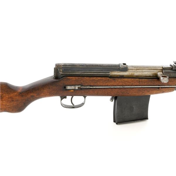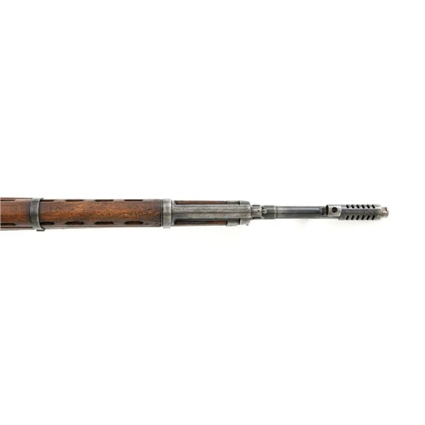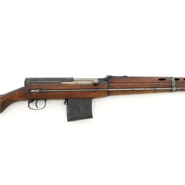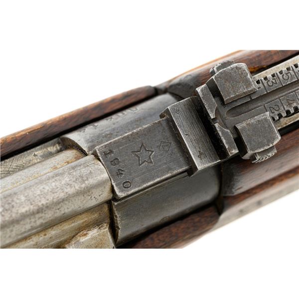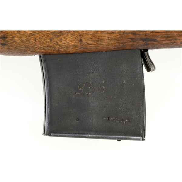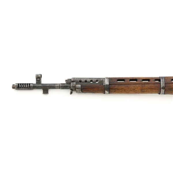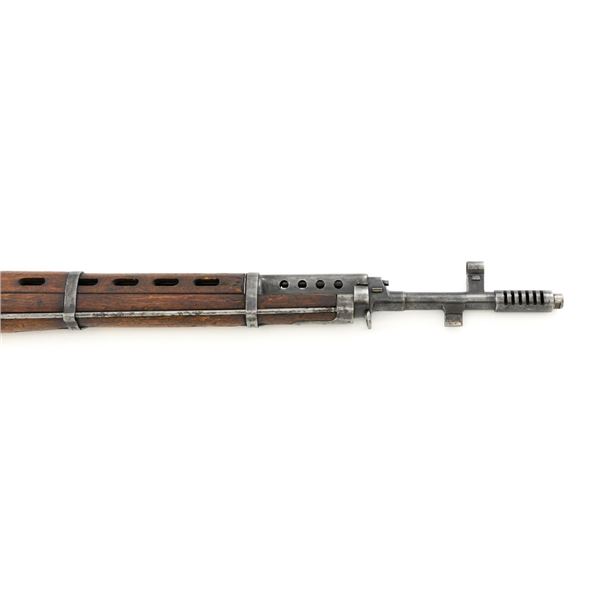 Soviet Tula Arsenal SVT-38 Tokarev Semi-Automatic Rifle, #AC414, 7.62x54Rmm cal., 24.6" barrel with muzzle brake, blued finish, hardwood stock with two-piece forend, ventilated wooden and sheet metal handguard, hooded post front sight, and adjustable tangent rear sight with "U"-notched groove, graduated to 1500 meters. Includes steel cleaning rod and 10-round magazine. Magazine is marked both "1896" and "936". Rifle is stamped with Tula Arsenal five pointed star makers mark over "1940" on top of the receiver ring. There is also a faint five pointed star on right side of the buttstock. Matching numbered bolt, trigger guard is numbered but does not match. Number on left side of the buttstock is illegible. No visible import marks. Condition overall is good, retaining approx. 65%-70% blue, showing general thinning and toning, with rust frosting to the handguard, and a mottled appearance to the receiver cover. Stock has a crack through the left side of the pistol grip, with dents and scratches scattered throughout. There are small cracks to the front and rear of the handguard. Action operates smoothly. Bore is dark with fair rifling. Est.: $2,000-$3,000. (C&R)