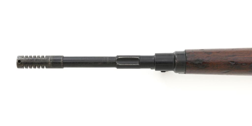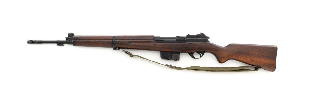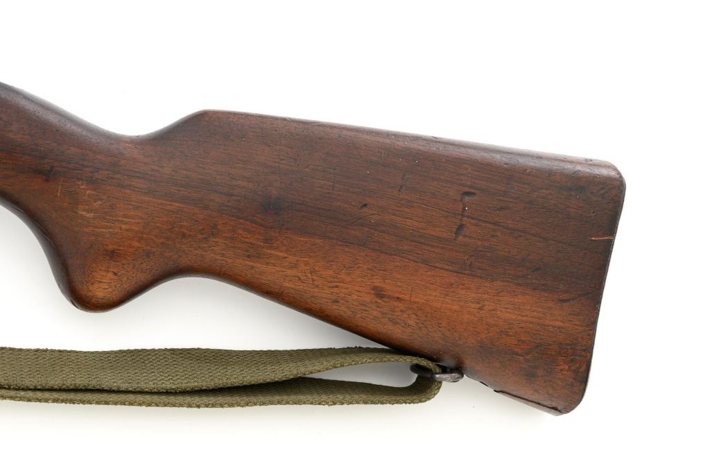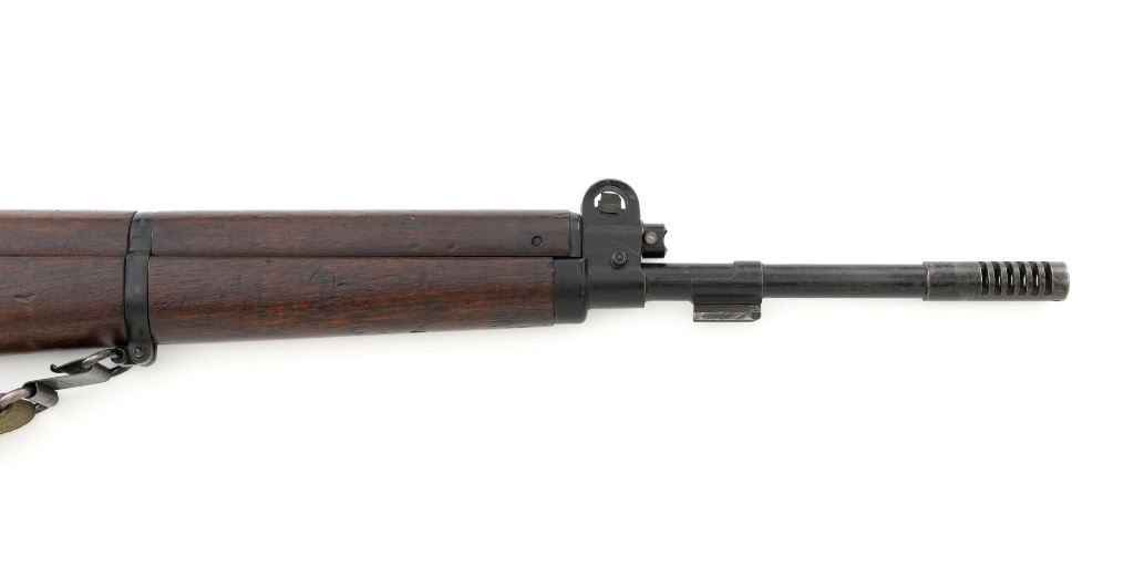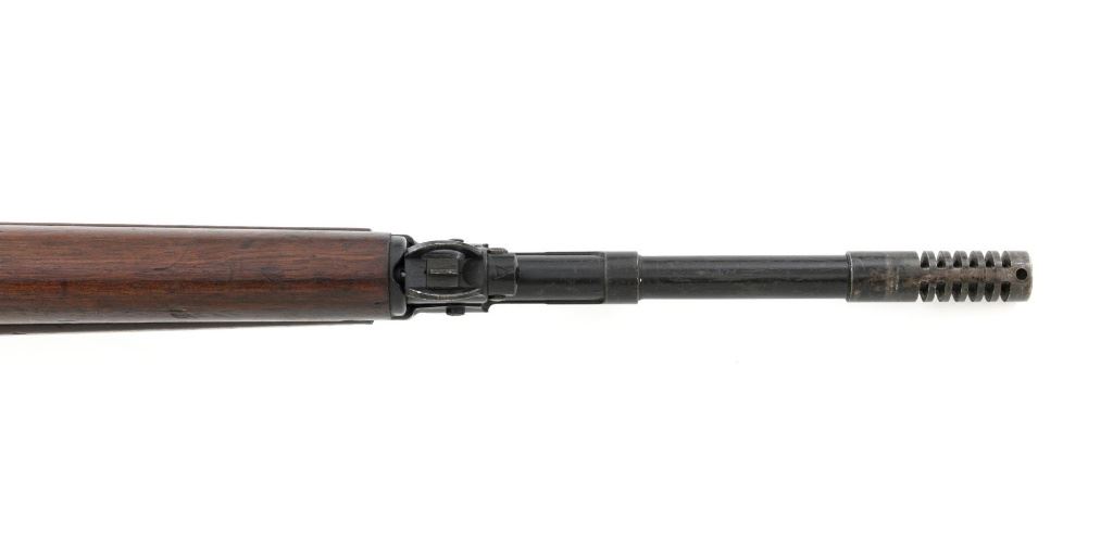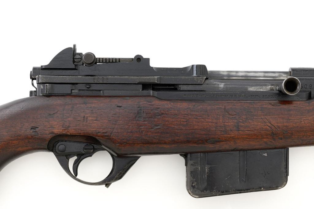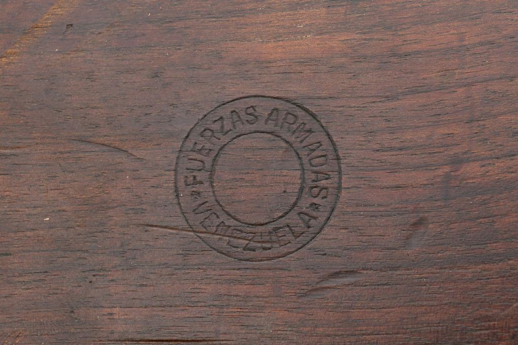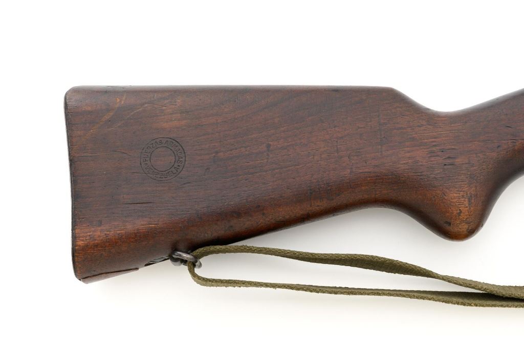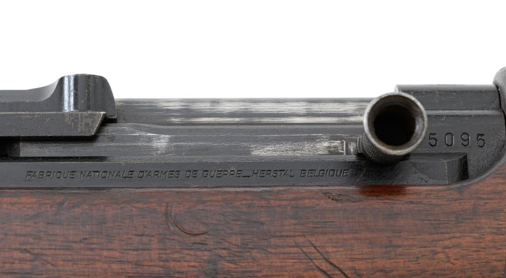 Venezuelan Contract FN 49 Semi-Automatic Rifle, #5095, 7x57mm cal., 24.75"barrel, blackened finish, hardwood stock and handguard, dovetailed blade front sight with protectors, and adjustable aperture on ramp rear sight, graduated to 1000 meters. Includes a military green cotton U.S. sling, in fair used condition. Top of the receiver ring is marked with Venezuelan crest and Belgian proof stamps on the left side. Right side of the receiver rail is marked "FABRIQUE NATIONALE DARMES DE GUERRE_HERSTAL BELGIQUE". Right side of the buttstock with a roundel that reads "FUERZAS ARMADAS.VENEZUELA". Matching number on the receiver cover. No visible import marks. Metal rates very good, retaining approx. 80% blue. There are some scratches on the barrel, receiver, and magazine. Both sides of the magazine have surface dents. Stock is good, showing bruises, and circular marks to the left side below the receiver. Action needs to be repaired, bolt hold open will not engage and the bolt carrier will not lock into battery when released. Bore is bright with very good rifling. Est.: $700-$1,000. (C&R)