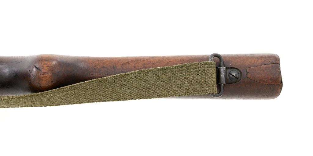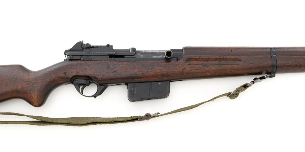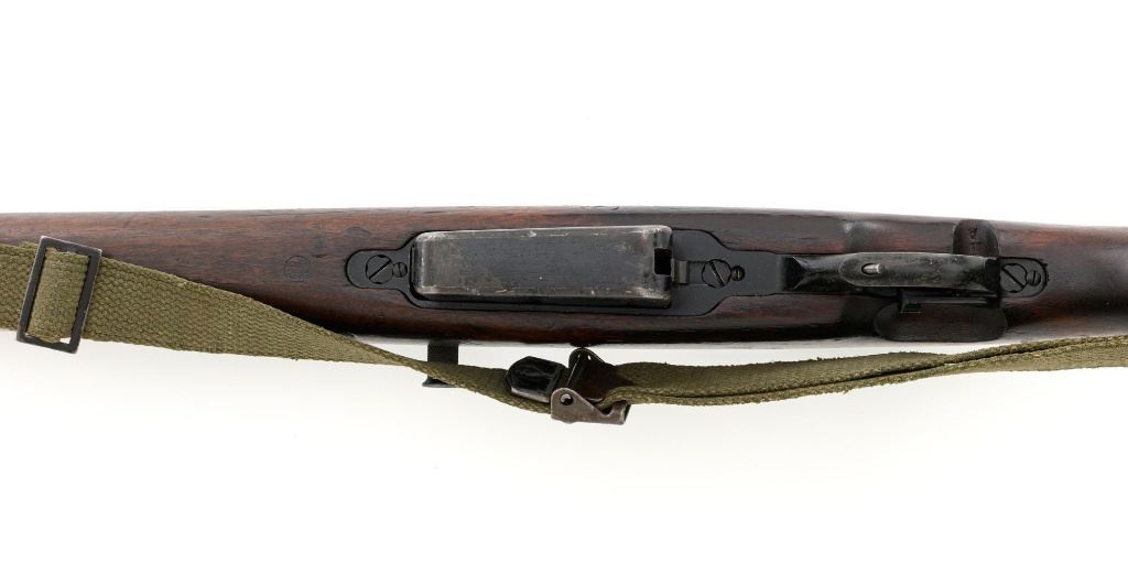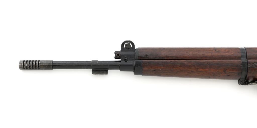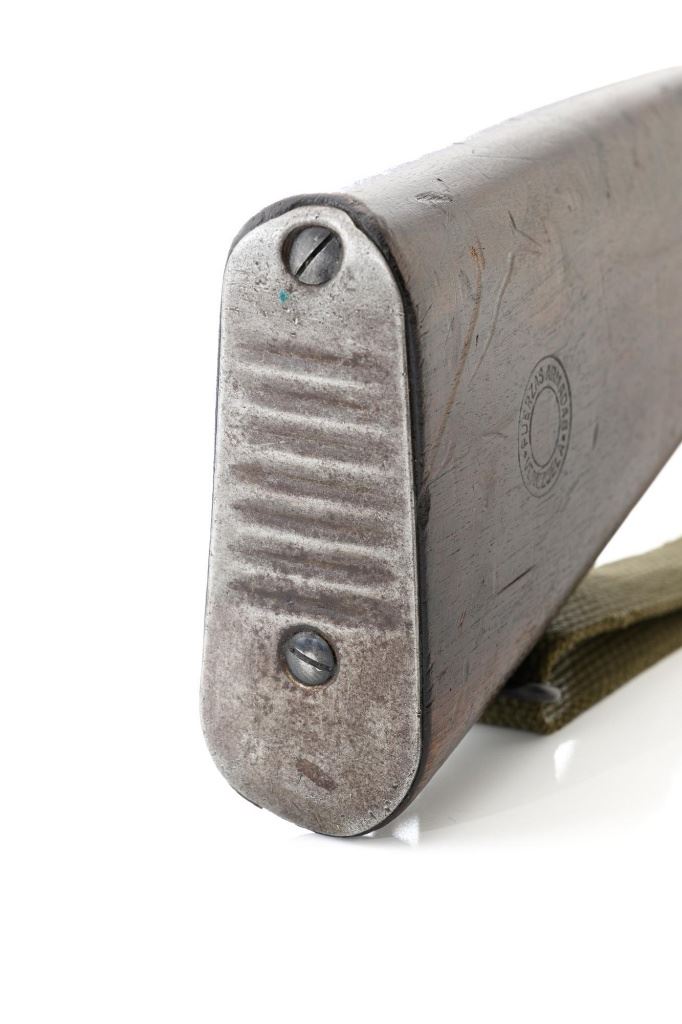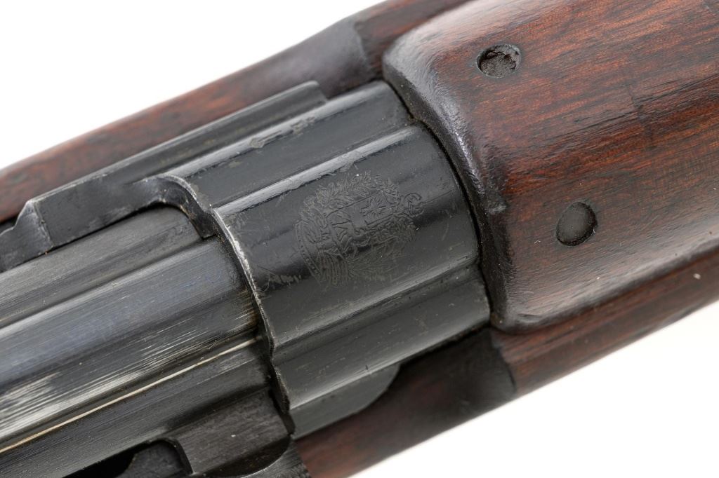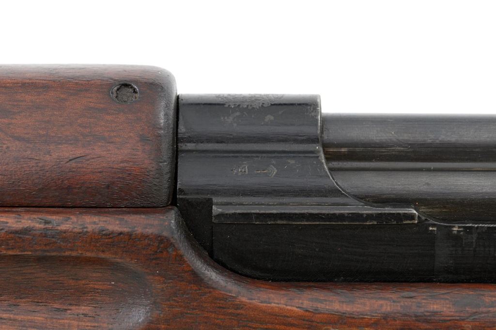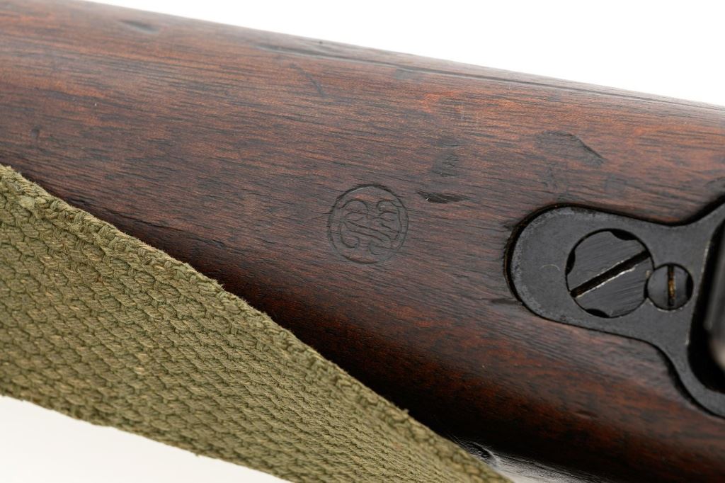 Venezuelan Contract FN 49 Semi-Automatic Rifle, #5095, 7x57mm cal., 24.75"barrel, blackened finish, hardwood stock and handguard, dovetailed blade front sight with protectors, and adjustable aperture on ramp rear sight, graduated to 1000 meters. Includes a military green cotton U.S. sling, in fair used condition. Top of the receiver ring is marked with Venezuelan crest and Belgian proof stamps on the left side. Right side of the receiver rail is marked "FABRIQUE NATIONALE DARMES DE GUERRE_HERSTAL BELGIQUE". Right side of the buttstock with a roundel that reads "FUERZAS ARMADAS.VENEZUELA". Matching number on the receiver cover. No visible import marks. Metal rates very good, retaining approx. 80% blue. There are some scratches on the barrel, receiver, and magazine. Both sides of the magazine have surface dents. Stock is good, showing bruises, and circular marks to the left side below the receiver. Action needs to be repaired, bolt hold open will not engage and the bolt carrier will not lock into battery when released. Bore is bright with very good rifling. Est.: $700-$1,000. (C&R)