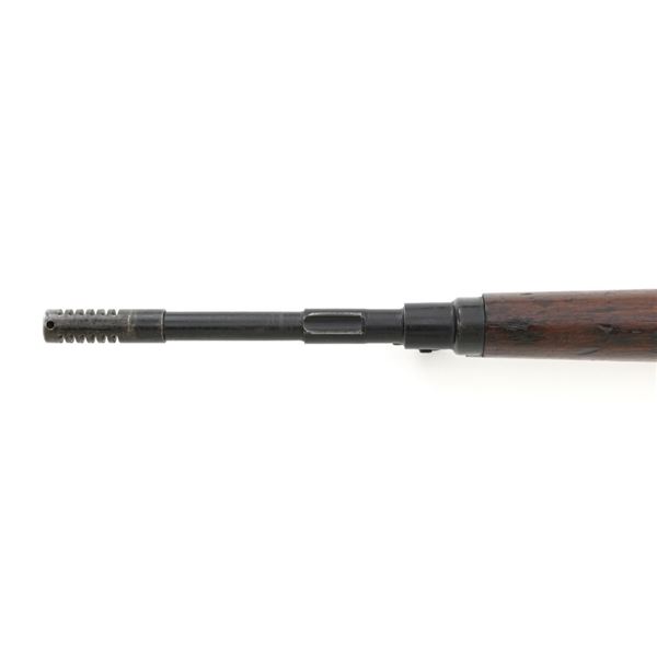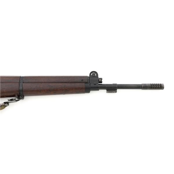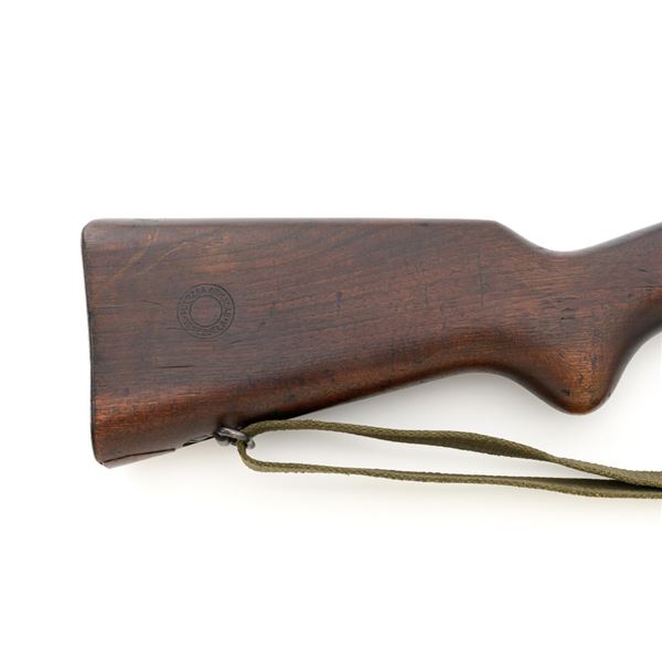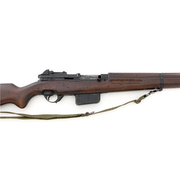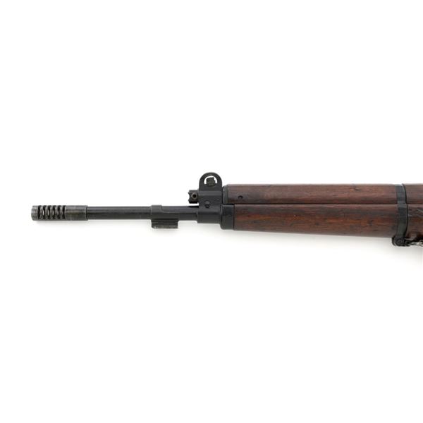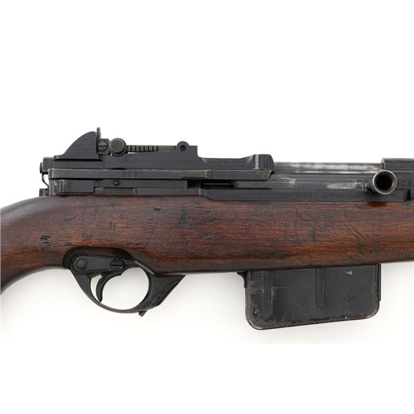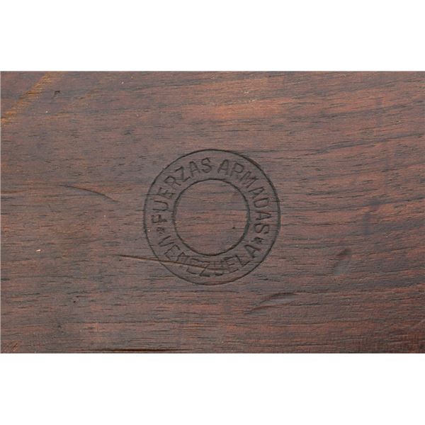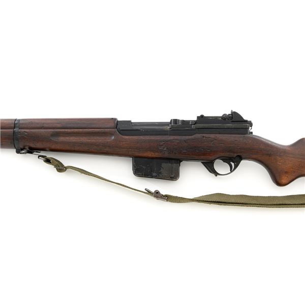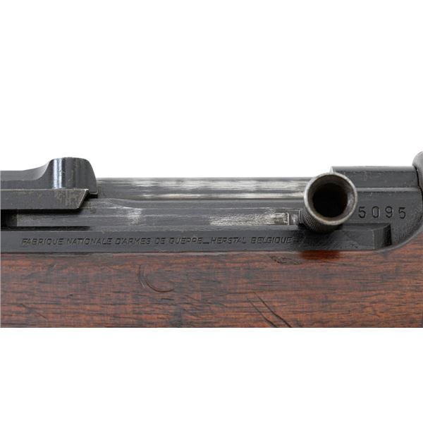 Venezuelan Contract FN 49 Semi-Automatic Rifle, #5095, 7x57mm cal., 24.75"barrel, blackened finish, hardwood stock and handguard, dovetailed blade front sight with protectors, and adjustable aperture on ramp rear sight, graduated to 1000 meters. Includes a military green cotton U.S. sling, in fair used condition. Top of the receiver ring is marked with Venezuelan crest and Belgian proof stamps on the left side. Right side of the receiver rail is marked "FABRIQUE NATIONALE DARMES DE GUERRE_HERSTAL BELGIQUE". Right side of the buttstock with a roundel that reads "FUERZAS ARMADAS.VENEZUELA". Matching number on the receiver cover. No visible import marks. Metal rates very good, retaining approx. 80% blue. There are some scratches on the barrel, receiver, and magazine. Both sides of the magazine have surface dents. Stock is good, showing bruises, and circular marks to the left side below the receiver. Action needs to be repaired, bolt hold open will not engage and the bolt carrier will not lock into battery when released. Bore is bright with very good rifling. Est.: $700-$1,000. (C&R)