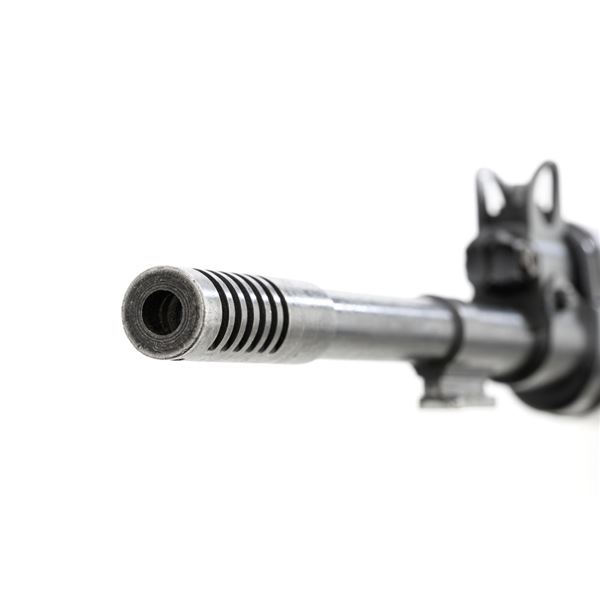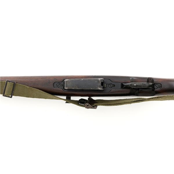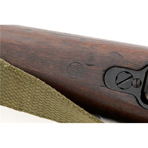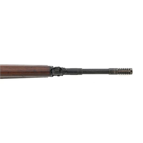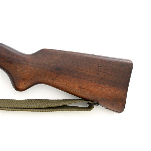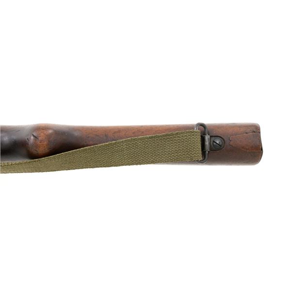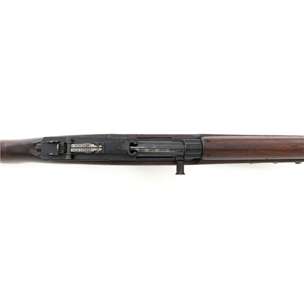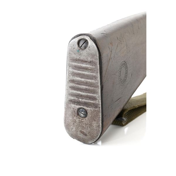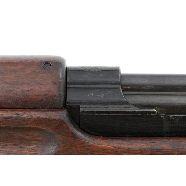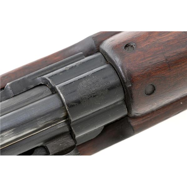 Venezuelan Contract FN 49 Semi-Automatic Rifle, #5095, 7x57mm cal., 24.75"barrel, blackened finish, hardwood stock and handguard, dovetailed blade front sight with protectors, and adjustable aperture on ramp rear sight, graduated to 1000 meters. Includes a military green cotton U.S. sling, in fair used condition. Top of the receiver ring is marked with Venezuelan crest and Belgian proof stamps on the left side. Right side of the receiver rail is marked "FABRIQUE NATIONALE DARMES DE GUERRE_HERSTAL BELGIQUE". Right side of the buttstock with a roundel that reads "FUERZAS ARMADAS.VENEZUELA". Matching number on the receiver cover. No visible import marks. Metal rates very good, retaining approx. 80% blue. There are some scratches on the barrel, receiver, and magazine. Both sides of the magazine have surface dents. Stock is good, showing bruises, and circular marks to the left side below the receiver. Action needs to be repaired, bolt hold open will not engage and the bolt carrier will not lock into battery when released. Bore is bright with very good rifling. Est.: $700-$1,000. (C&R)
