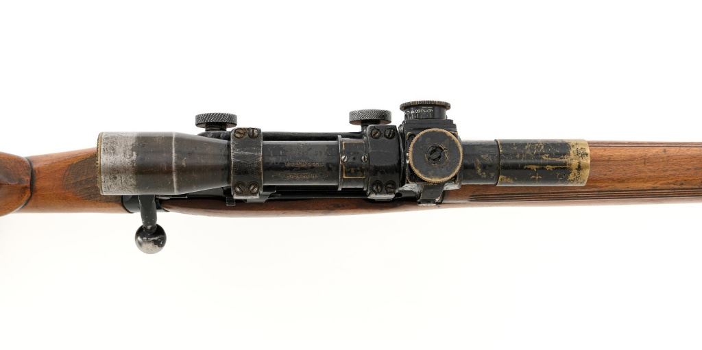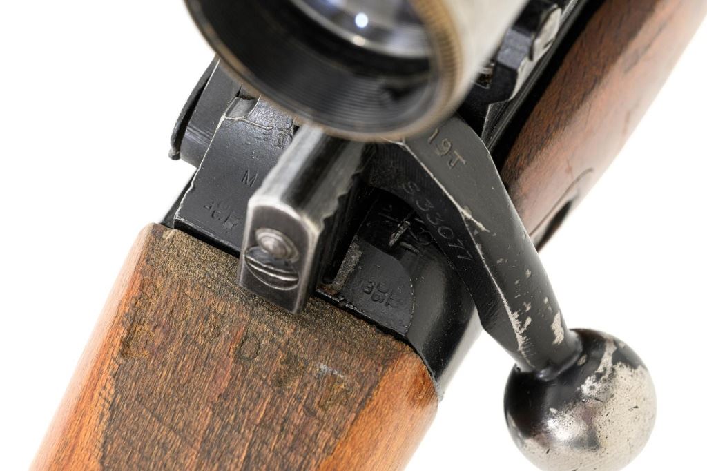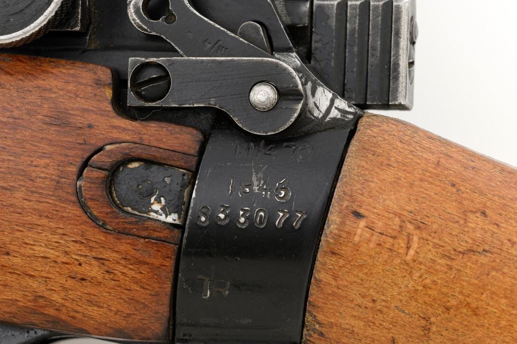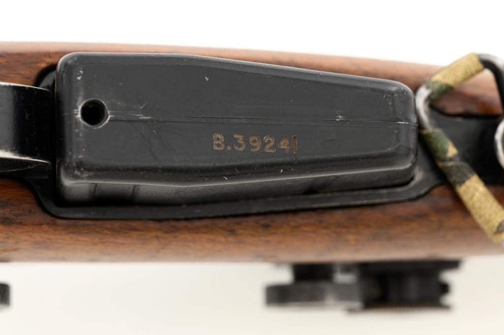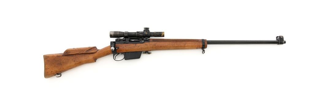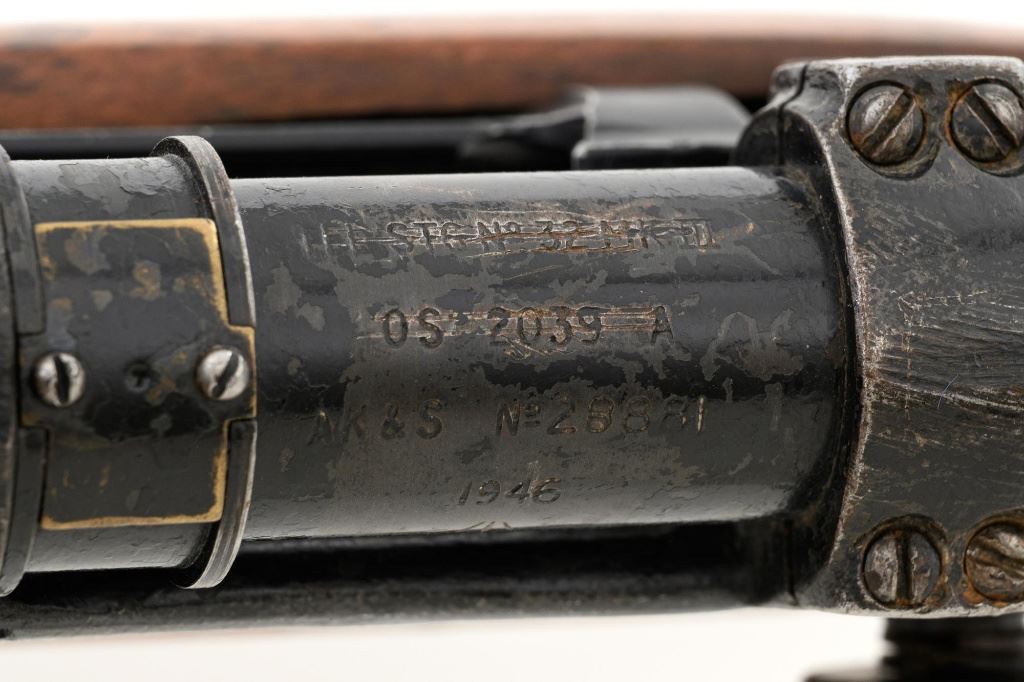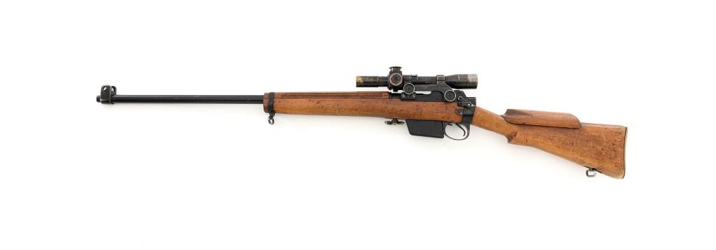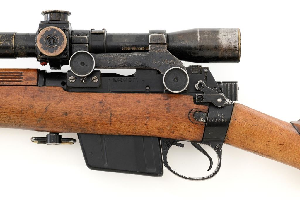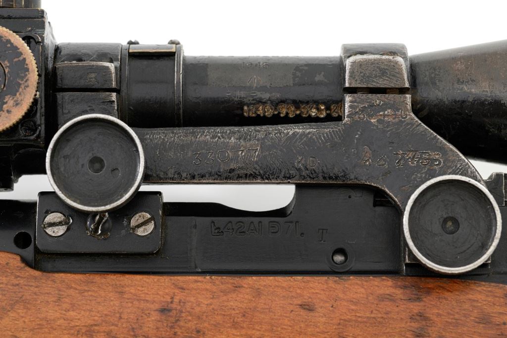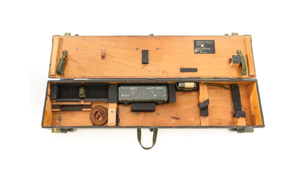 British L42A1 Lee Enfield Bolt Action Sniper Rifle with Telescope, Transport Chest, and Accessories, #S33077, 7.62x51mm cal., 27.6" hammer forged heavy barrel, black painted finish, hardwood stock set with handguard, blade front sight with protectors, and adjustable folding rear sight with battle aperture removed. A #3 bolt head is fitted. Telescope is marked "TEL STG No 32 MK III", which has been barred out, and "OS 2039A/AK&S No28881/1946/(Broad Arrow)/(NATO stock number)". Telescope bracket is stamped "KD" and is marked with the current rifle serial number, two prior serial numbers have been barred out. Scope and bracket show wear and handling marks. Range and deflection drums click smoothly. There is a blurred area in the lower part of the lens, the optics are otherwise clear and bright. Steel scope case is marked "TELESCOPE STRAIGHT SIGHTING CASE L1A1". Condition is fair with dents and scratches. Wooden transport chest is marked "CHEST RIFLE 7.62 MM L42A1". Chest is painted in multiple colors and shows heavy use. Both are painted with matching numbers to the rifle and scope. An excellent condition cleaning kit and a very good condition commercial leather sling are stored inside. Rifle is marked "L42A1(Enfield arsenal symbol)71"on left side of the receiver over a "Tall T" final acceptance stamp. Left side of the action body is marked "M47C/1945" over a "TR" target range stamp. Right side of the receiver lug is marked with a vertical "S". There are Enfield arsenal onsite examiners marks stamped on each side of the bolt channel. Magazine case is marked "CR141A 65". Buttstock appears to be a replacement and is not marked with the Holland and Holland dispersal code. A sniper style sling swivel is fitted to the forward trigger guard. "19T" is engraved on the bolt handle and bolt head, and stamped on right side of the bolt channel. Matching numbers on the bolt handle and forend. Magazine does not match. No visible import marks. Rifle condition is very good overall, retaining approx. 85%-88% black finish, with scratches to the barrel, and finish wear to the receiver and front sight. Wood is very good with handling marks and scratches to the darkened finish, and heavier wear to the toe of the buttstock. Action operates smoothly. Bore is bright with excellent, well-defined rifling. Est.: $4,000-$6,000. (C&R)