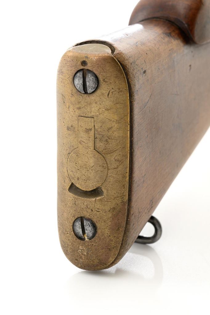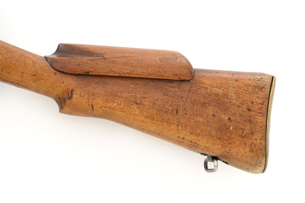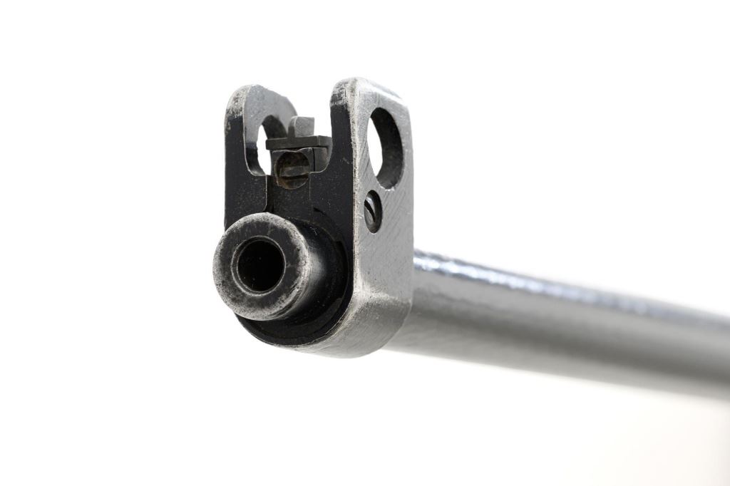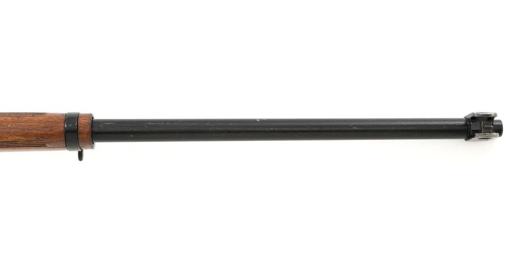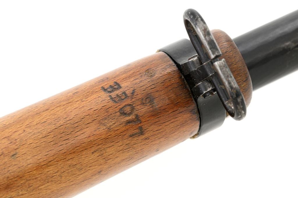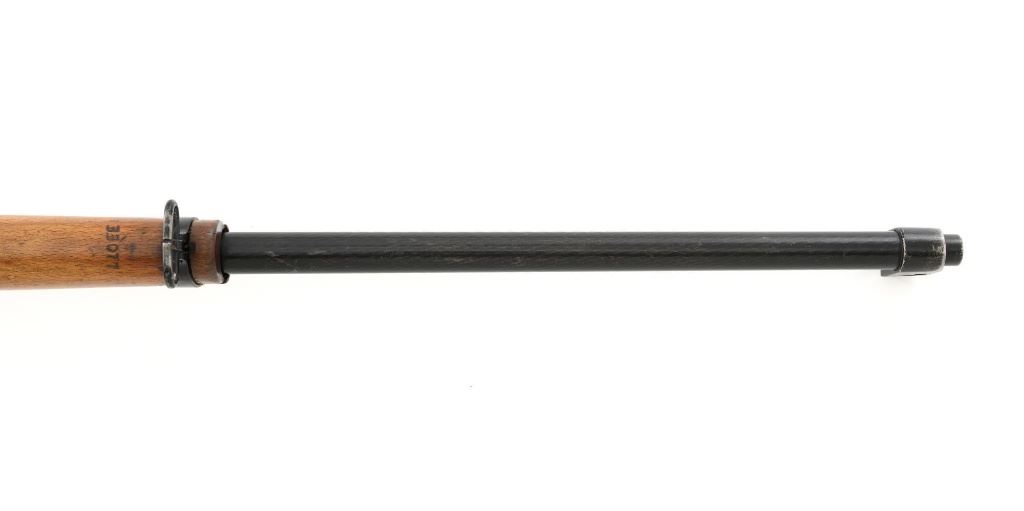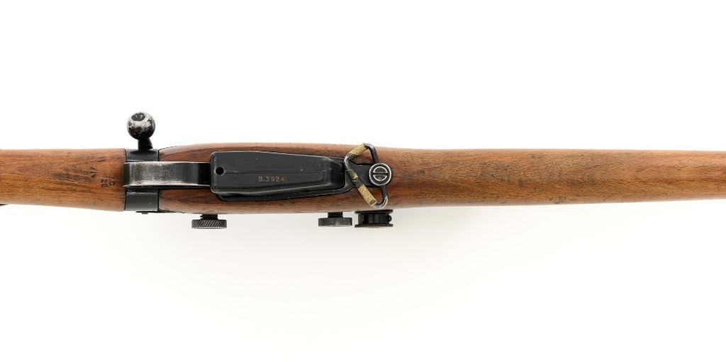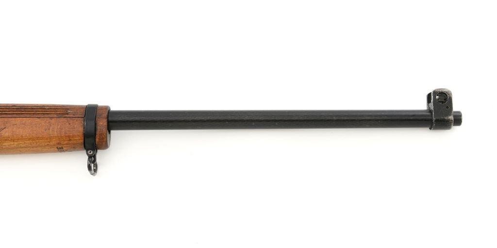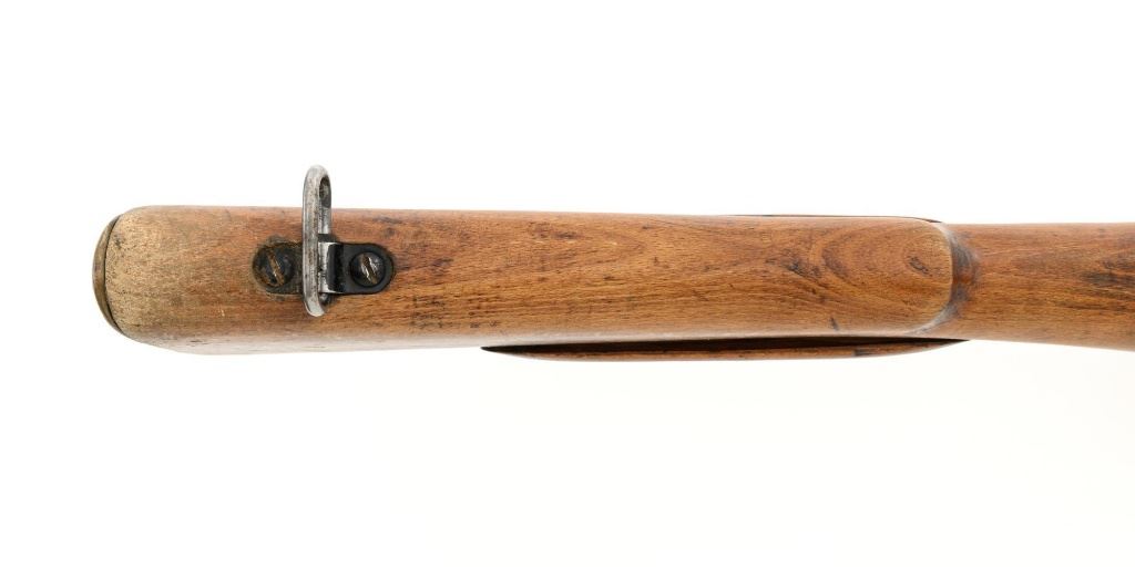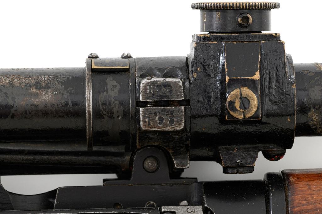 British L42A1 Lee Enfield Bolt Action Sniper Rifle with Telescope, Transport Chest, and Accessories, #S33077, 7.62x51mm cal., 27.6" hammer forged heavy barrel, black painted finish, hardwood stock set with handguard, blade front sight with protectors, and adjustable folding rear sight with battle aperture removed. A #3 bolt head is fitted. Telescope is marked "TEL STG No 32 MK III", which has been barred out, and "OS 2039A/AK&S No28881/1946/(Broad Arrow)/(NATO stock number)". Telescope bracket is stamped "KD" and is marked with the current rifle serial number, two prior serial numbers have been barred out. Scope and bracket show wear and handling marks. Range and deflection drums click smoothly. There is a blurred area in the lower part of the lens, the optics are otherwise clear and bright. Steel scope case is marked "TELESCOPE STRAIGHT SIGHTING CASE L1A1". Condition is fair with dents and scratches. Wooden transport chest is marked "CHEST RIFLE 7.62 MM L42A1". Chest is painted in multiple colors and shows heavy use. Both are painted with matching numbers to the rifle and scope. An excellent condition cleaning kit and a very good condition commercial leather sling are stored inside. Rifle is marked "L42A1(Enfield arsenal symbol)71"on left side of the receiver over a "Tall T" final acceptance stamp. Left side of the action body is marked "M47C/1945" over a "TR" target range stamp. Right side of the receiver lug is marked with a vertical "S". There are Enfield arsenal onsite examiners marks stamped on each side of the bolt channel. Magazine case is marked "CR141A 65". Buttstock appears to be a replacement and is not marked with the Holland and Holland dispersal code. A sniper style sling swivel is fitted to the forward trigger guard. "19T" is engraved on the bolt handle and bolt head, and stamped on right side of the bolt channel. Matching numbers on the bolt handle and forend. Magazine does not match. No visible import marks. Rifle condition is very good overall, retaining approx. 85%-88% black finish, with scratches to the barrel, and finish wear to the receiver and front sight. Wood is very good with handling marks and scratches to the darkened finish, and heavier wear to the toe of the buttstock. Action operates smoothly. Bore is bright with excellent, well-defined rifling. Est.: $4,000-$6,000. (C&R)