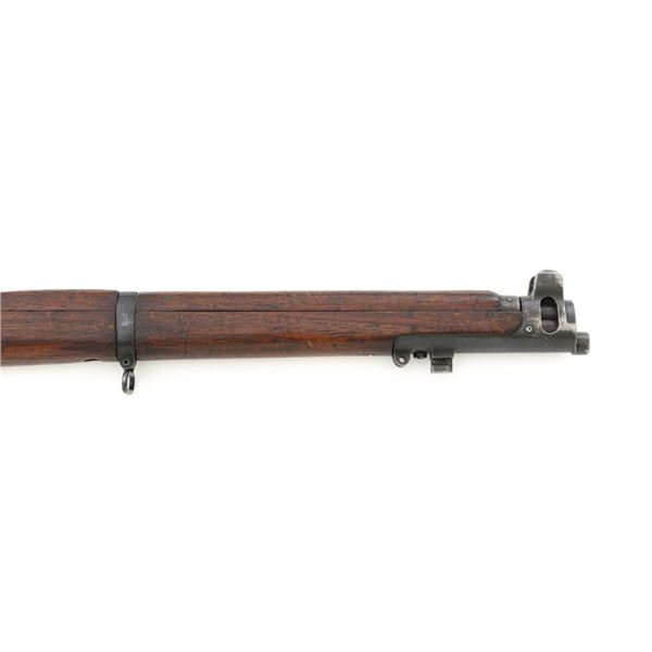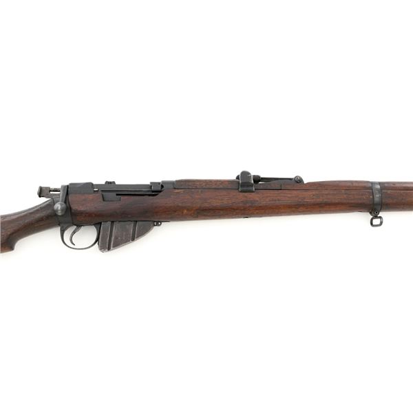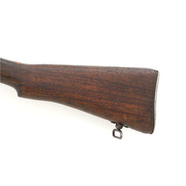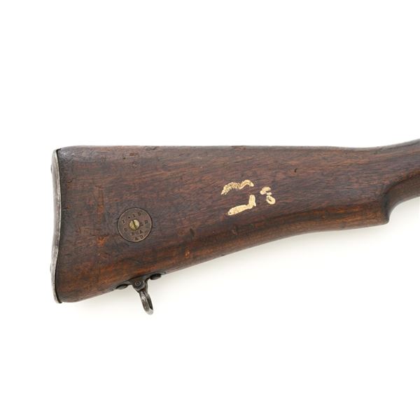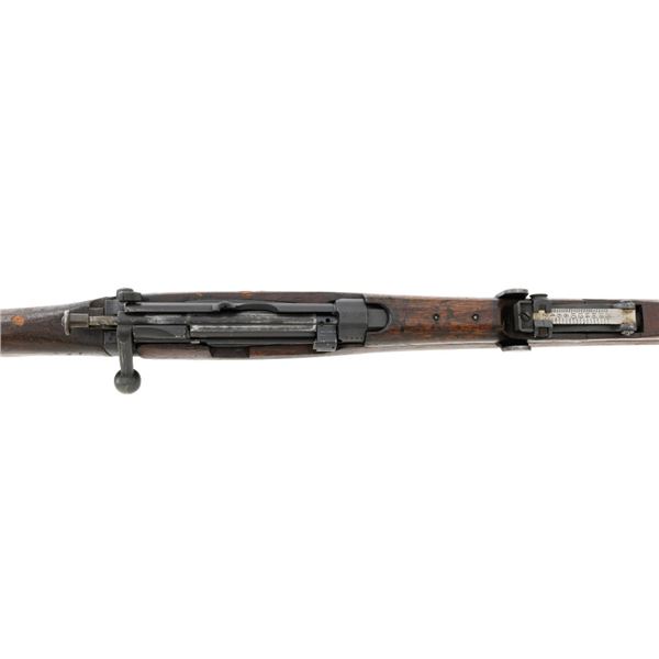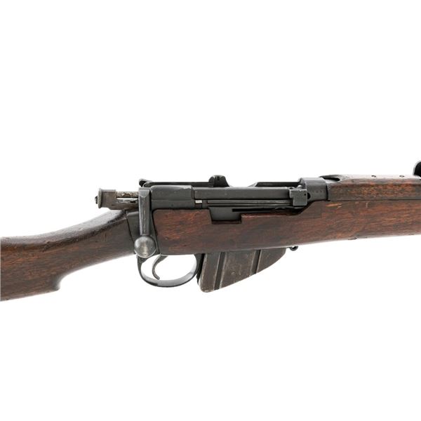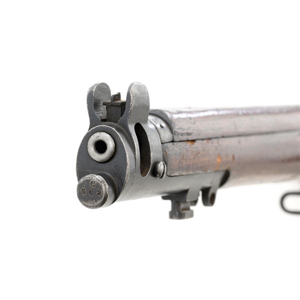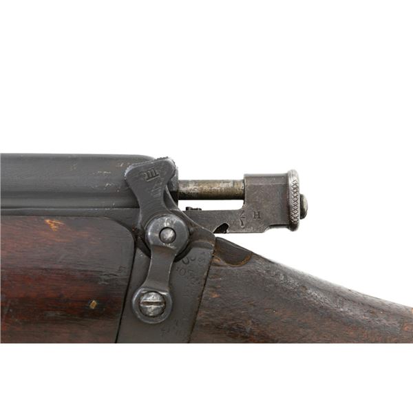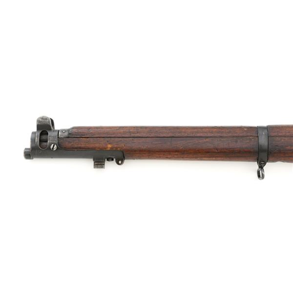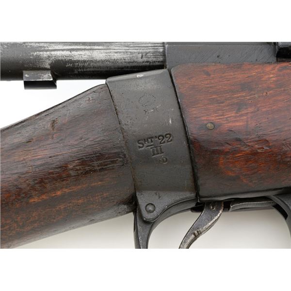 Early Mark III Lee Enfield Bolt Action Short Rifle, #1591, .22 rimfire cal., 25.2" barrel, blued finish, walnut stock set and handguard, blade front sight with protectors, and adjustable tangent rear sight with "U"-notched groove, graduated to 2000 yards. Rifle was arsenal built into a .22 cal. training rifle from a Converted II Lee Enfield service rifle with an early receiver. A .22 cal. barrel and bolt head (marked 22 No 2) with offset firing pin were fitted. The follower has been removed from the magazine. Right side of the action body marked with original "(Crown)/ER" over "SHT22/III/EFD". There are inspection stamps on the left side but the conversion markings have been removed. Right side of the buttstock disc is stamped "1.15/2 CD/RGA(Royal Garrison Artillery)/49" behind a painted Arabic rack number. Matching numbers on bolt handle and rear sight. Nose cap does not match. No visible import marks. Condition overall is very good, retaining approx. 65%-70% blue; showing wear, toning, and handling marks. Wood is good with handling marks, a few small chips, and impressions to the darkened finish. There is a spliced repair to right side of the forend. Action operates smoothly. Bore is bright with very good rifling. Est.: $800-$1,100. (C&R)