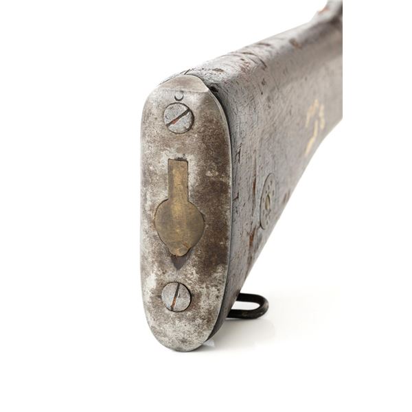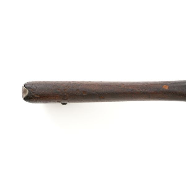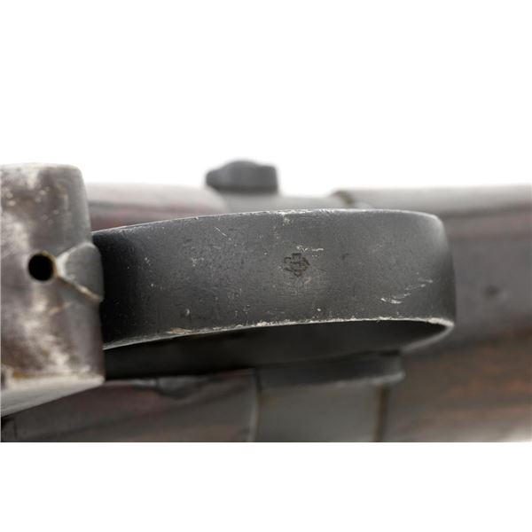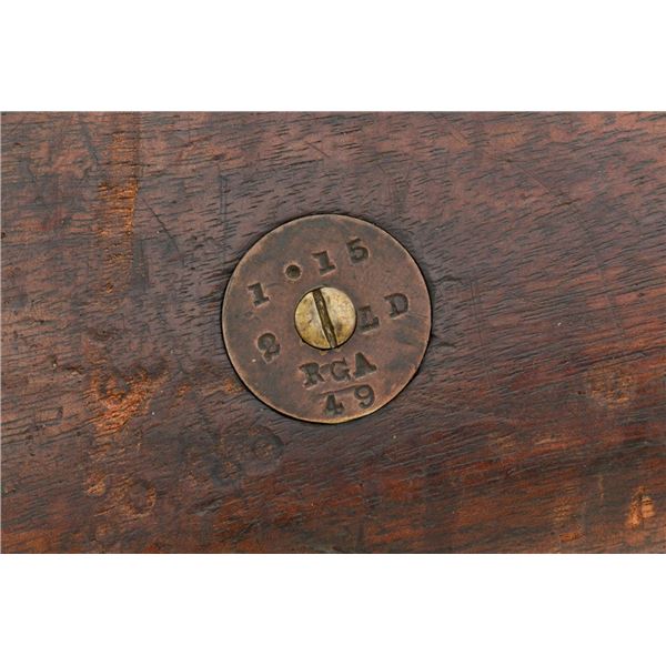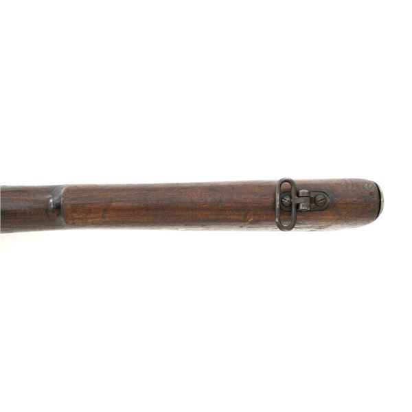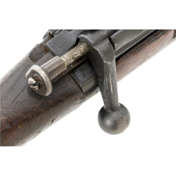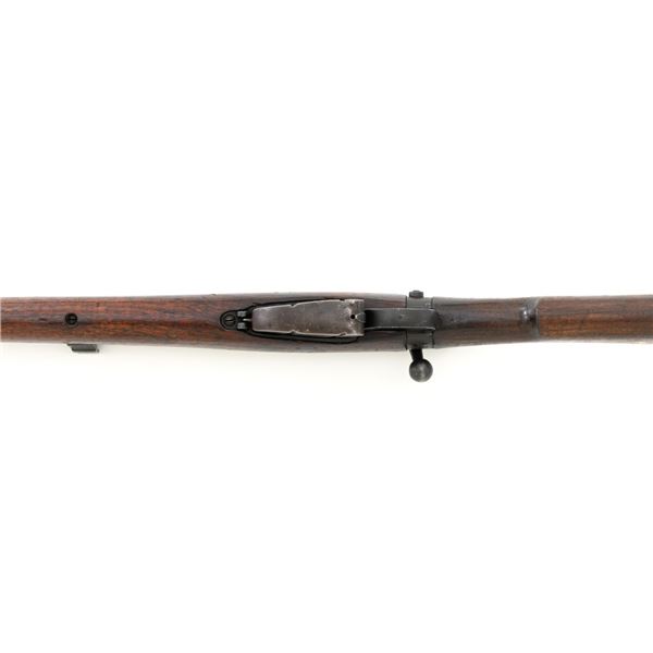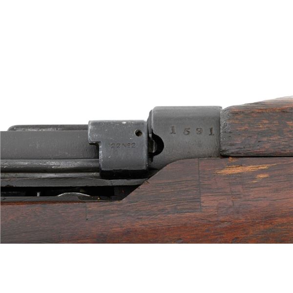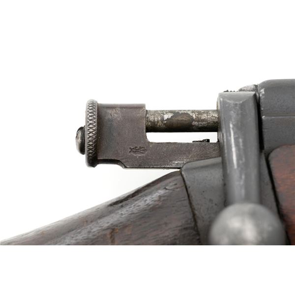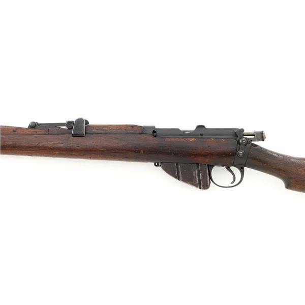 Early Mark III Lee Enfield Bolt Action Short Rifle, #1591, .22 rimfire cal., 25.2" barrel, blued finish, walnut stock set and handguard, blade front sight with protectors, and adjustable tangent rear sight with "U"-notched groove, graduated to 2000 yards. Rifle was arsenal built into a .22 cal. training rifle from a Converted II Lee Enfield service rifle with an early receiver. A .22 cal. barrel and bolt head (marked 22 No 2) with offset firing pin were fitted. The follower has been removed from the magazine. Right side of the action body marked with original "(Crown)/ER" over "SHT22/III/EFD". There are inspection stamps on the left side but the conversion markings have been removed. Right side of the buttstock disc is stamped "1.15/2 CD/RGA(Royal Garrison Artillery)/49" behind a painted Arabic rack number. Matching numbers on bolt handle and rear sight. Nose cap does not match. No visible import marks. Condition overall is very good, retaining approx. 65%-70% blue; showing wear, toning, and handling marks. Wood is good with handling marks, a few small chips, and impressions to the darkened finish. There is a spliced repair to right side of the forend. Action operates smoothly. Bore is bright with very good rifling. Est.: $800-$1,100. (C&R)