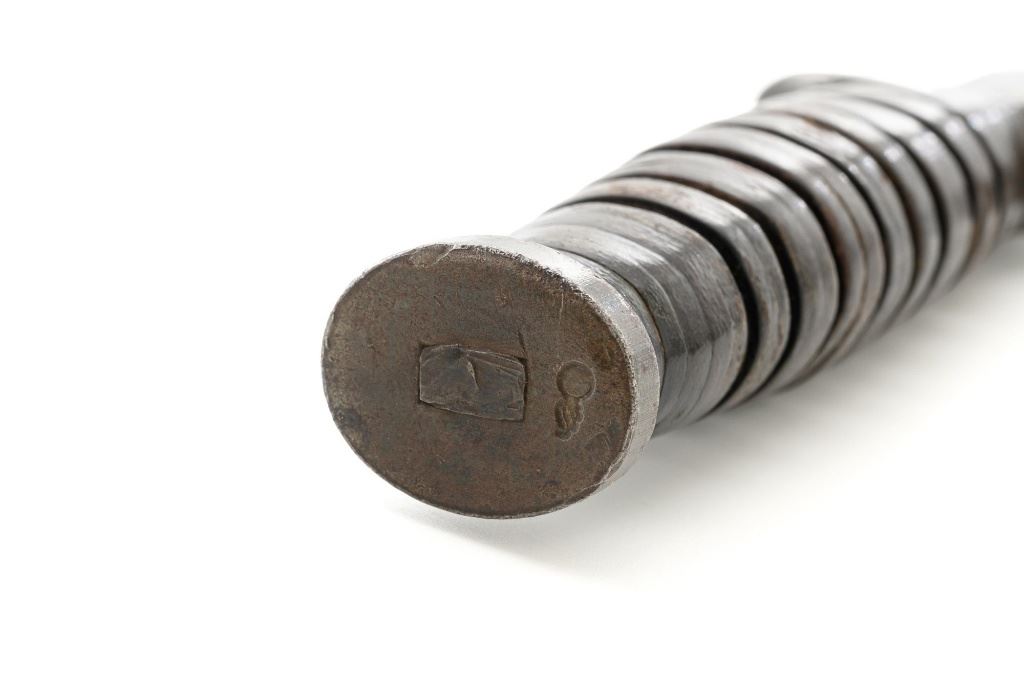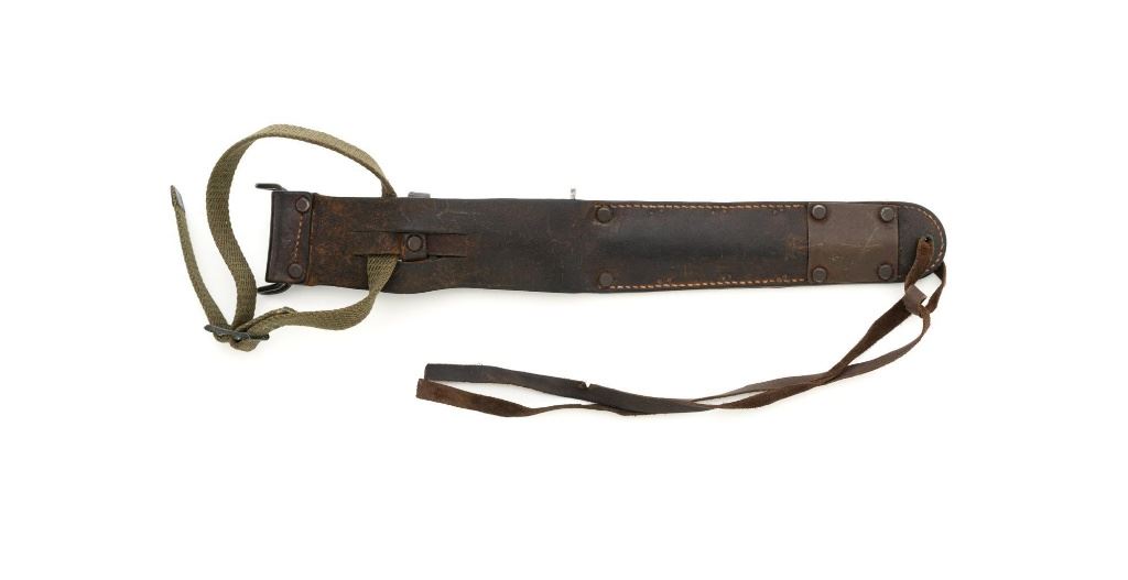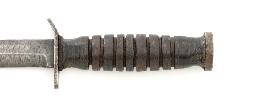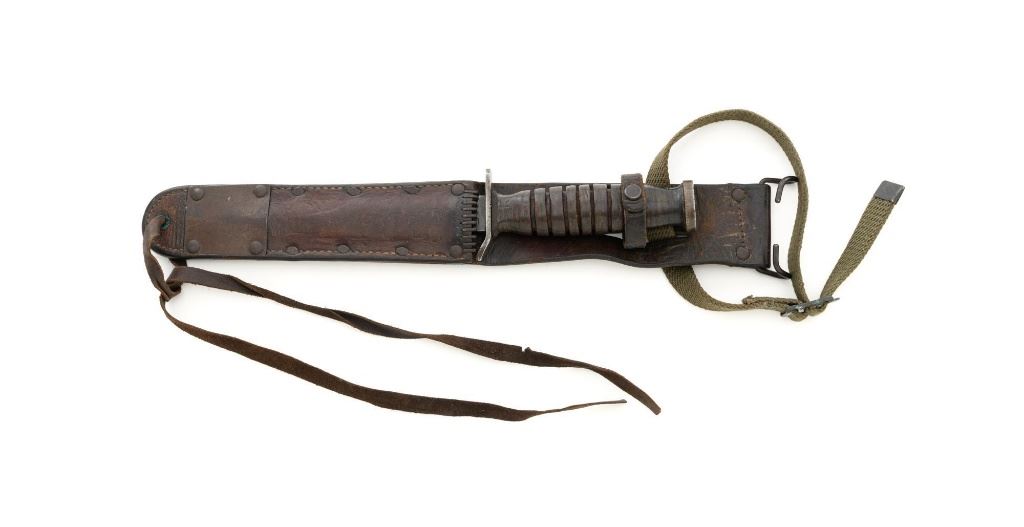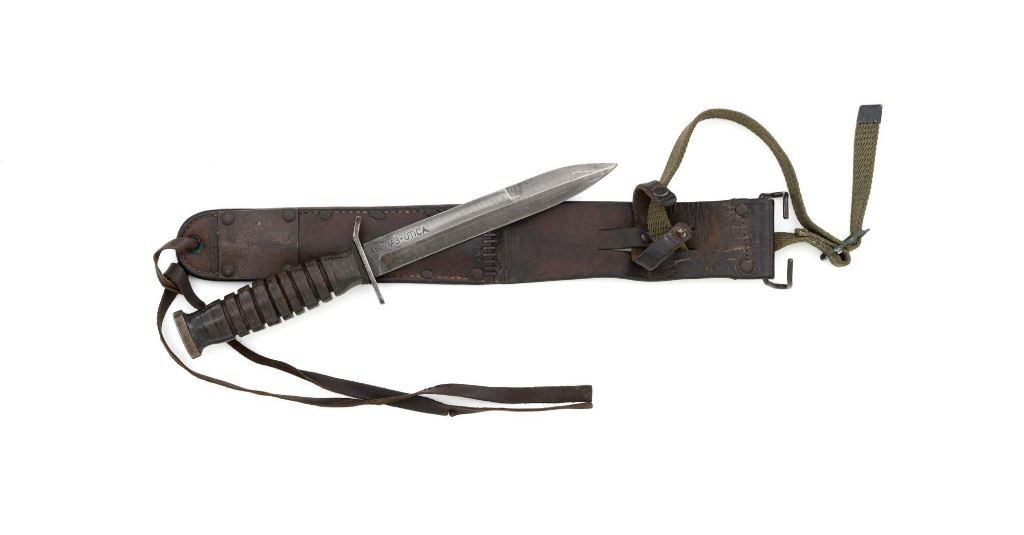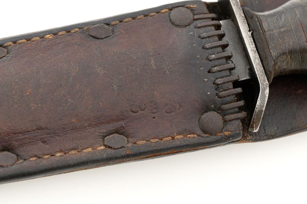 U.S. WWII Blade Marked Utica Cutlery U.S. M3 Trench Knife and Scabbard, with leather grooved grip, 7" parkerized blade is marked "U.S. M3-UTICA", and pommel is stamped with "(flaming ordnance bomb)". Leather scabbard is faintly marked "US M6/MOOSE CO/1943" with replacement leg strap. Knife is in good overall condition, with expected wear on the leather grip, with only light finish on the blade, which us full width and not nicked. Scabbard is also good, leather is smooth and supple. Est.: $750-$1,000.