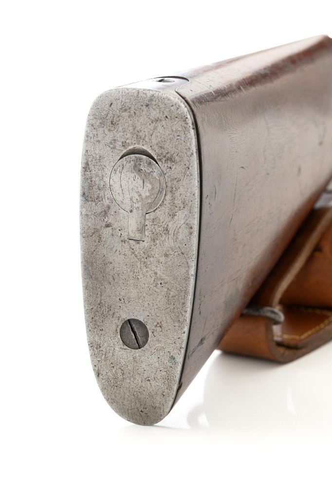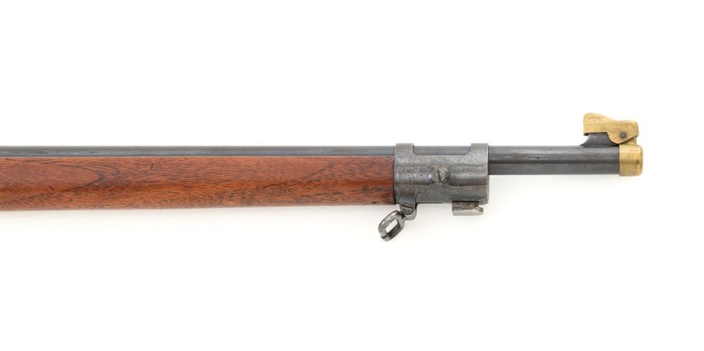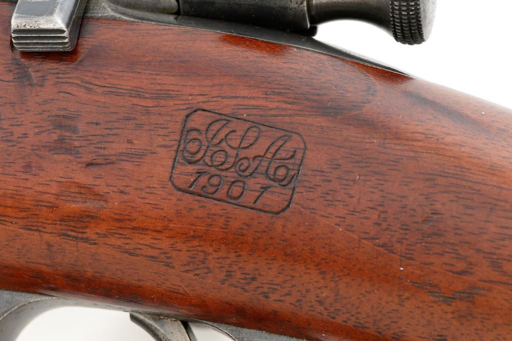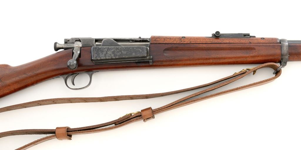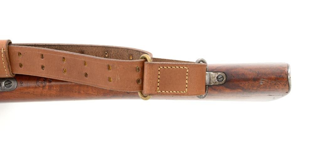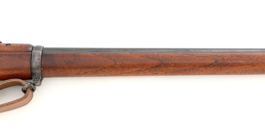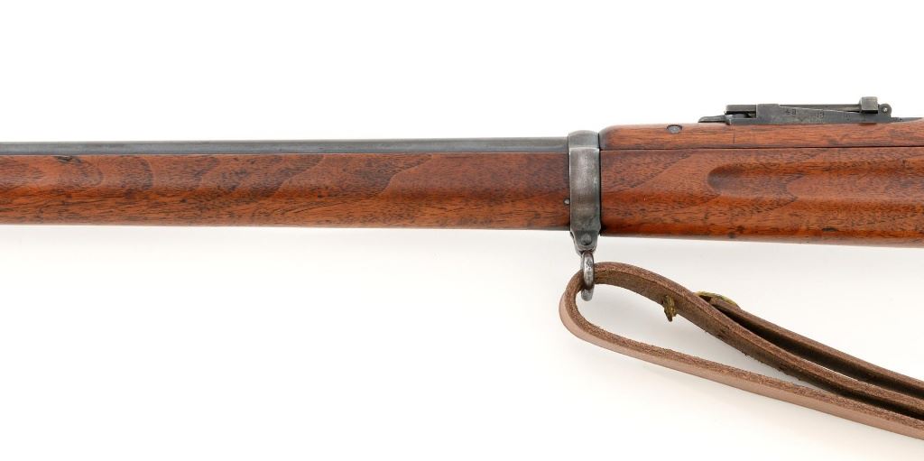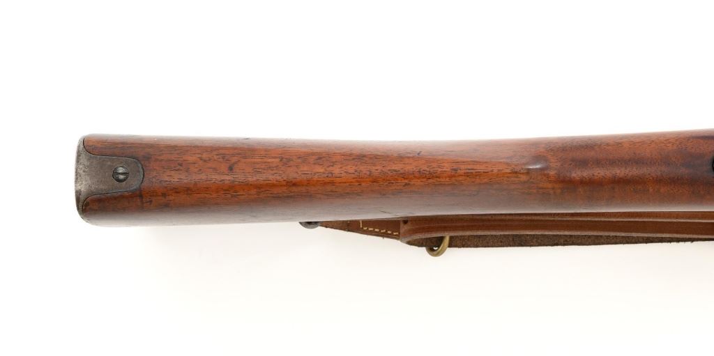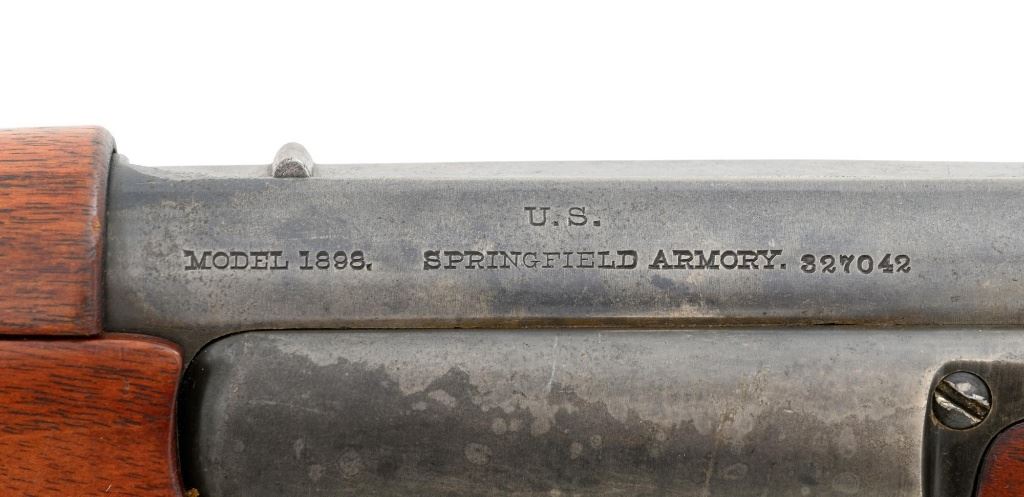 U.S. Springfield Armory Model 1898 Krag Bolt Action Rifle, #327042, .30-40 Krag cal., 30" barrel with brass muzzle cover, blued finish, walnut stock, blade front sight, and M1901 adjustable rear sight. A commercial leather sling is attached. Receiver is marked "U.S./MODEL 1898 SPRINGFIELD ARMORY 327042" on the left side. Rifle is in very good overall condition, retaining approx. 70% thinning and toning blue, mottled on the receiver, showing additional wear to the barrel band and buttplate. Stock has a boxed "JSA/1901" cartouche on the left side and a circled "P" behind the trigger guard. Stock is in very good condition, with scattered moderate dents and scratches. Three-piece cleaning rod is stored in the butttrap. Action works properly. Bore is very good with clearly defined rifling. A very collectible original rifle. Est.: $1,000-$1,500. (C&R)