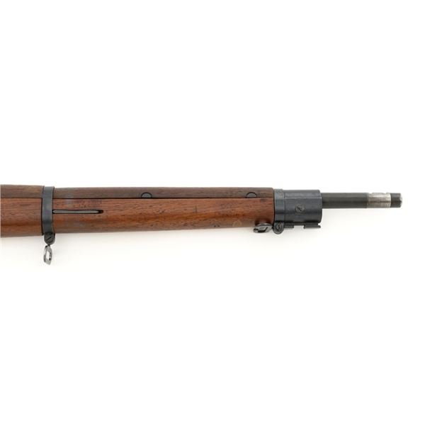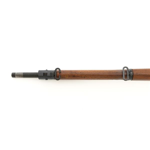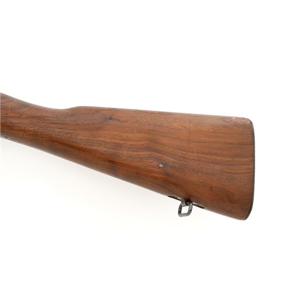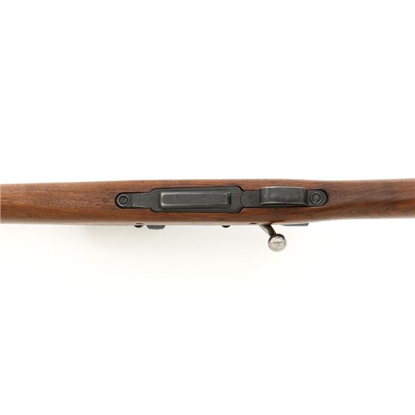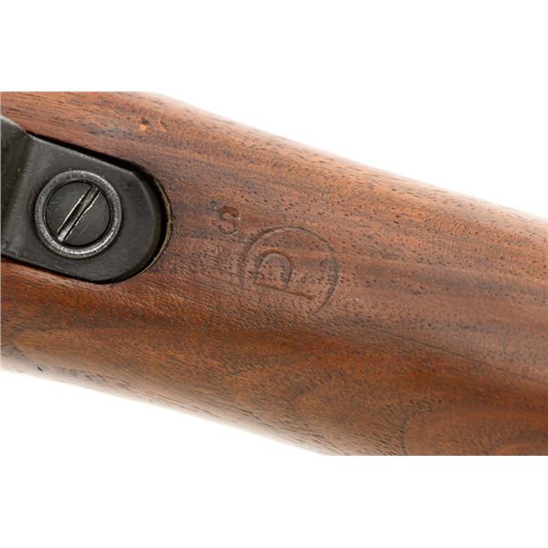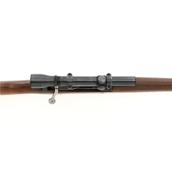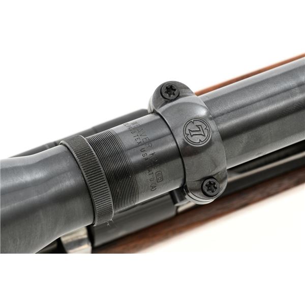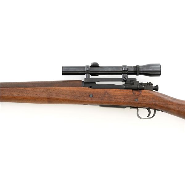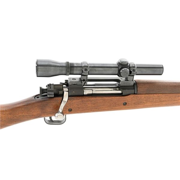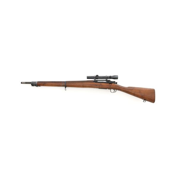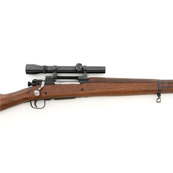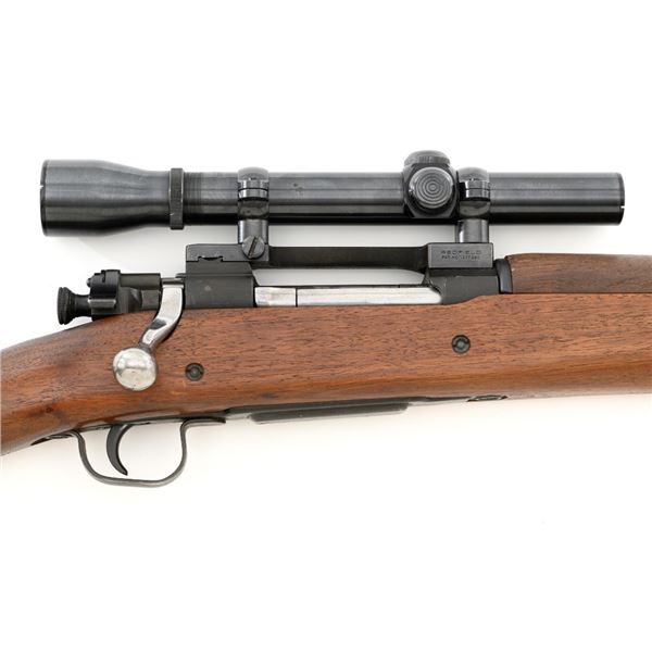 U.S. Remington Arms Model 1903-A3 Bolt Action Rifle, #3548462, .30-06 cal., 24" barrel, parkerized finish, bright bolt, walnut stock, no sights. Rifle was commercially made into a sniper rifle with some blued parts, and topped with a Redfield base and El Paso Weaver K2.5 scope with blued finish and fine crosshair reticle. Scope optics are clear, exterior shows moderate age and wear. Receiver marking is partially visible due to the scope mount. Barrel is marked "RA/(Flaming Bomb)/3-43" with a "P" underneath. Rifle is in fine overall condition, retaining approx. 85%+ reblued finish, with wear on the trigger housing and front of the barrel. Stock is a Smith-Corona with a boxed "FJA" (Lt. Col. Frank J. Atwood) cartouche and circled "P" behind the trigger guard. Stock is in very good condition, with wear mostly in front of the barrel band, and a channel was added for the bent bolt. Action works properly and has a replacement commercial safety. Four-groove bore is very good with clearly defined rifling. Est.: $1,000-$1,400. (C&R)