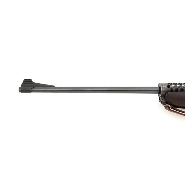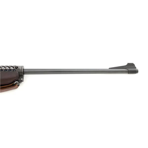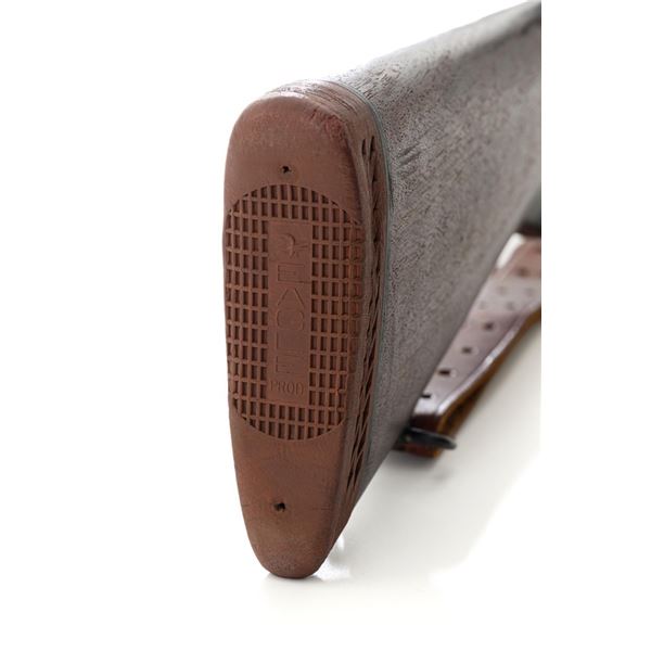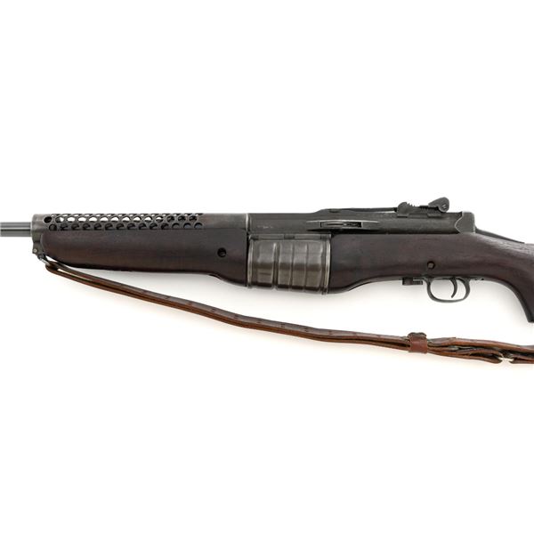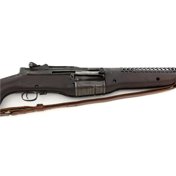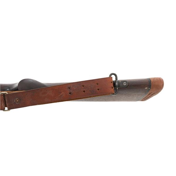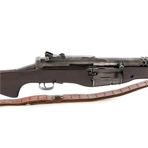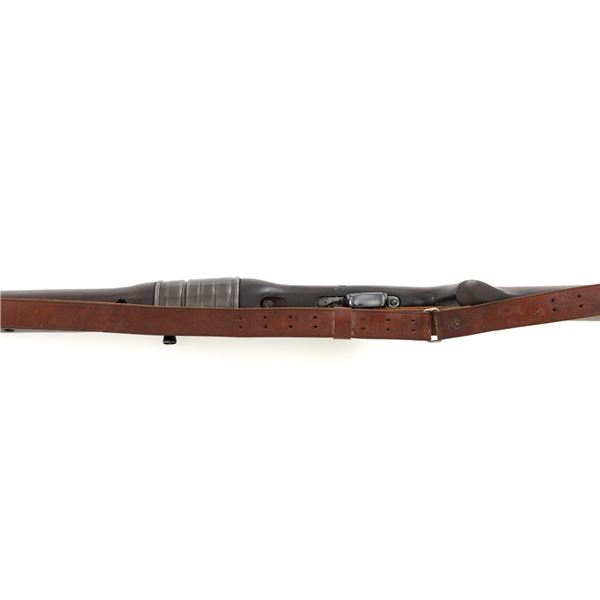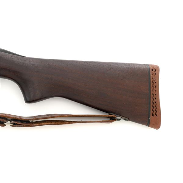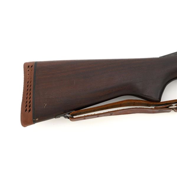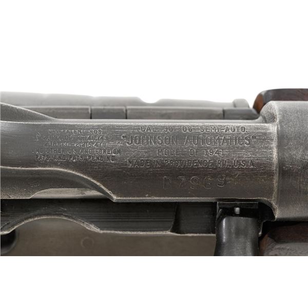 Johnson Automatics Model 1941 Semi-Automatic Rifle, #B7969, .30-06 cal., 24" barrel, parkerized with blued barrel, walnut stock, commercial front sight, and adjustable rear peep sight. A commercial leather sling is attached. Receiver is marked with "patent dates" next to "CAL. .30-06 SEMI-AUTO/"JOHNSON AUTOMATICS"/MODEL OF 1941/MADE IN PROVIDENCE R.I. U.S.A./B7969" / "CRANSTON/ARMS/CO." in a triangle on the right side. Top of the barrel is stamped "30-06". Rifle is in very good+ overall condition. Barrel has a commercial front sight and was blued, and retains most of its finish. Approx. 75%- 80% parkerized finish remains, showing general thinning and toning, with light patina to the magazine shroud. Trigger guard was also blued. Stock is in very good condition, showing normal light use, but the steel buttplate was replaced with a rubber recoil pad. Action works properly, but the bolt hold does not work, which is a common problem with Johnson rifles. Bore and rifling are good with light frosting. Est.: $3,000-$4,000. (C&R)