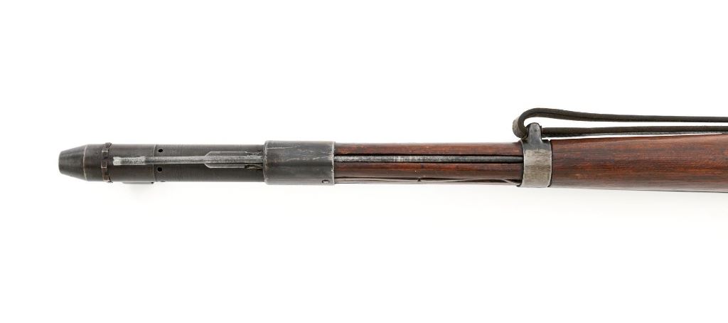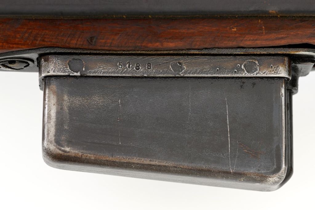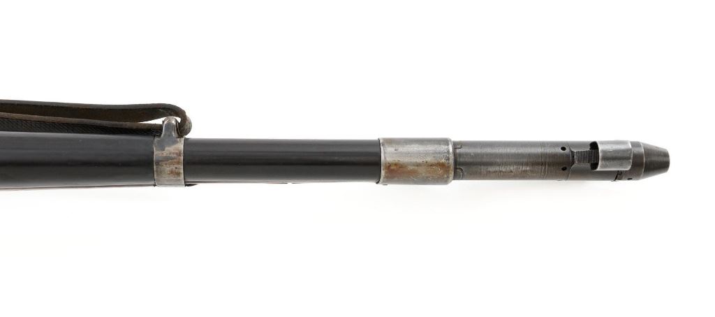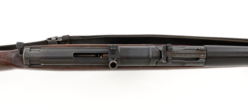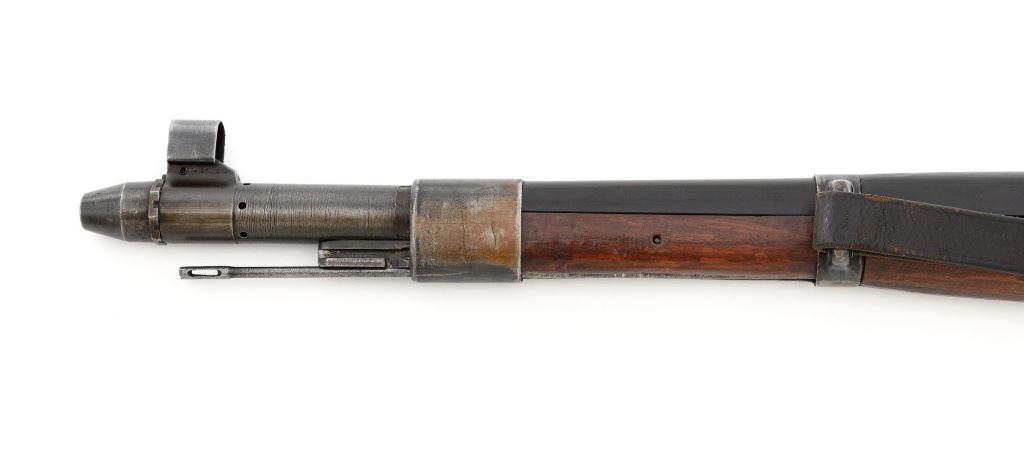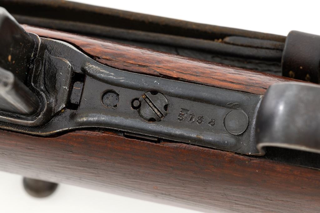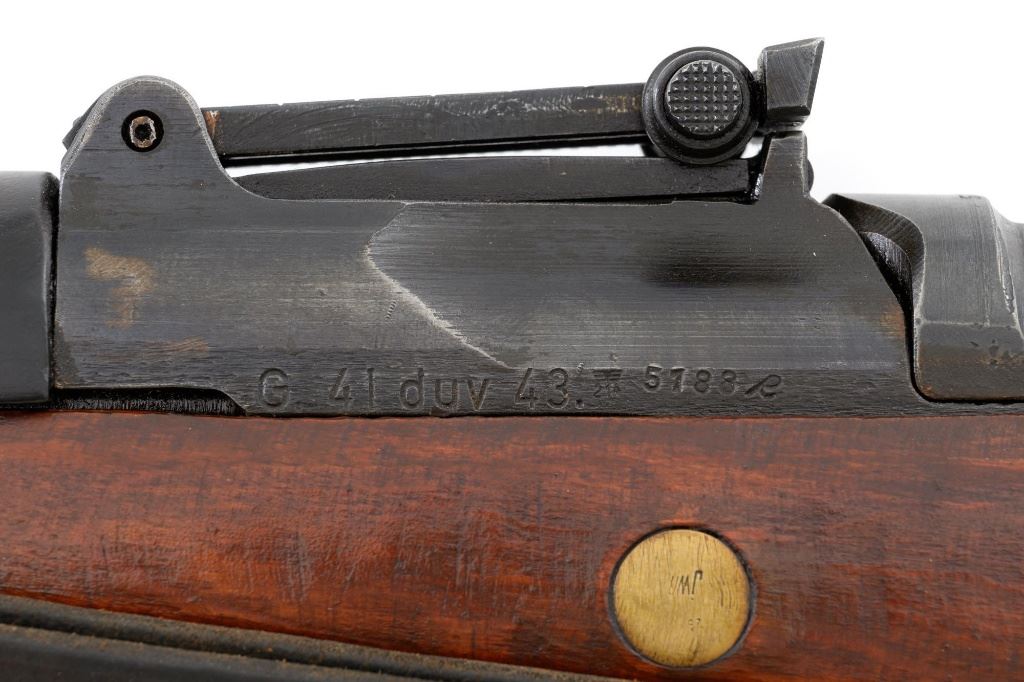 German Berlin Luebecker G41 Semi-Automatic Rifle, #5188R, 8x57mm cal., 23"barrel, blued finish, hardwood stock with cupped buttplate and plastic possibly "Durafol" handguard, blade front sight with attached hood, and adjustable tangent rear sight with "U"-notched groove, graduated to 1200 meters. Includes a steel cleaning rod and black leather sling. Sling is in good used condition, showing age and wear. Left side of the receiver is marked "G.41 duv 43./(eagle)214/5188e". There is an "(eagle)214" Waffenamt stamped on the rear bolt cover and bolt head. Bolt head and right side of the chamber with "(Nazi eagle)" firing proofs. Condition overall is very good, retaining approx. 70%-75% blue, with wear and toning to the gas trap, barrel bands, and magazine. Top of the receiver has been refinished. Stock is an old rough replacement, appearing unfinished, particularly around the pistol grip and buttplate. Condition is fair, wood shows light scratches and handling marks, with putty visible to the wrist and rear of the receiver. Handguard is in good condition, showing light scratches. Action operates smoothly. Bore has very good rifling. Est.: $2,000-$3,000. (C&R)