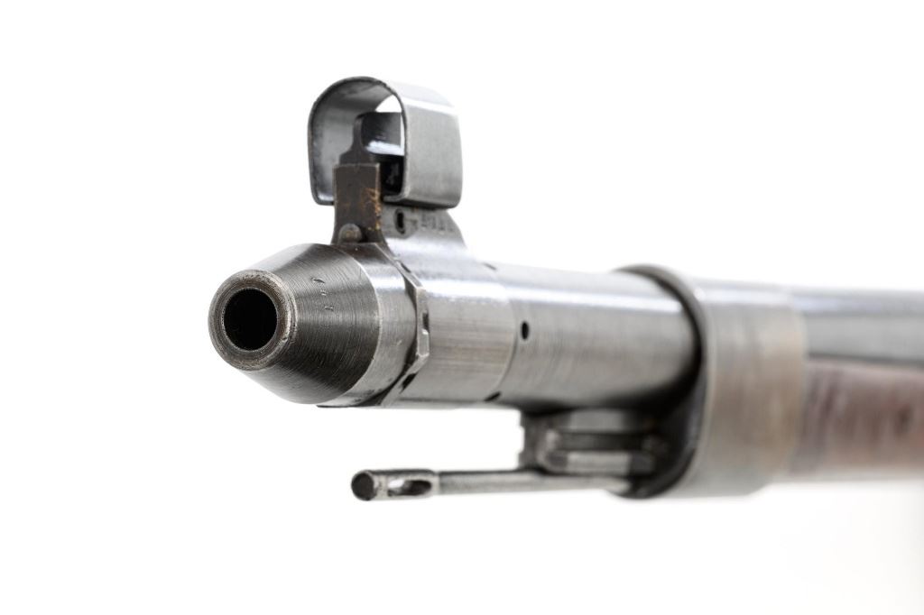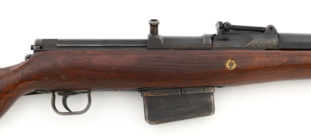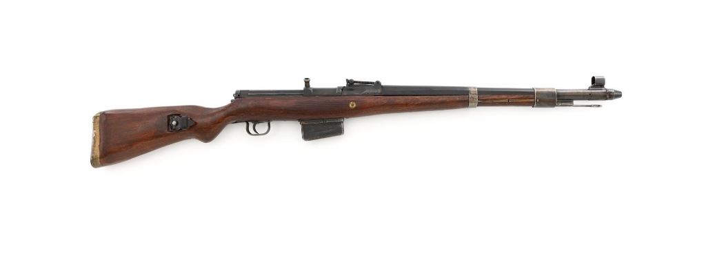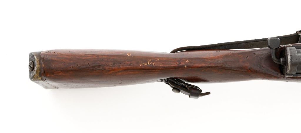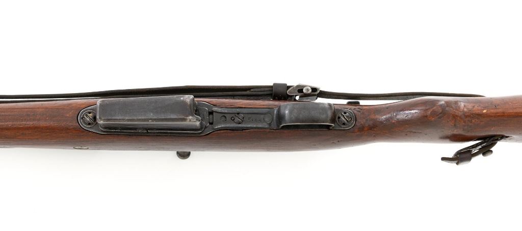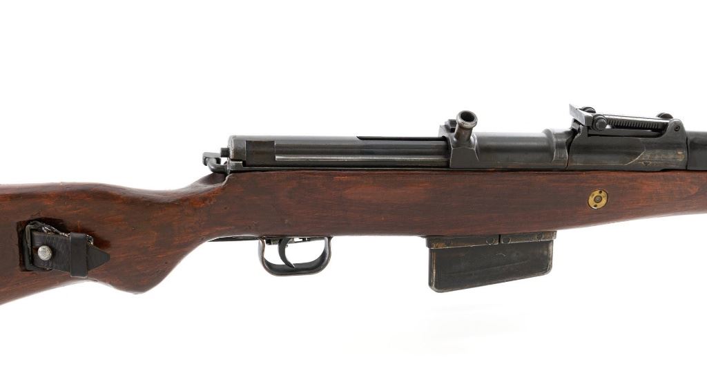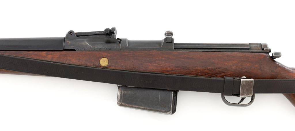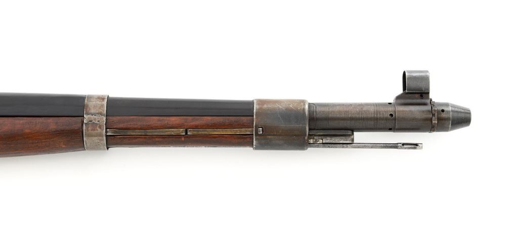 German Berlin Luebecker G41 Semi-Automatic Rifle, #5188R, 8x57mm cal., 23"barrel, blued finish, hardwood stock with cupped buttplate and plastic possibly "Durafol" handguard, blade front sight with attached hood, and adjustable tangent rear sight with "U"-notched groove, graduated to 1200 meters. Includes a steel cleaning rod and black leather sling. Sling is in good used condition, showing age and wear. Left side of the receiver is marked "G.41 duv 43./(eagle)214/5188e". There is an "(eagle)214" Waffenamt stamped on the rear bolt cover and bolt head. Bolt head and right side of the chamber with "(Nazi eagle)" firing proofs. Condition overall is very good, retaining approx. 70%-75% blue, with wear and toning to the gas trap, barrel bands, and magazine. Top of the receiver has been refinished. Stock is an old rough replacement, appearing unfinished, particularly around the pistol grip and buttplate. Condition is fair, wood shows light scratches and handling marks, with putty visible to the wrist and rear of the receiver. Handguard is in good condition, showing light scratches. Action operates smoothly. Bore has very good rifling. Est.: $2,000-$3,000. (C&R)